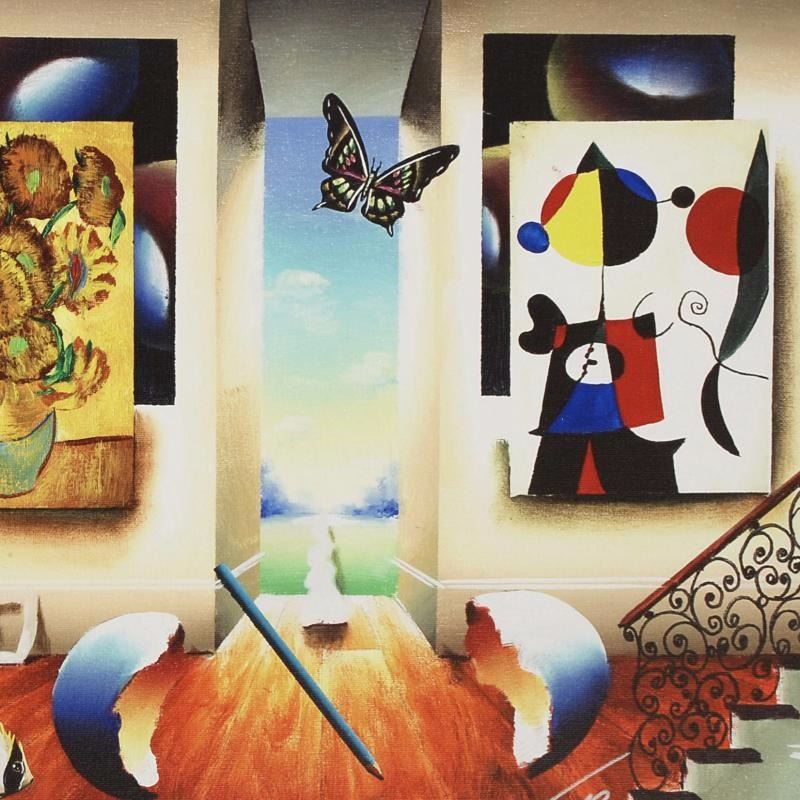 "Miro and Sunflowers" is a limited edition giclee on canvas, numbered and hand signed by Ferjo. Includes Certificate of Authenticity! Measures approx. 20" x 16" (image).