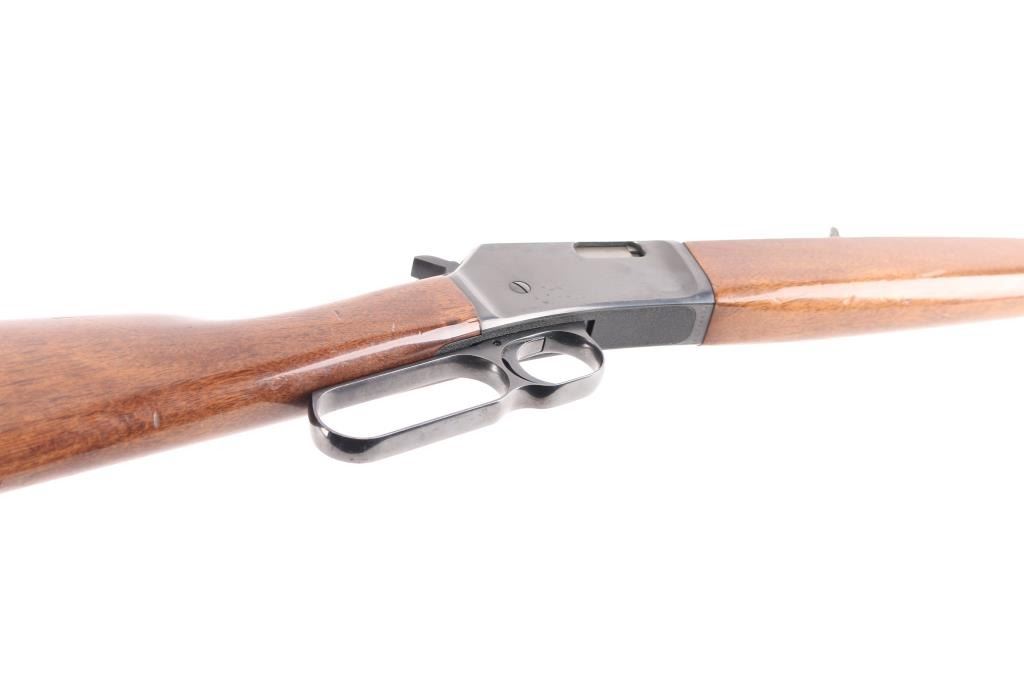 SN: 71B64859. Lever-Action rifle. Grade I, 15+1 capacity. Manufactured in Japan in 1971 by Miroku for Browning , Morgan, Utah, Montreal P.Q. 20" barrel with post/bead front, and dovetailed, adjustable folding rear sights. Full length tube magazine. Machined steel receiver. High polish blue. Gloss finished, smooth walnut stock, and forearm. Black plastic Browning buttplate. Smooth trigger. Receiver grooved for optics. the trigger stays with the triggerguard/lever when worked. Bore is excellent bright. Action is smooth/tight. The blue finish is about 85% with minor scratches/rubs, some finish loss on the bands and a small amount of scattered pin-prick pitting. Wood is good/sound with many minor scratches/dents.
