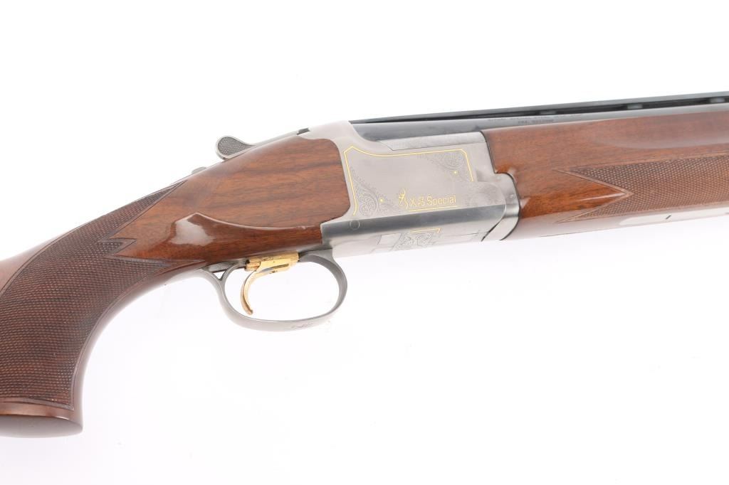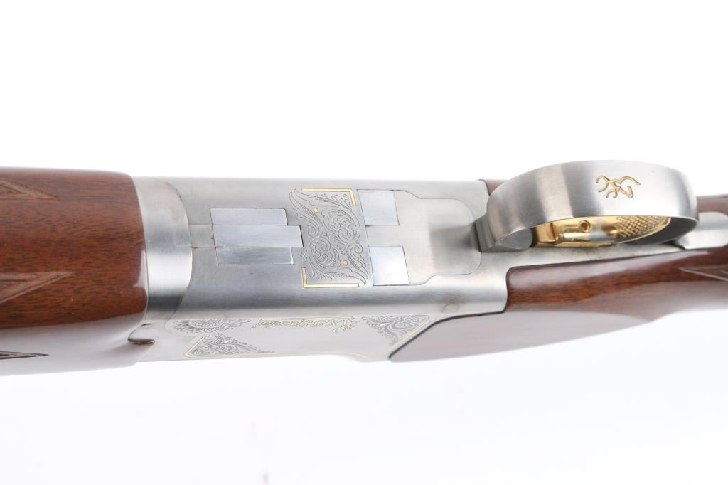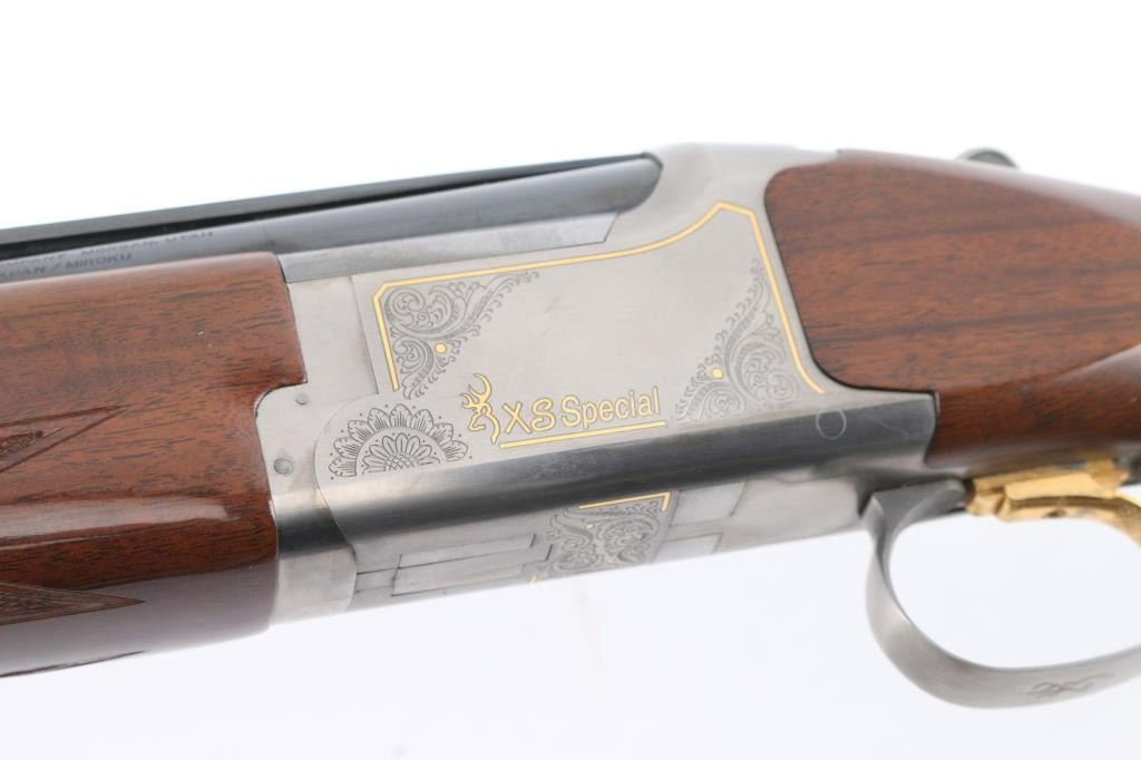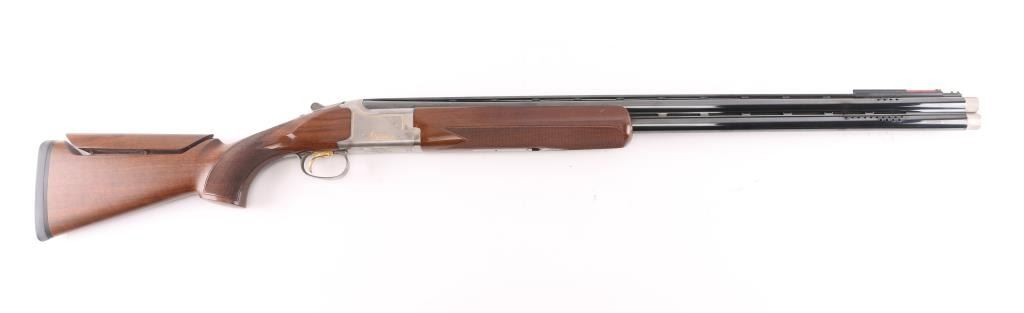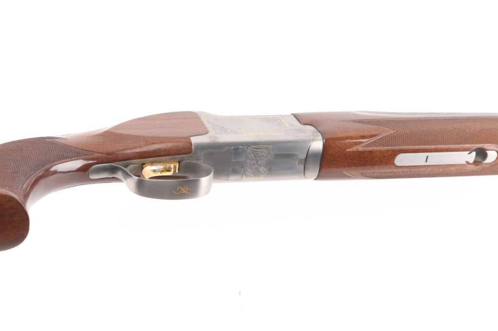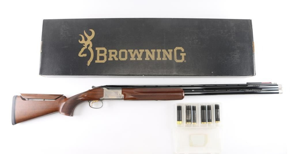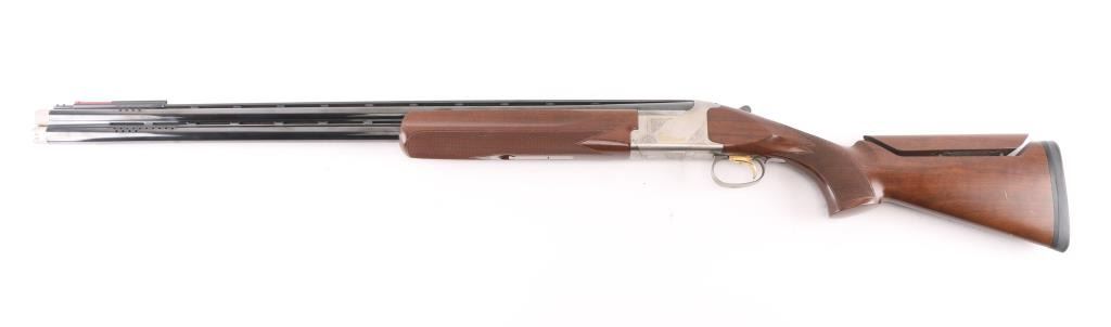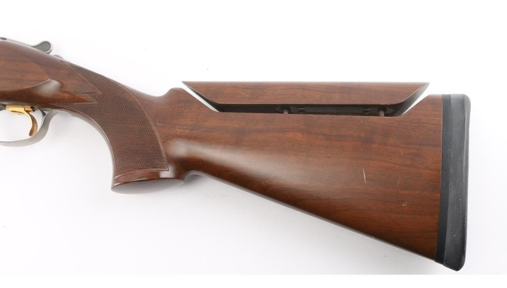 "XS Skeet" Grade 1 Over/Under shotgun made in Japan for Browning Arms Co, Morgan UT. Accepts 2-3/4" shells. Features high polished blue finish, engraved coin finished receiver with gold inlay, fancy figured walnut, checkered wrist & forend, adjustable comb, right handed palm swell at grip, 30" ported barrels, raised vent rib, screw-in chokes (extended LF/LF installed), fiber optic insert front sight, white polymer mid bead, added clip-on fiber optic front sight, solid rubber recoil pad, selective ejectors. Single inertia trigger (wide, checkered, gold accent) is selectable at tang safety. Bores are very good condition. Barrels retain 95% blued finish with minor handling marks. Coin finish is excellent. Wood is excellent condition with few observed blemishes. Approx stock measurements: 14-1/4" Length of Pull, 1-7/8" Drop at Comb (minimum), 1-7/8" Drop at Heel (minimum). Includes factory box with choke wrench, selection of choke tubes. Condition is NRA Excellent *** Modern Firearm ***