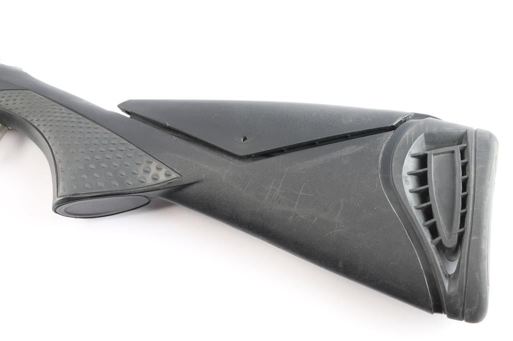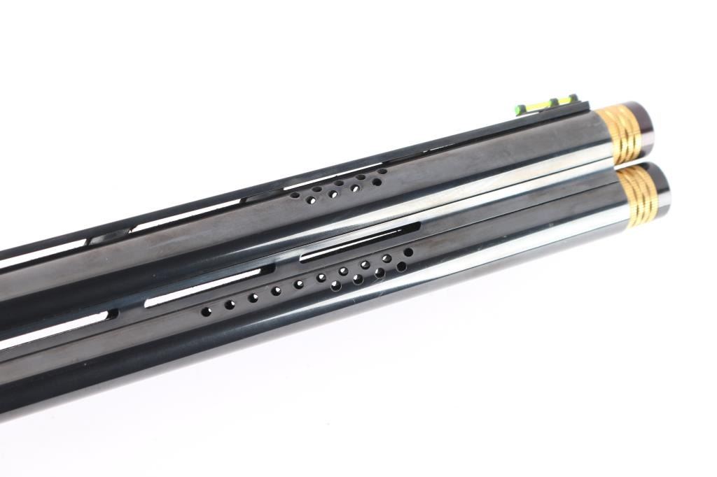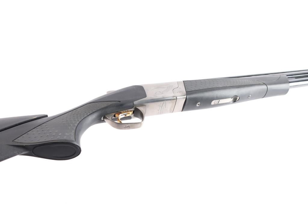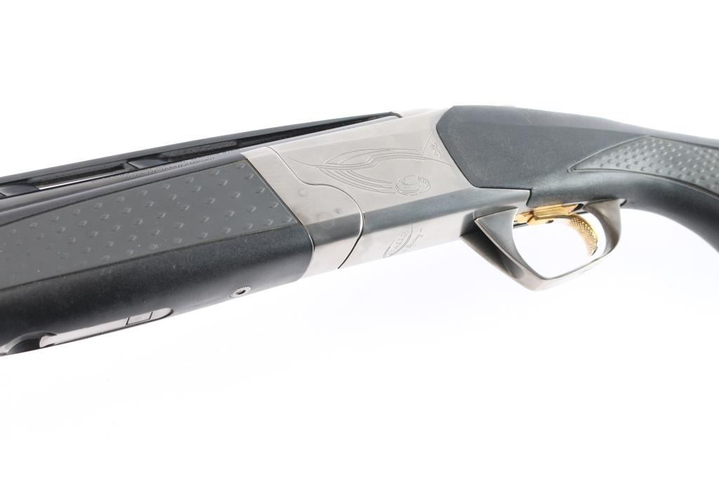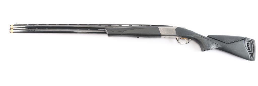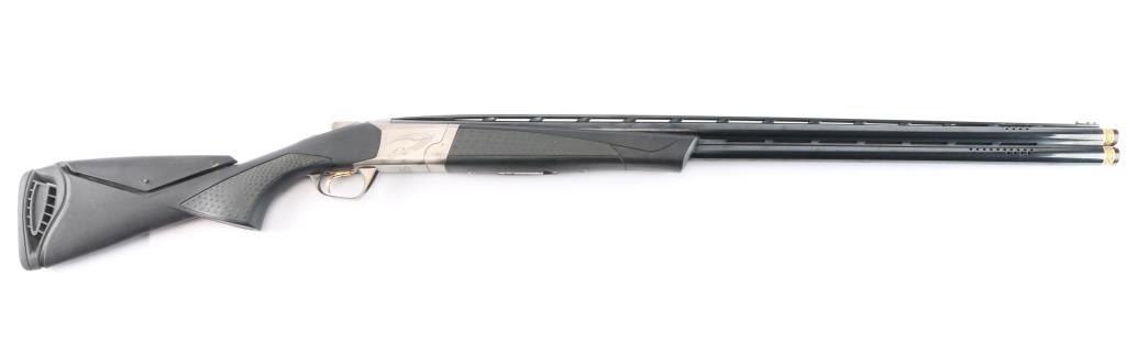 #03885MW132. Japanese over/under 12 gauge shotgun made by Miroku, imported by Browning Arms Company, Morgan UT. Markings indicate for 2.75" shells. Features 32" Invector Plus ported barrels that accept choke tubes, with ventilated rib, green fiber optic front and steel mid rib sights. Stock and forend are black composite with contrasting gray rubber textured, pebble grained panels at wrist and forend; adjustable cheek piece, and ventilated recoil pad. Receiver is stainless, with Cynergy logos engraved on the bottom; clay targets in flight on the sides. Browning Buck engraved on sides and inlaid with gold color on triggerguard bow. Adjustable trigger has color gold accent. Sliding tang safety/barrel selector. Installed choke tubes are marked "F" (Full) over "IC". Bores are excellent. Barrels are about 97% with a few minor scratches along sides and a few minor dings on edges of the top rib. Receiver is excellent. Stock is very good or better with minor scratches and rub marks from use. Manufactured 2004.