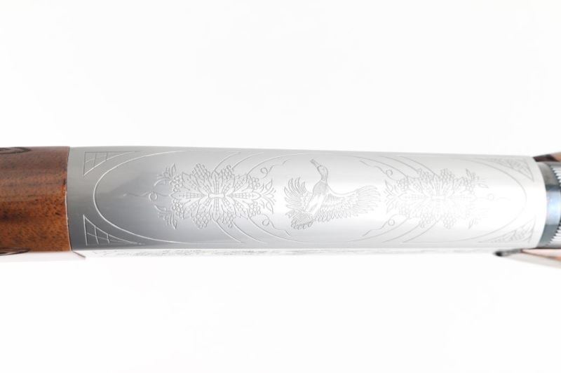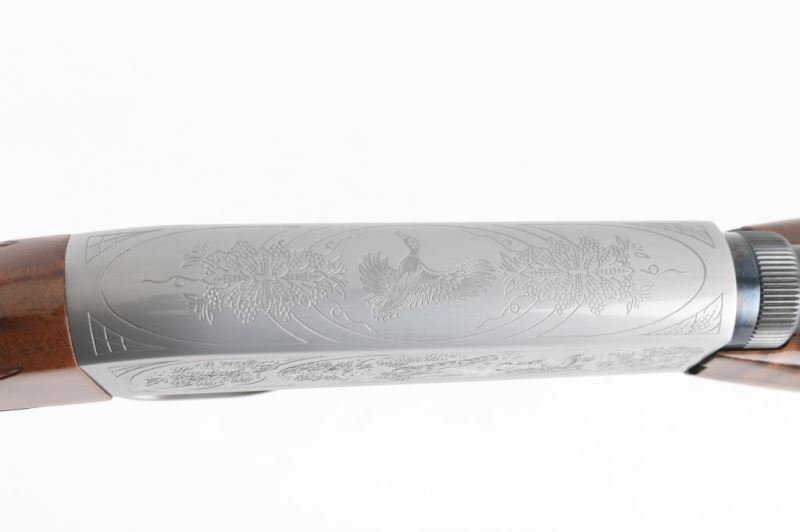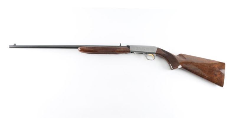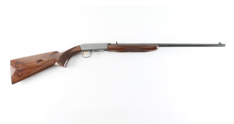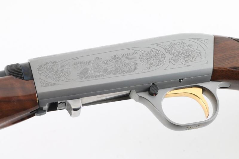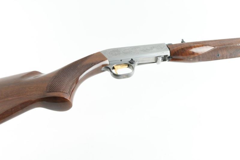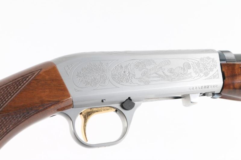 'Grade II' Made in Japan circa 2002. .22 Caliber Semi-Auto blowback operated tube fed rifle by Browning. Features a 21.5" blued take-down barrel, adjustable flip up rear sight, engraved French greyed receiver with squirrel, gopher, and duck motif, gold plate trigger, round tubular magazine & checkered select grade wood stock with metal butt plate. Bore looks very good. Finish on both barrel and receiver look great. Wood stocks look good but have a couple of tiny dings on the left side of the butt stock and there are matching surface scratches on both sides of the forend as if it had been leaning against something. Condition is NRA Very Good ***Modern Firearm***