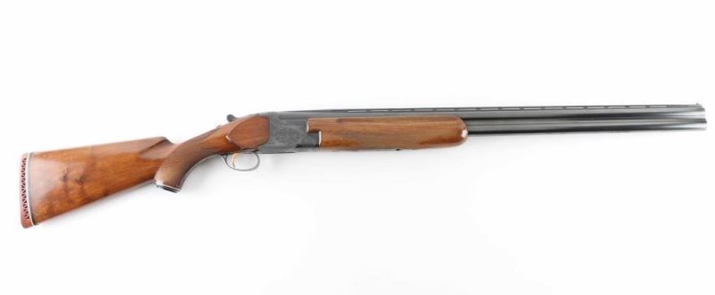 SN: M169921 Shotgun, O/U. Japanese made. 28" barrels, with 2 sighting beads, and ventilated rib. 2 3/4" chamber (marked 70mm underneath). Fixed chokes marked '+' over '+-', measure F/IM using a gauge. Selective trigger, and ejectors. Tang safety. Gold tone trigger. Bore appears excellent/bright. Chambers are dirty. Barrels lock up tight. Blued finish is about 90%, with minor scratches/rubs. Some finish loss to the lower tang. Receiver/triggerguard are etched with a floral pattern. Are markings are crisp/clear. Laminated, checkered forearm, and pistol grip stock are good, with scratches/dings. Pachmayr recoil pad, and cap with Black & White spacers.