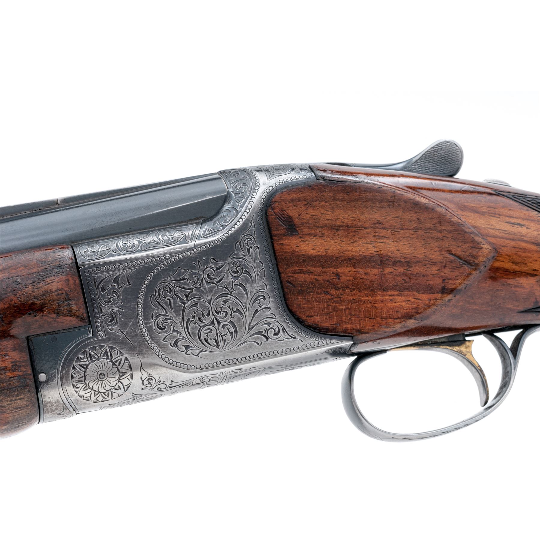 Miroku Firearms Over/Under Shotgun, #544988. 12 ga. 26'' vent rib barrels have 2-3/4'' chambers and are choked Mod./IM. Boxlock action is similar to a Browning Citori and features inertia-bloc single selective trigger, non-auto safety and selective ejectors. Beavertail forend and pistol-grip buttstock are of straight grain walnut with Whiteline grip cap and Pachmayr recoil pad. Receiver is extensively engraved in a scroll pattern. Mfg'd approx. 1970s. Condition is good with extensive loss of blue to receiver due to carrying, and numerous handling marks to wood. Action functions correctly, is somewhat loose but locks tight; bores are bright. Est.: $400-$500. (Modern)