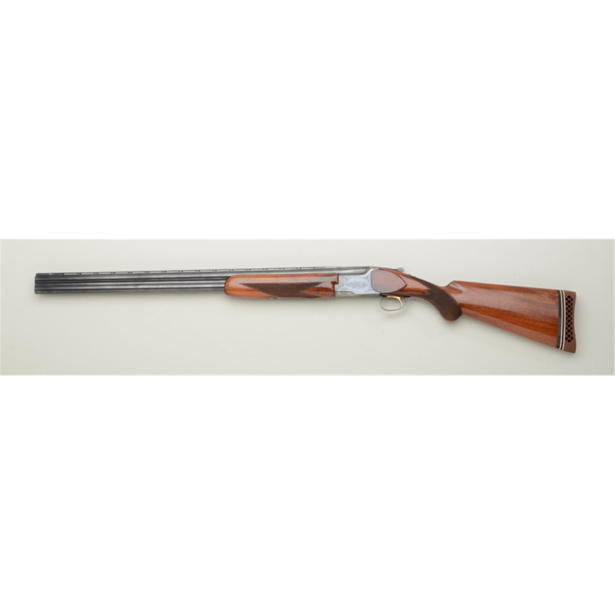 Miroku over and under 12 gauge shotgun, similar to Browning, 28" barrels, vent rib, auto ejector, single trigger. Serial #393167. Very good used condition, 75-85% blue, normal wear, recoil pad added, 13-1/4"to the end of the wood stock, and 15" to the end of the pad. Choked full and modified. Miroku currently manufactures most of the high grade Brownings, Winchesters and other arms. Est: $200 - $400
