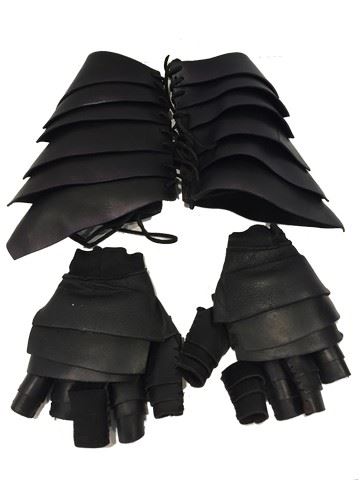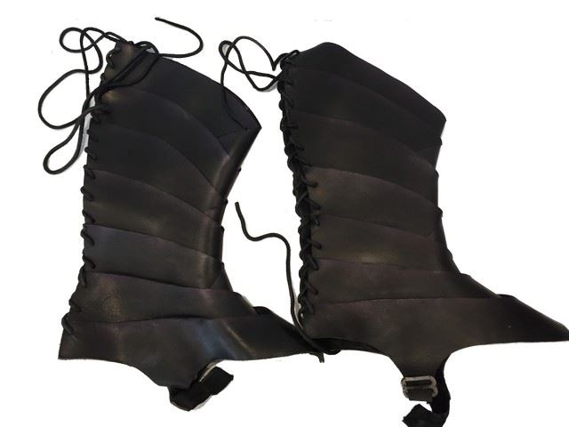 Stilt Performer (Peter Seaborn) screen worn, black leather boot protectors, lace up the back layered boot and foot covers, with shin and glove included. (15"x12")