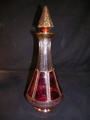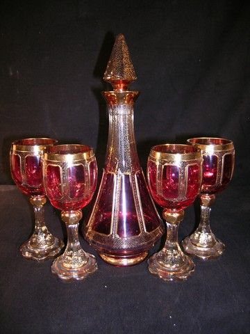 Mirror Mirror (2012) - Ornate gold and rose colored goblet and carafe serving set, laced with intricate leaf design. (Carafe 14" high, 6" diameter, Goblets 8" high, 3" diameter). Oversized item. Additional postage required.