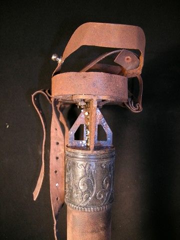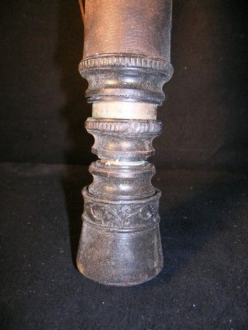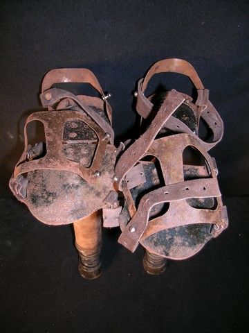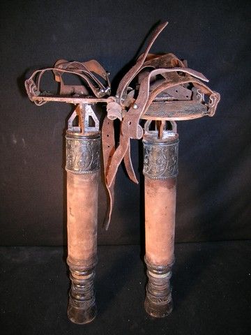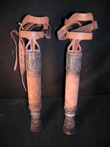 A pair of hero Dwarf Stilts from the 2012 fantasy-adventure Mirror Mirror. The stilts are made with metal legs wrapped in leather, with support straps on the metal foot pieces. The legs extend in two places, from a length of 19" to a full length of 32". This is a prop version only and not safe to use or wear. (Foot piece measures approx. 8" x 4"). Oversized item. Additional postage required.