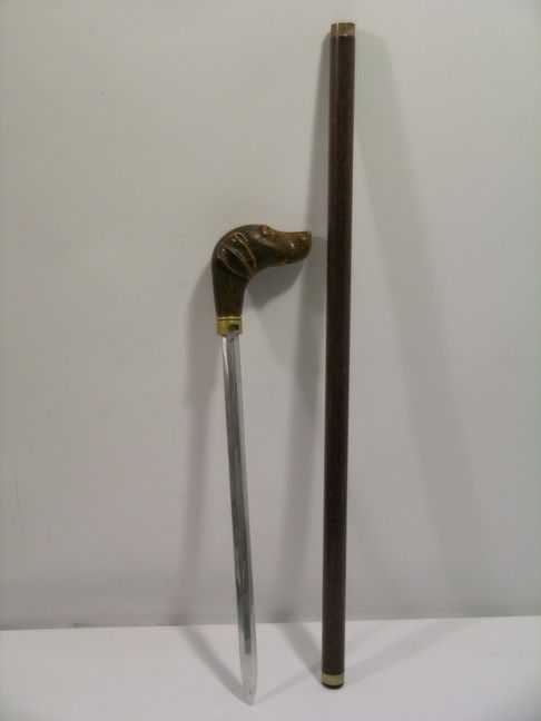 A screen used cane from the 2012 fantasy film 'Mirror Mirror.' The cane was used by the Dwarf Napoleon (Jordan Prentice) and is fashioned from wood and plastic material. The cane features a plastic dog head handle, which opens to reveal a hidden steel sword blade. Blade is somewhat pointy but not very sharp. A very well made prop from this magical film. (measures approx. 27 1/2" long). Oversized item. Additional postage required.