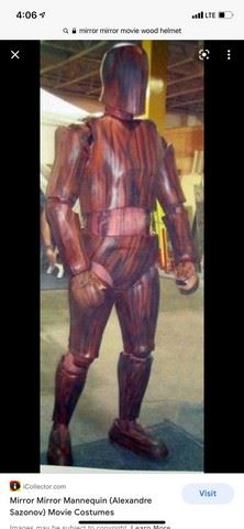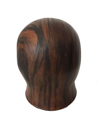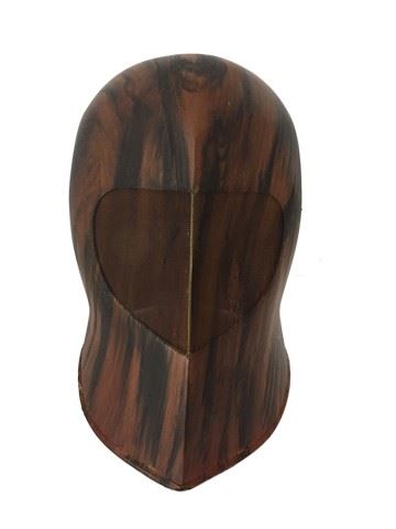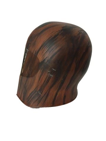 Mannequin (Alexandre Sazonov) screen worn, helmet with mesh over eyes, made of a brown and black wood pattern. (14"x10")
