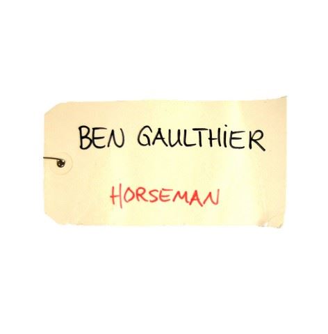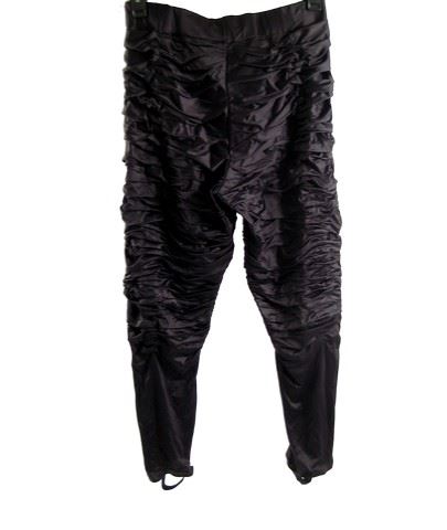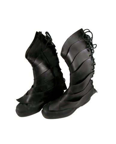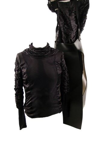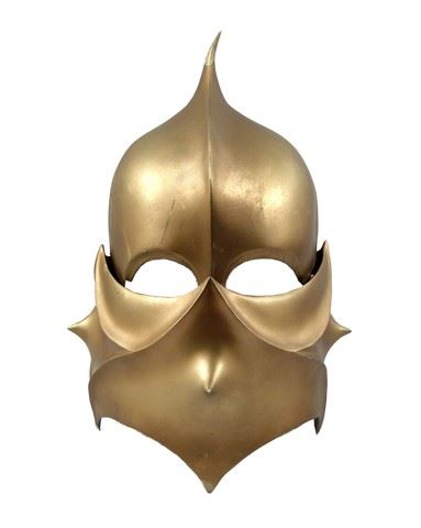 Stunt Rider: Guard (Ben Gauthier) black leather, shoulder pads, chest and back plates with ties on the side, custom armor, black leather with shoulder straps custom made bottom armor, black with ruffled sleeves custom top, black ruffle custom bottoms, gold helmet, black with partial facial cover, ruffle at the bottom head piece, black with leather fingers gloves, black leather wrist armor, black leather foot armor, and black leather slip on boots. Includes wardrobe tag! Oversized costume. Additional postage required.