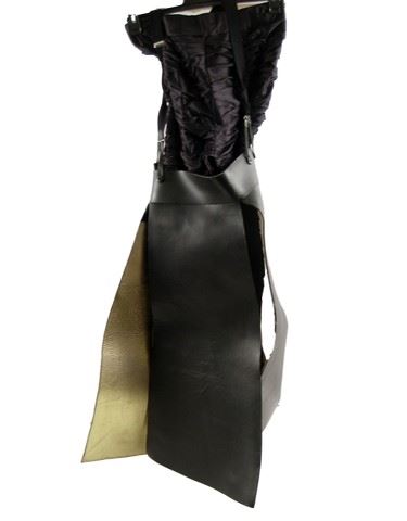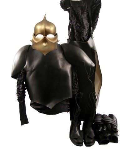 Stunt Rider: Guard (Ben Gauthier) black leather, shoulder pads, chest and back plates with ties on the side, custom armor, black leather with shoulder straps custom made bottom armor, black with ruffled sleeves custom top, black ruffle custom bottoms, gold helmet, black with partial facial cover, ruffle at the bottom head piece, black with leather fingers gloves, black leather wrist armor, black leather foot armor, and black leather slip on boots. Includes wardrobe tag! Oversized costume. Additional postage required.