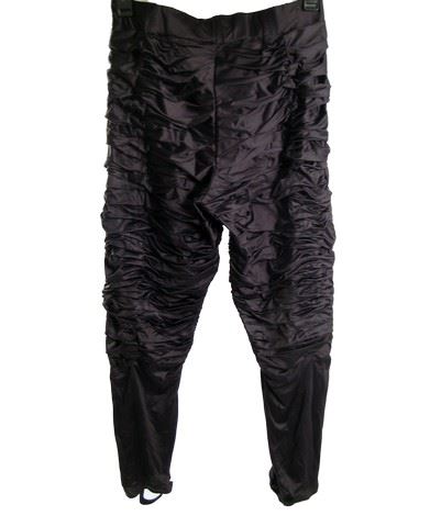 Stunt Rider: Guard (Ben Gauthier) black leather with shoulder straps custom made bottom armor, black with ruffled sleeves custom top, black ruffle custom bottoms, and black with partial facial cover.