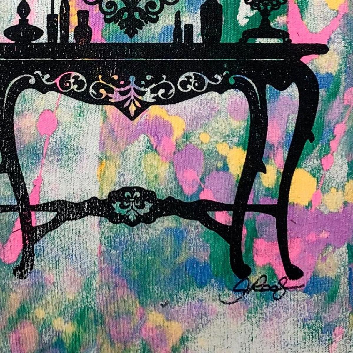 Mirror Mirror (Tink) by Rodgers Original. "Mirror Mirror (Tink)" is an original hand pulled silkscreen and acrylic painting on canvas by Gail Rodgers. Hand signed by the artist, the piece comes with a letter of authenticity. This piece is meant to be gallery wrapped and measure approximately 23" x 23" and image dimensions (after stretching) 16" x 16" (image).