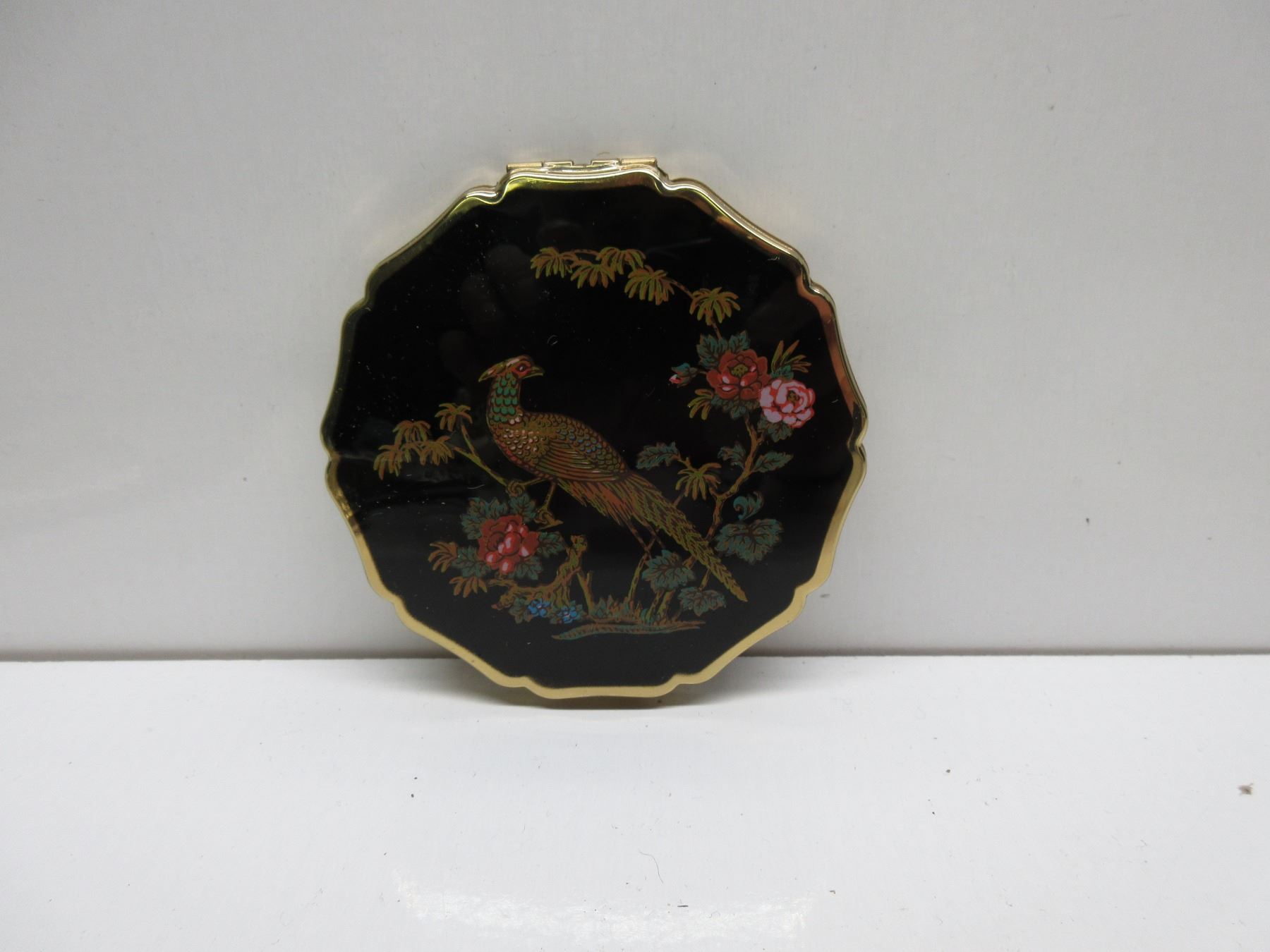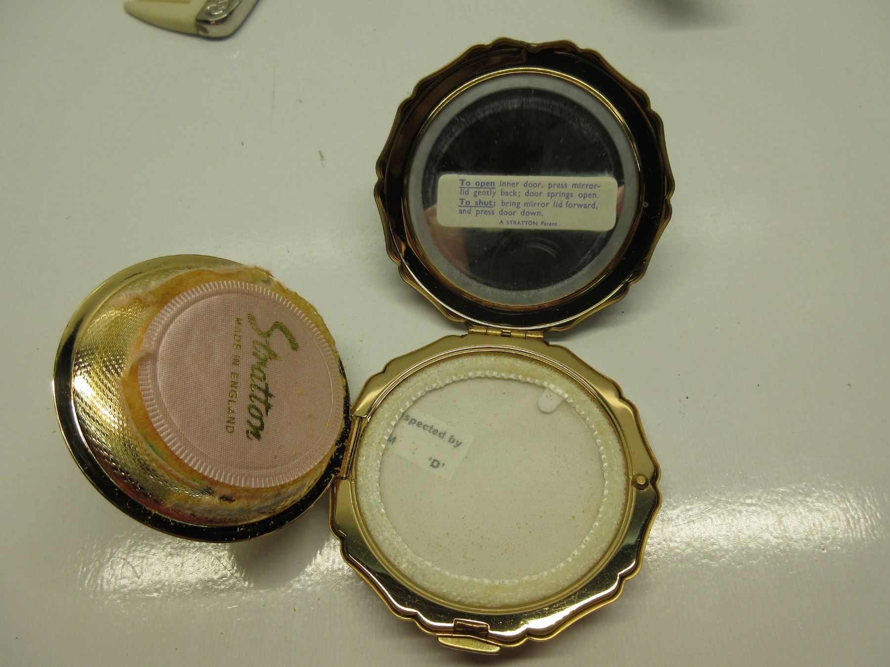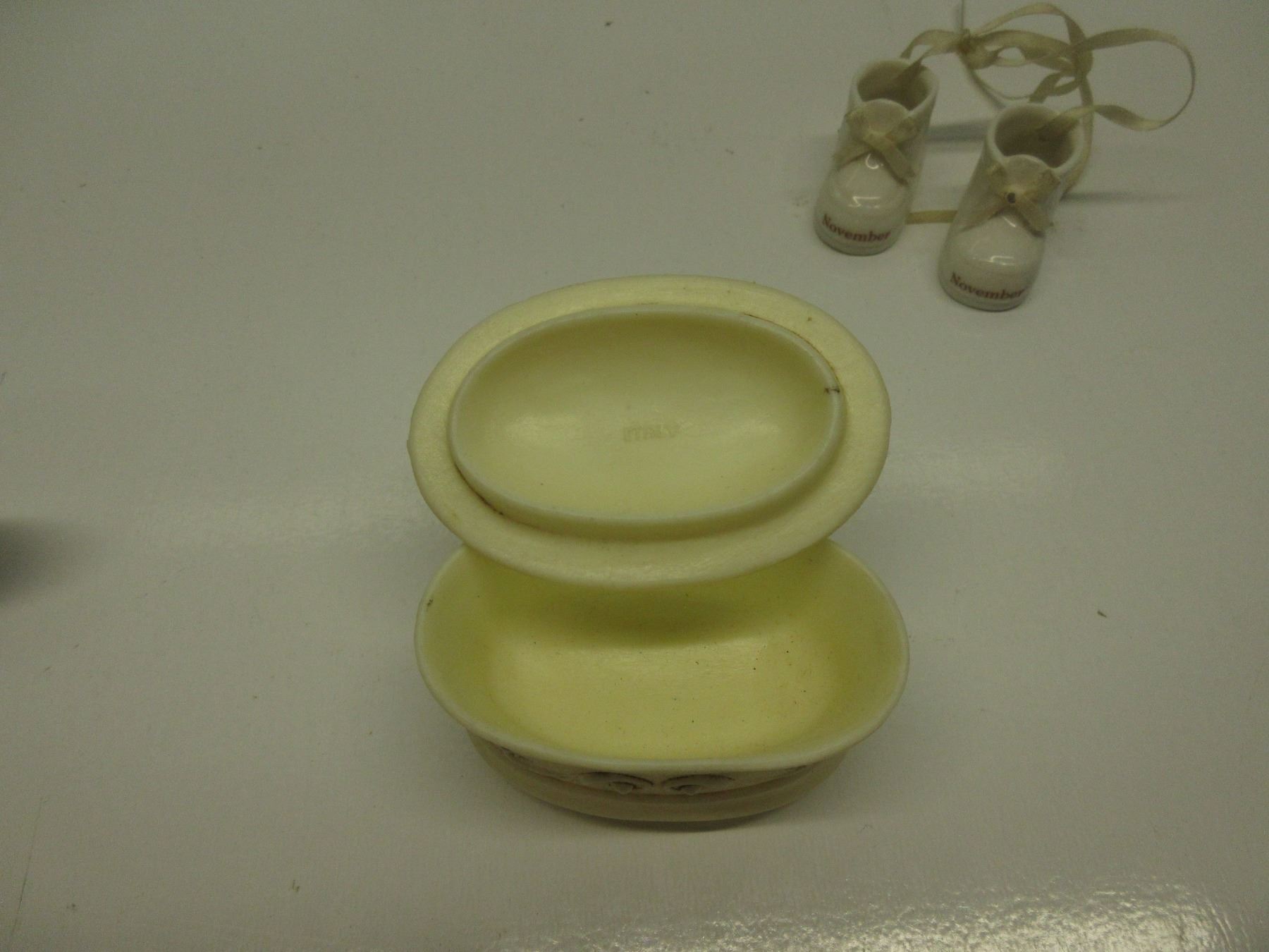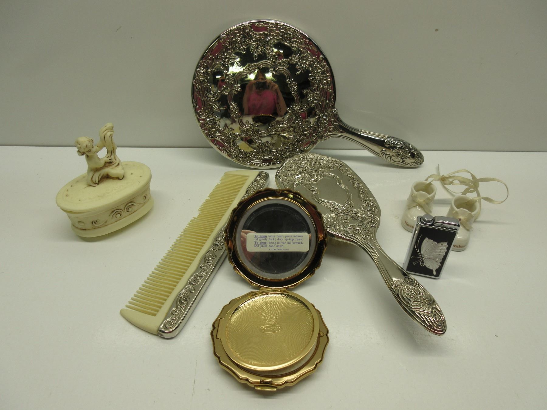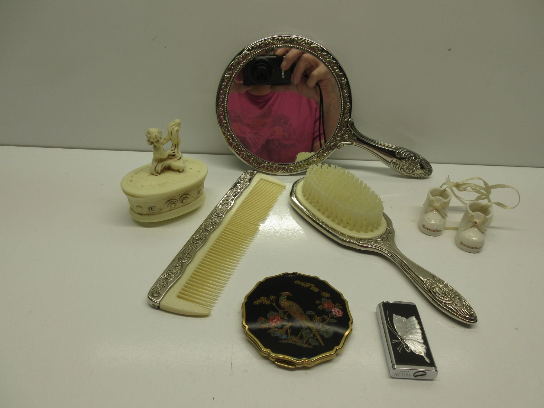 Mirror brush & comb set (not silver, mirror has spot where finis is coming off), compact Strattan made in England , perfume atomizer Nacon made in Japan, trinket box made in Italy, porcelain baby shoes November