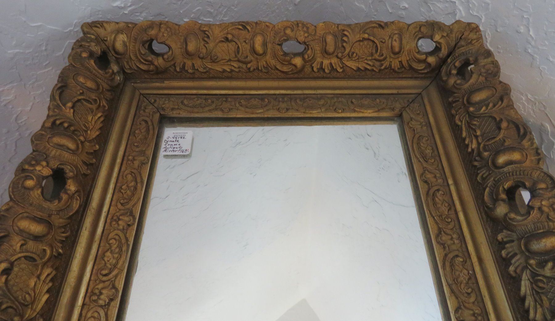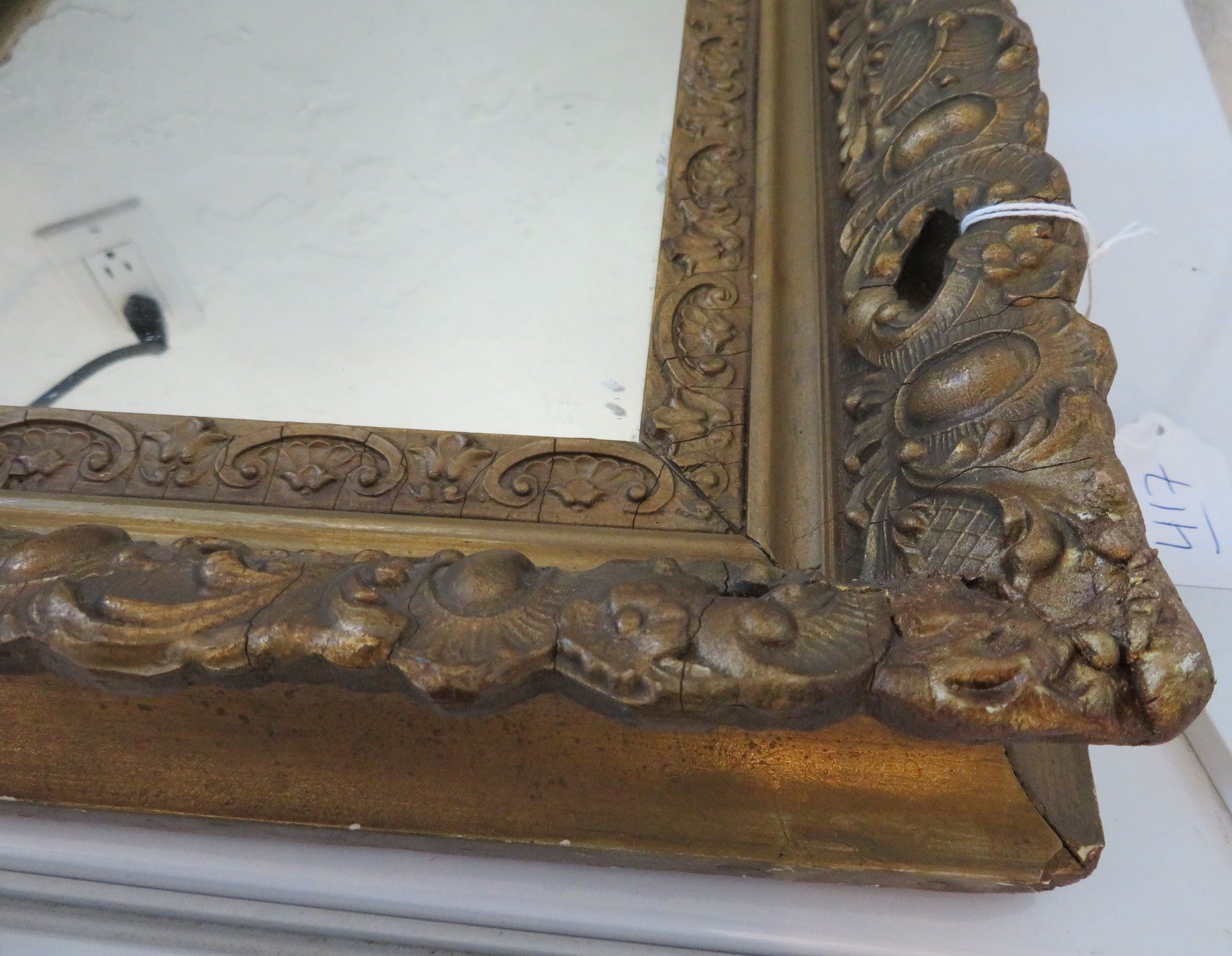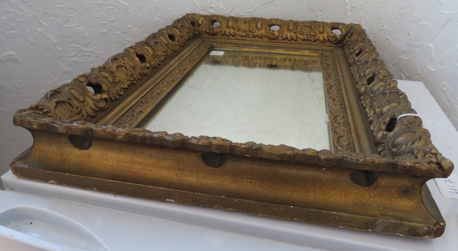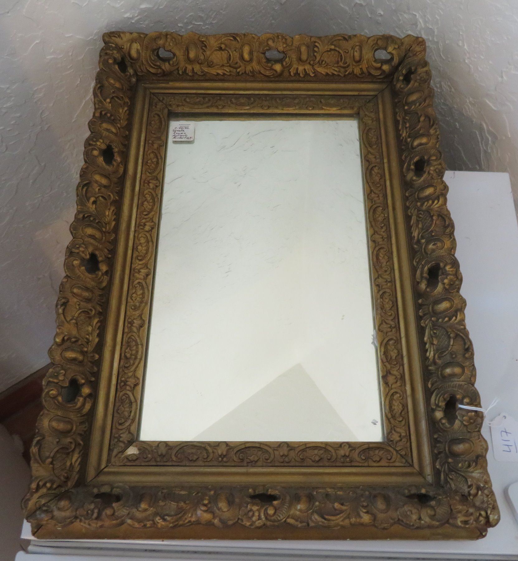Mirror w/Ornate Frame, antique item. Made of wood and gold-tone paint, the item measures 14 1/2" x 20 1/2". American. Condition: Fair, chips in frame, see images. Shipping: $45.00 USA estimate only, due to size and weight, double-boxed.