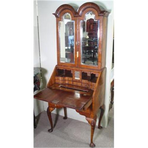 Most unusal mirrored fine quality Queen Anne style Secretary. Double Bonnet Top. Fall Front writing slope with lots of interesting interior drawers etc. c 1900 (may be older) Queen Ann Legs with stylised shell knees. 7lhigh 27wide 18ins deep.