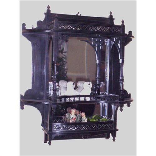 Elegant, black wall shelf. Very heavy. Beveled edge mirror, beautiful carving. 3 shelves in the center section, 4 rounded shelves on the outside. The mirror is 23"long,16" wide. The space between the top and middle shelf is 16" and between the middle and bottom is 6.5". A great accent piece to show off those collectibles!