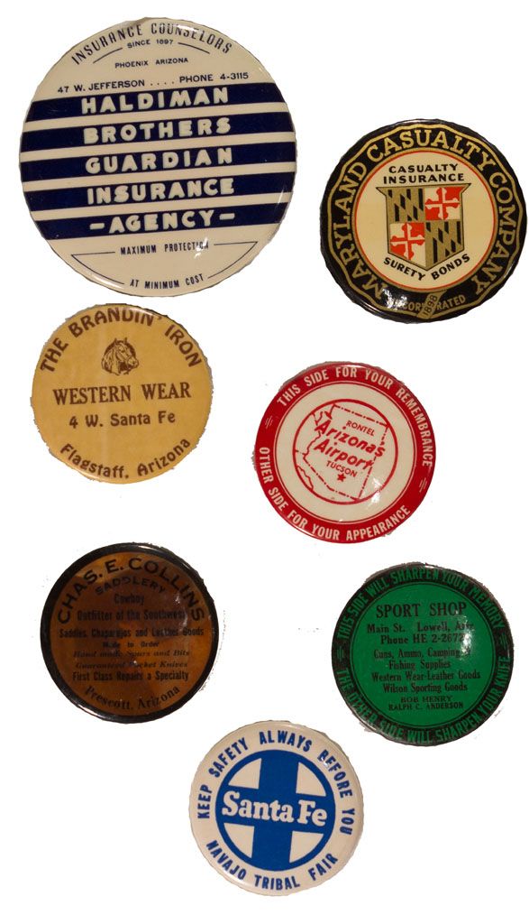 Lot of 7 in black display box (8 x 12"). 1) Santa Fe, "Keep Safety Always Before You/ Navajo Tribal Fair// (mirror); 2) Chas. E. Collins/ Saddlery/ Prescott, Arizona// (sharpening stone); 3) Sport Shop/ Main St. Lowell, Ariz.// (sharpening stone); 4) The Brandin` Iron/ Western Wear/ 4 W. Santa Fe// (sharpening stone); 5) Rontel/ Arizona`a Airport/ Tucson// (mirror); 6) Haldiman/Brothers/ Guardian/ Insurance/ Agency// (mirror); 7) Maryland Casualty Company// (mirror) - Vinegar Collection -55841