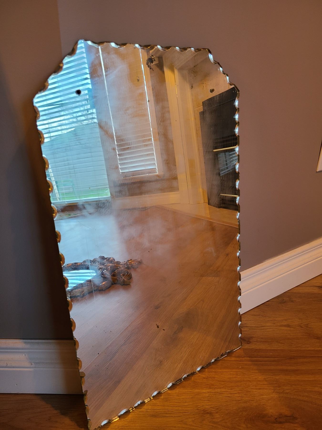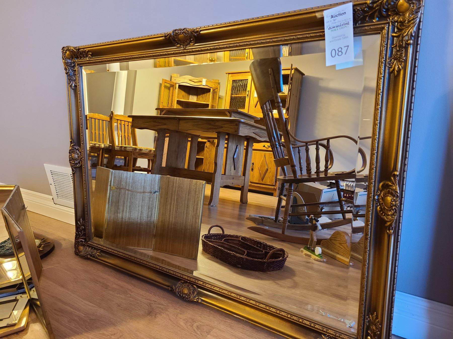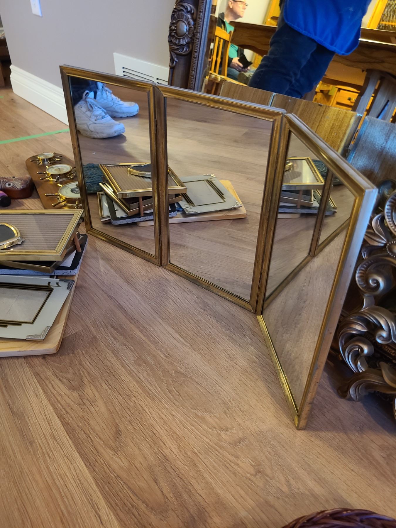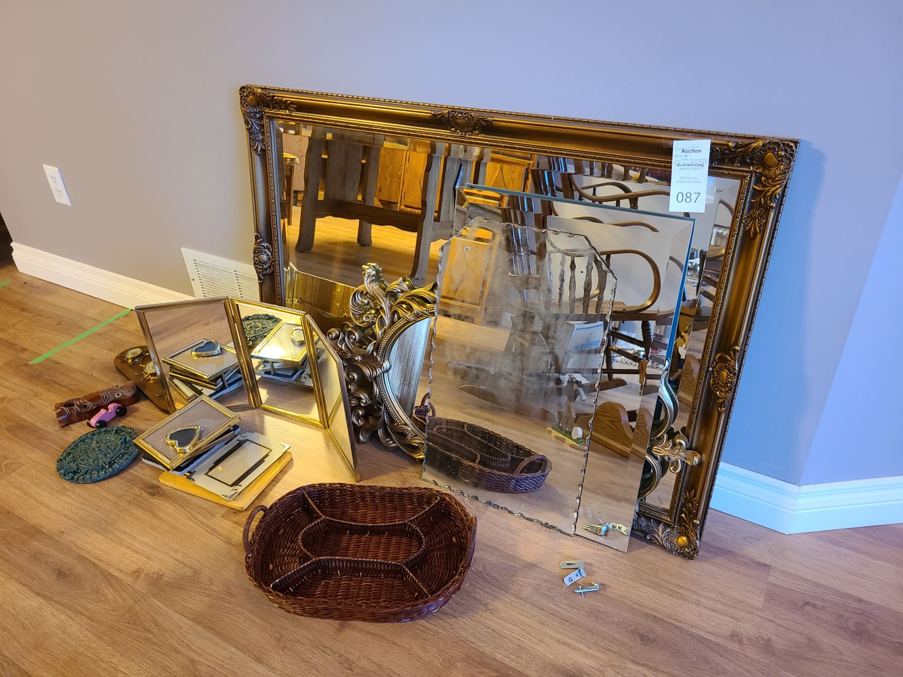 Lot includes large mirror 40x30, frames, round and folding mirrors, and more. Please note scratches on sides. Pickup at 9 am.