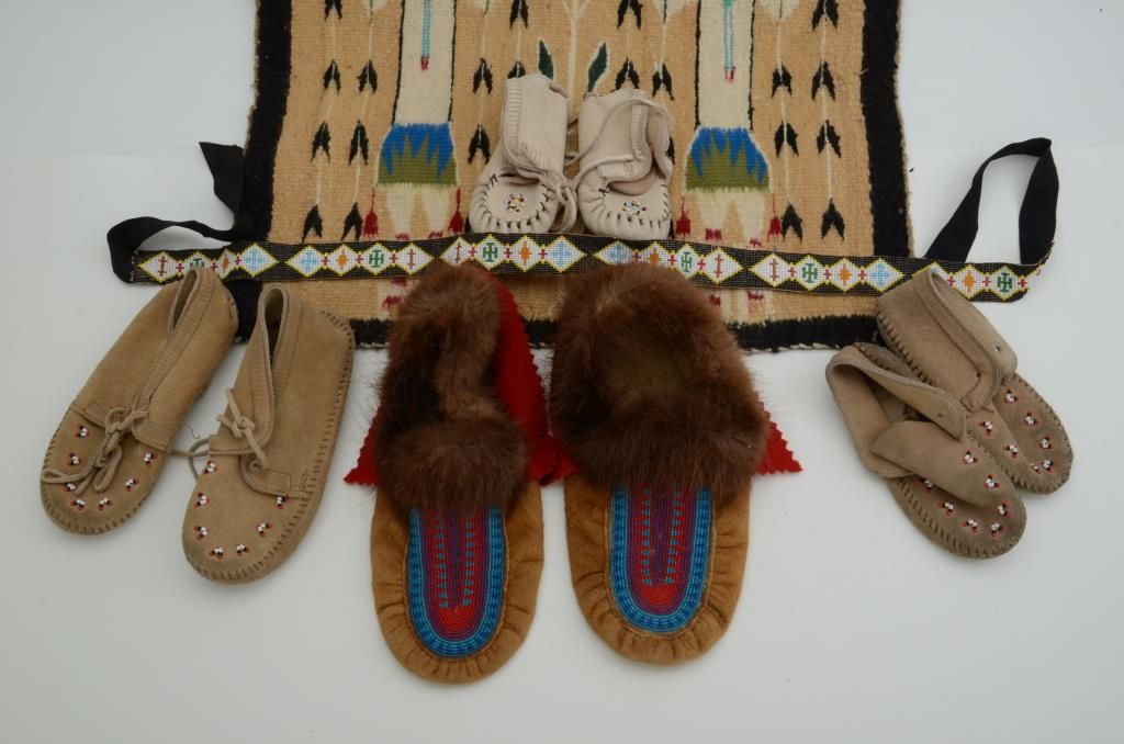Misc. American Indian items including 4 pair of moccasins, 1 small Hopi woven blanket and a piece of beadwork. Est.: $125-$250.