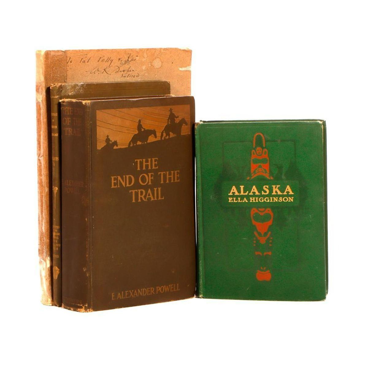 1.) FEWKES, JESSE WALTER. Antiquities of the Mesa Verde National Park. Smithsonian Institution Bureau of American Ethnology, Bulletin 41. Washington, D.C.: Government Printing Office, 1909. 8vo. Green cloth. Photo and line drawing illustrations. Overall Good, staining/scuffing to cloth. 2.) FISHER, WALTER K. The Starfifshes of the Hawaiian Island. A Thesis submitted to the Faculty of Zoology of the Leland Standford Junior University... Washington, D.C.: Government Printing Office, 1906. 4to. Paper wraps. Photo and line drawing illustrations. Inscribed on cover "To Pal Pelly and Kai, WK Fisher, Retired" (to Harriet Dean, Elsie Whitaker Martinez, and Micaela Martinez). Together with a small card of marine life pencil sketches by Fisher. Staining/toning, tears, tape repairs to paper covers. 3.) HIGGINSON, ELLA. Alaska, The Great Country. New York: MacMillan Company, 1910. Photo illustrations. 8vo. Green cloth. Fair-Good; wear to ends of spine/corners, repeated ink ownership stamps at front, splitting at back. 4.) POWELL, E. ALEXANDER. The End of the Trail, The Far West from New Mexico to British Columbia. 8vo. Olive green pictorial cloth. New York: Charles Scribner's Sons, 1914. Photo illustrations and map at back. Overall Good; edge wear, toning, dampstaining to half title. From the Family of Xavier Martinez (1869-1943), Elsie Whitaker Martinez (1890-1984), and Micaela Martinez DuCasse (1913-1989).