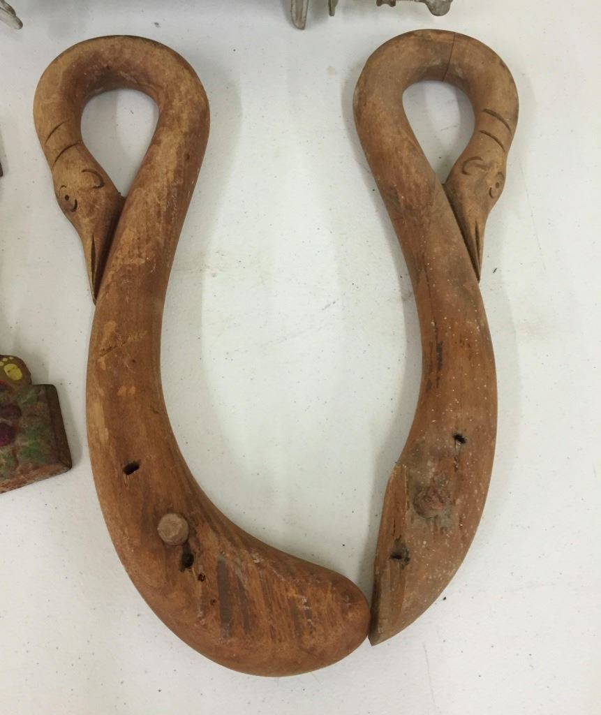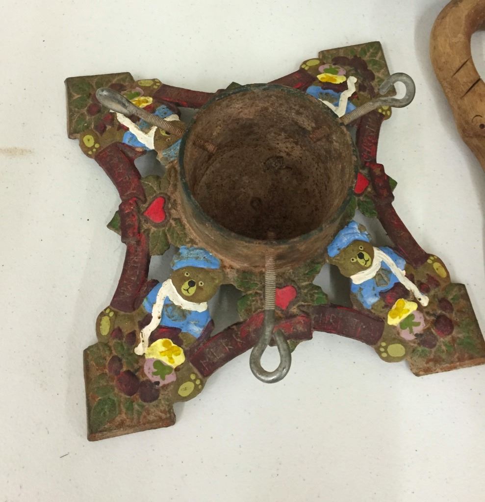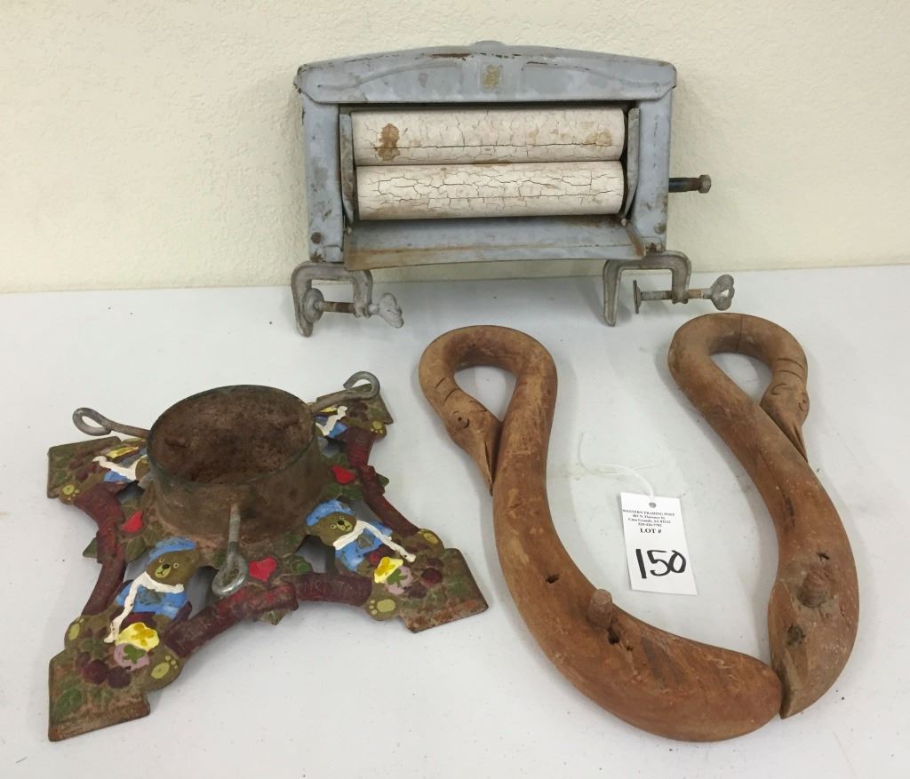 There is an antique cast iron Christmas tree base, a pair of antique wooden, carved chair arms and an antique laundry ringer. Please look closely at the pics as they are an important part of our description. Shipping: There will be a $7 handling / packaging fee for shipping this lot. The actual cost of postage will be added on top of that.