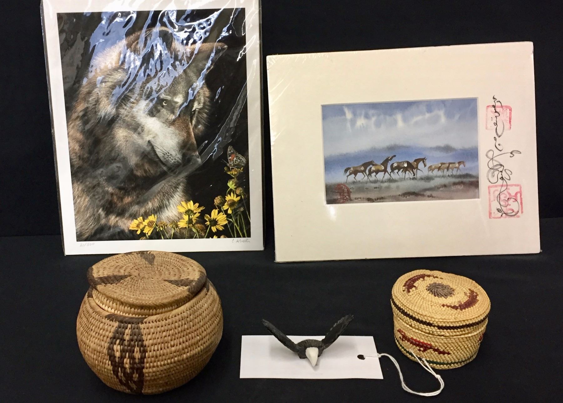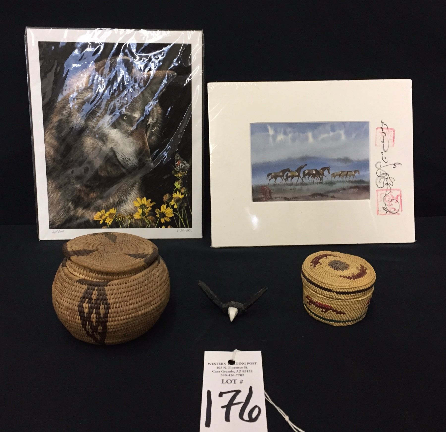 Maker: Various. Approx. Age: Fairly modern. Size: Varies. Additional Info: 2 baskets and 2 art prints. Condition: Good. Please look closely at the pictures - they are an important part of our description. Shipping: There will be a $7 handling / packaging fee for shipping this lot. The actual cost of postage will be added on top of that.