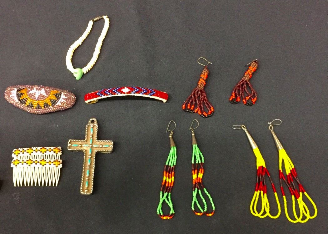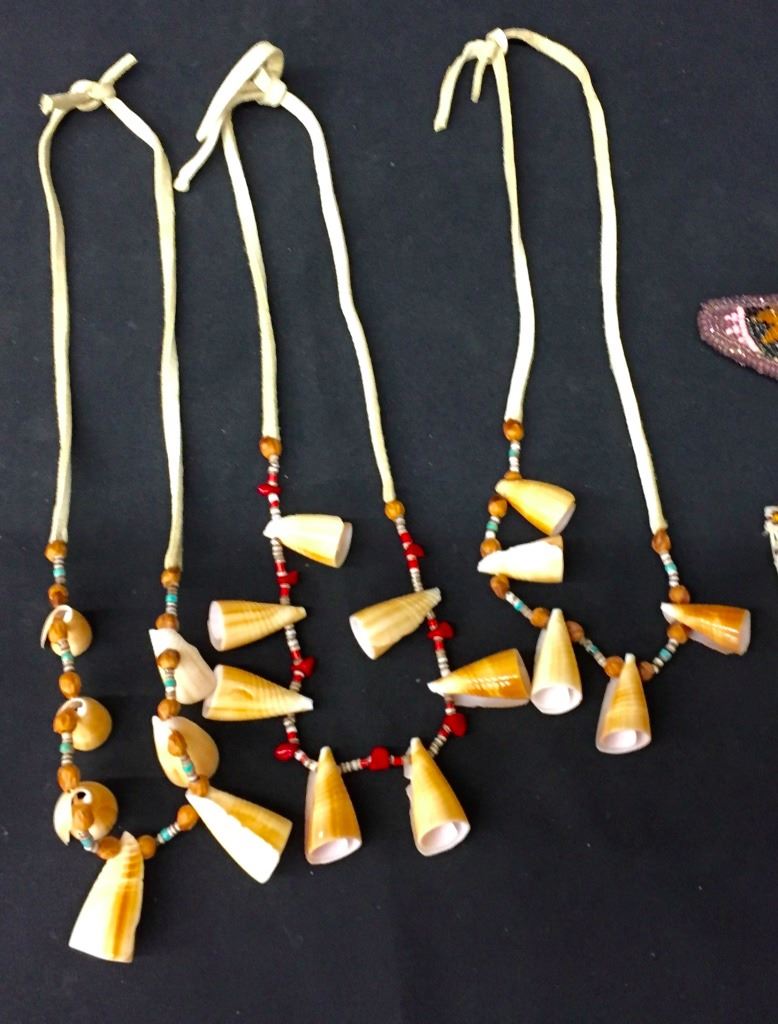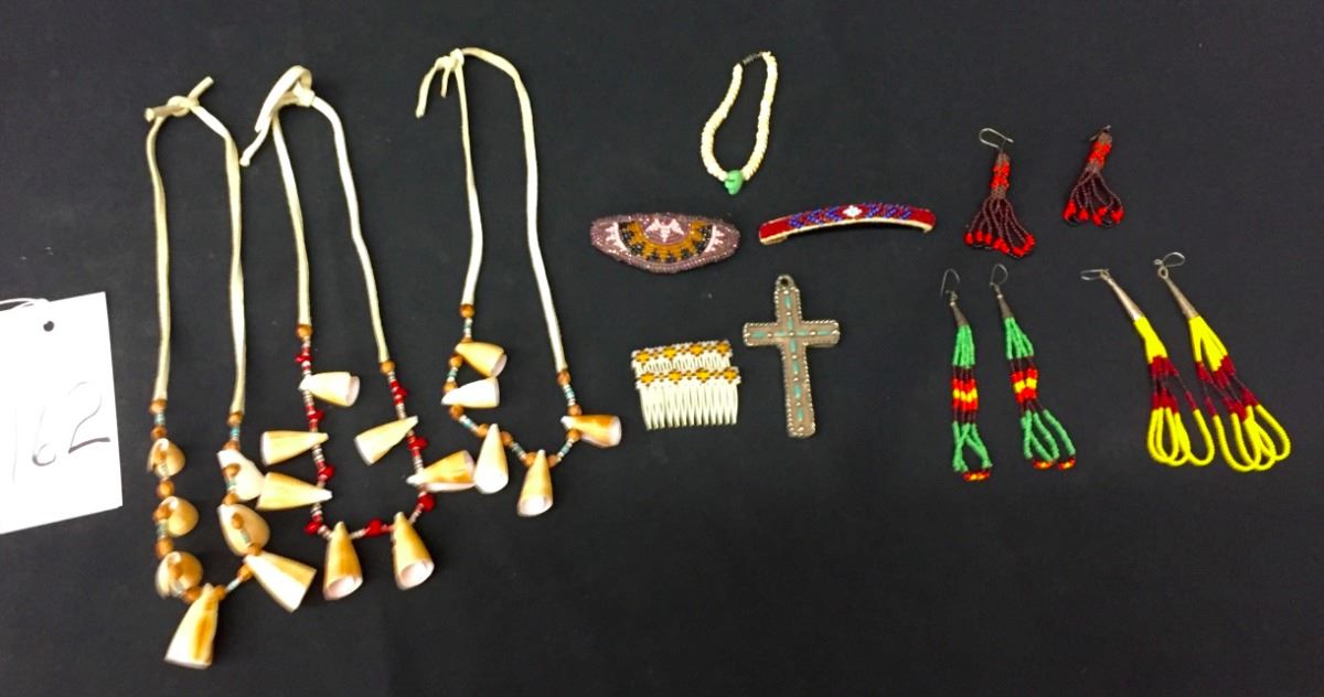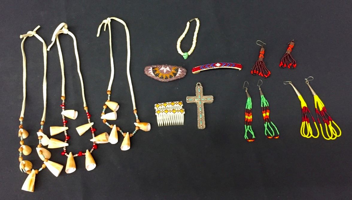 There are 3 pair of beaded earrings, 3 hair barrettes, 3 bead and shell necklaces, a shell bead bracelet and a needlepoint cross. Please look closely at pics - they are an important part of our description. Shipping: There will be a $5 handling / packaging fee for shipping this lot. The actual cost of postage will be added on top of that.