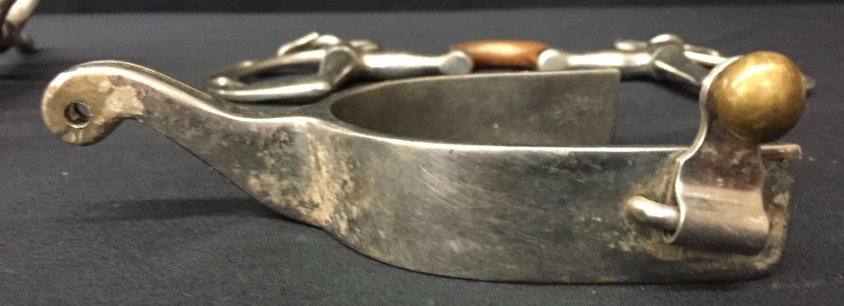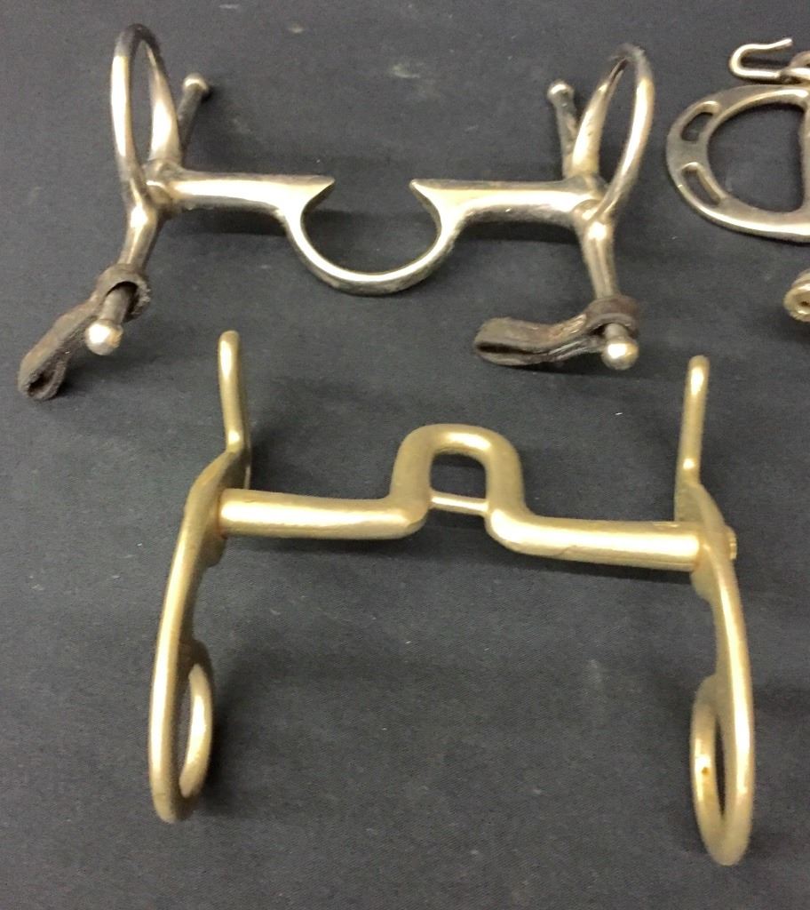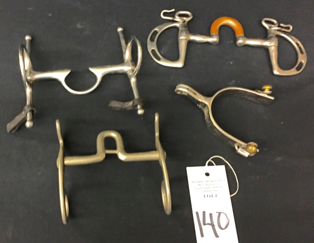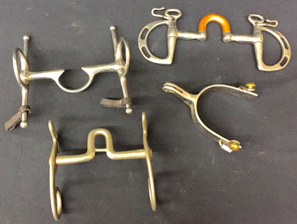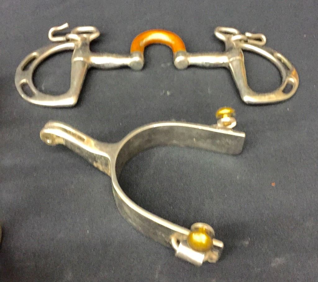 There are 3 different bridle bits and a single spur included in this lot. The two snaffle bits are contemporary, training type bits and the ported bit is an older North and Judd marked bit. Please look closely at the pics as they are an important part of our description. Shipping: There will be a $5 handling / packaging fee for shipping this lot. The actual cost of postage will be added on top of that.