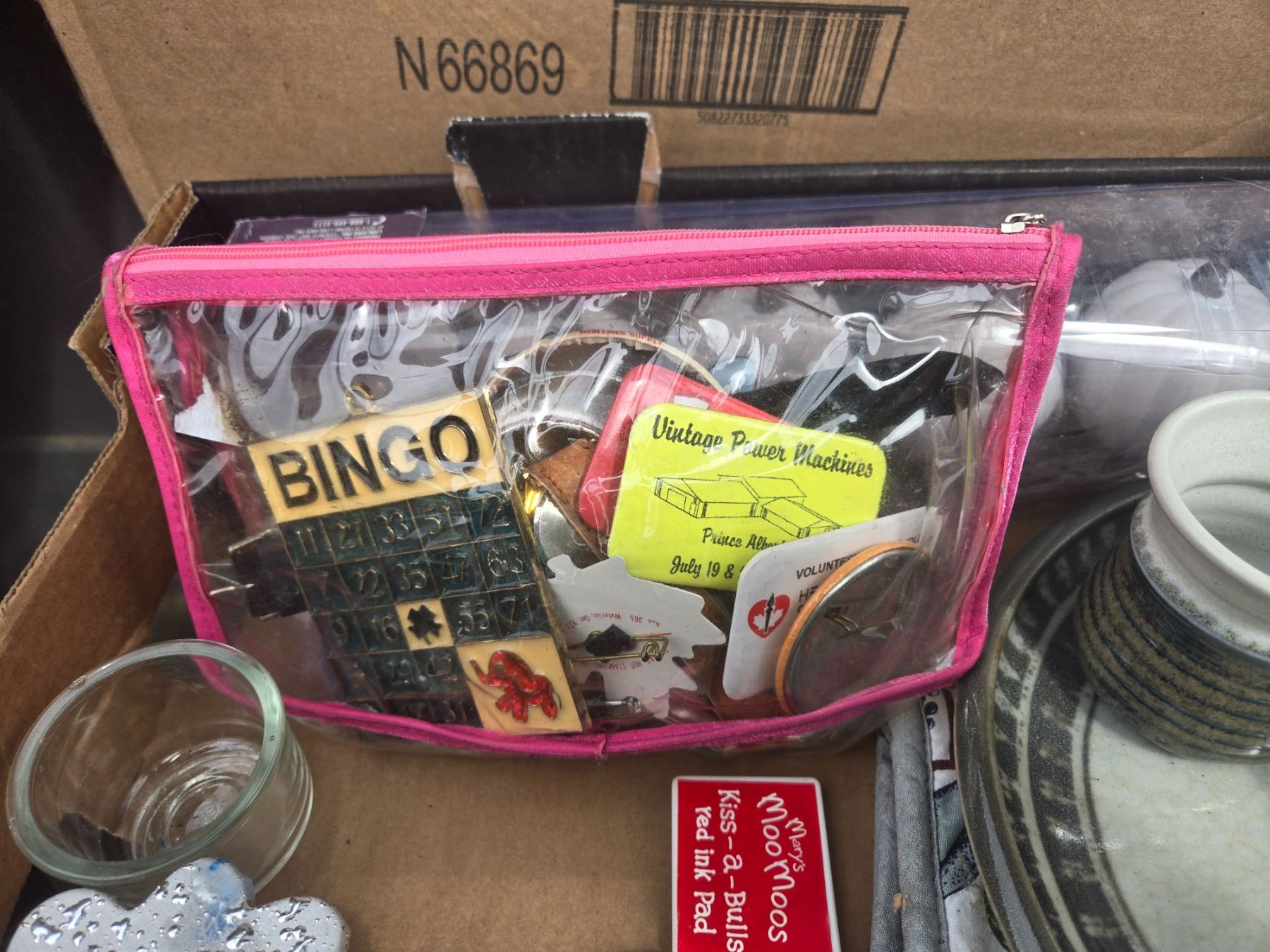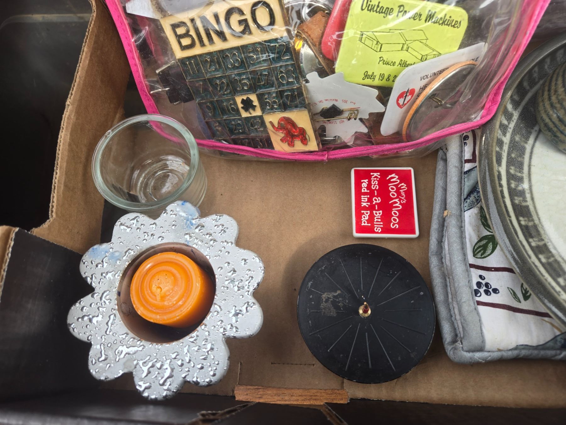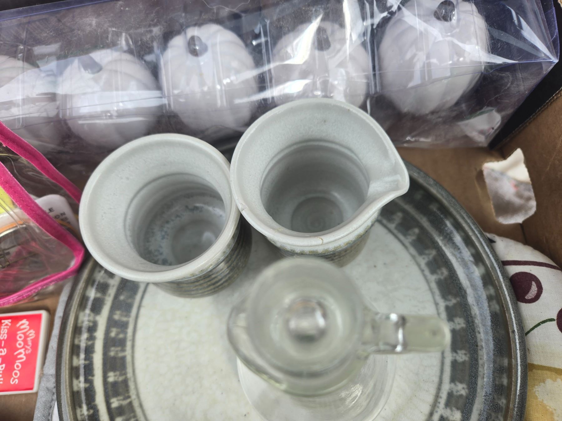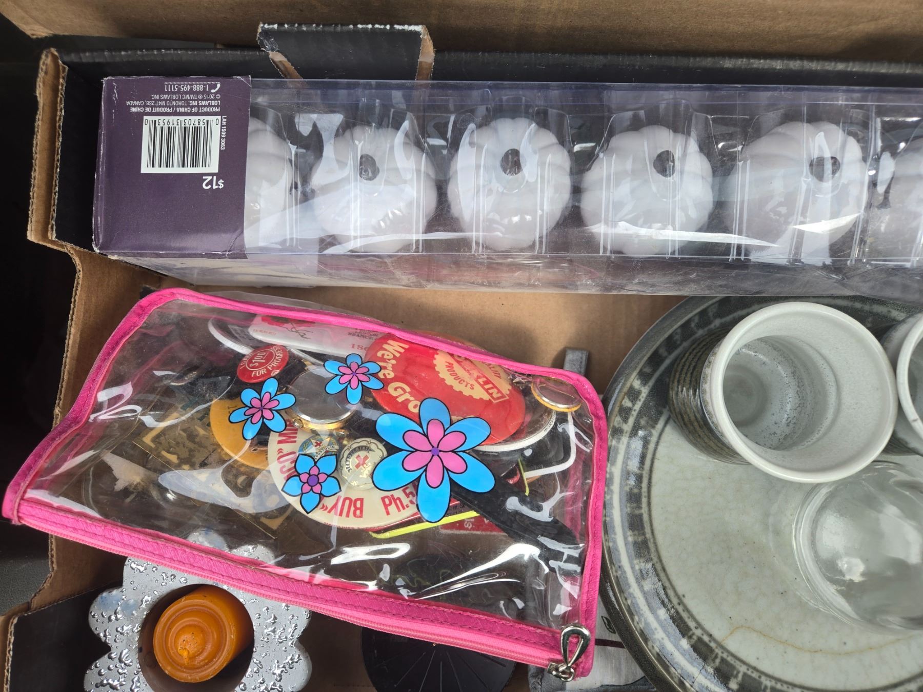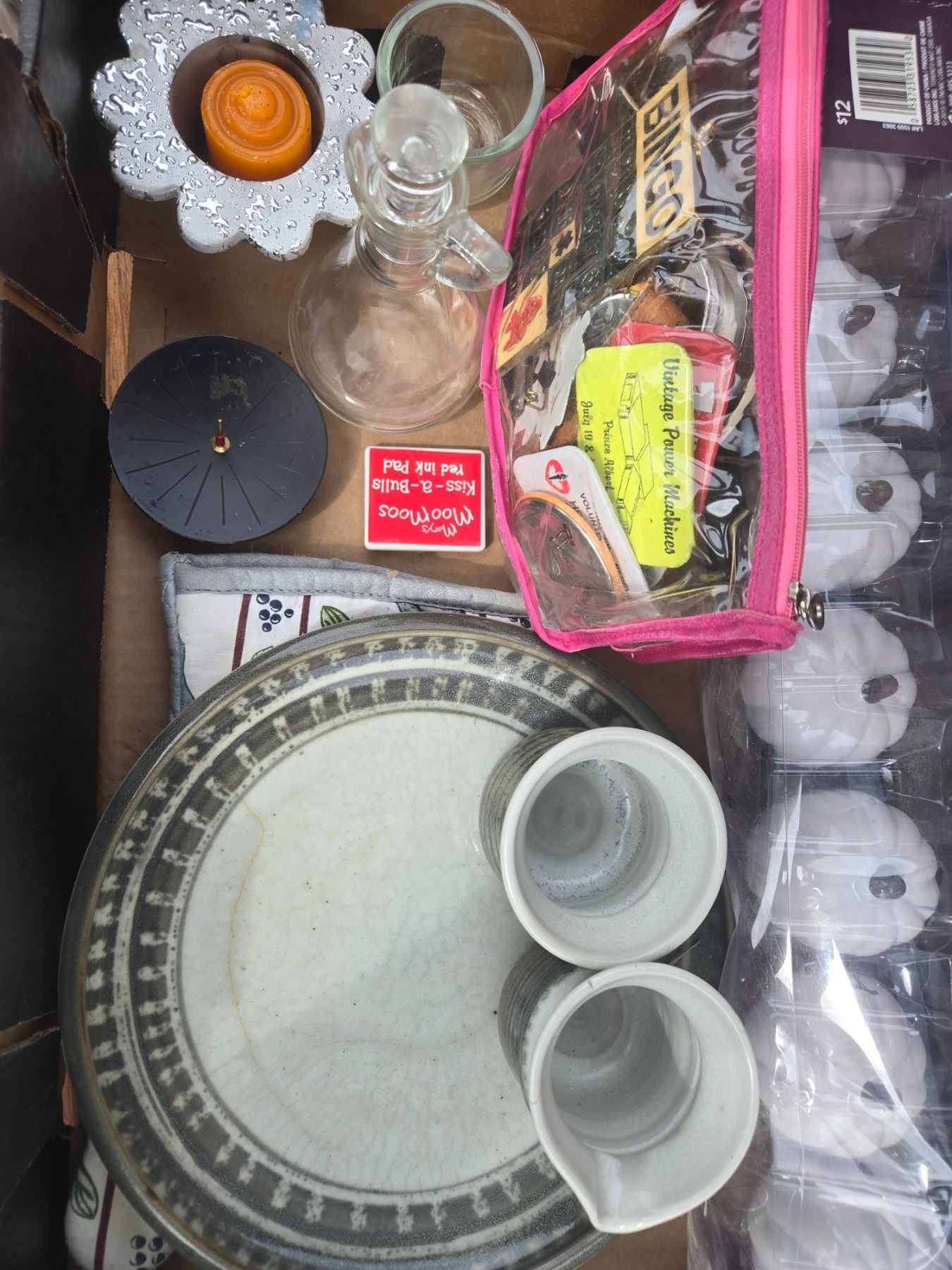 Misc Box – Pins, Welcome Sign in Box, Cream and Sugar on Plate, Small Candle Holders
