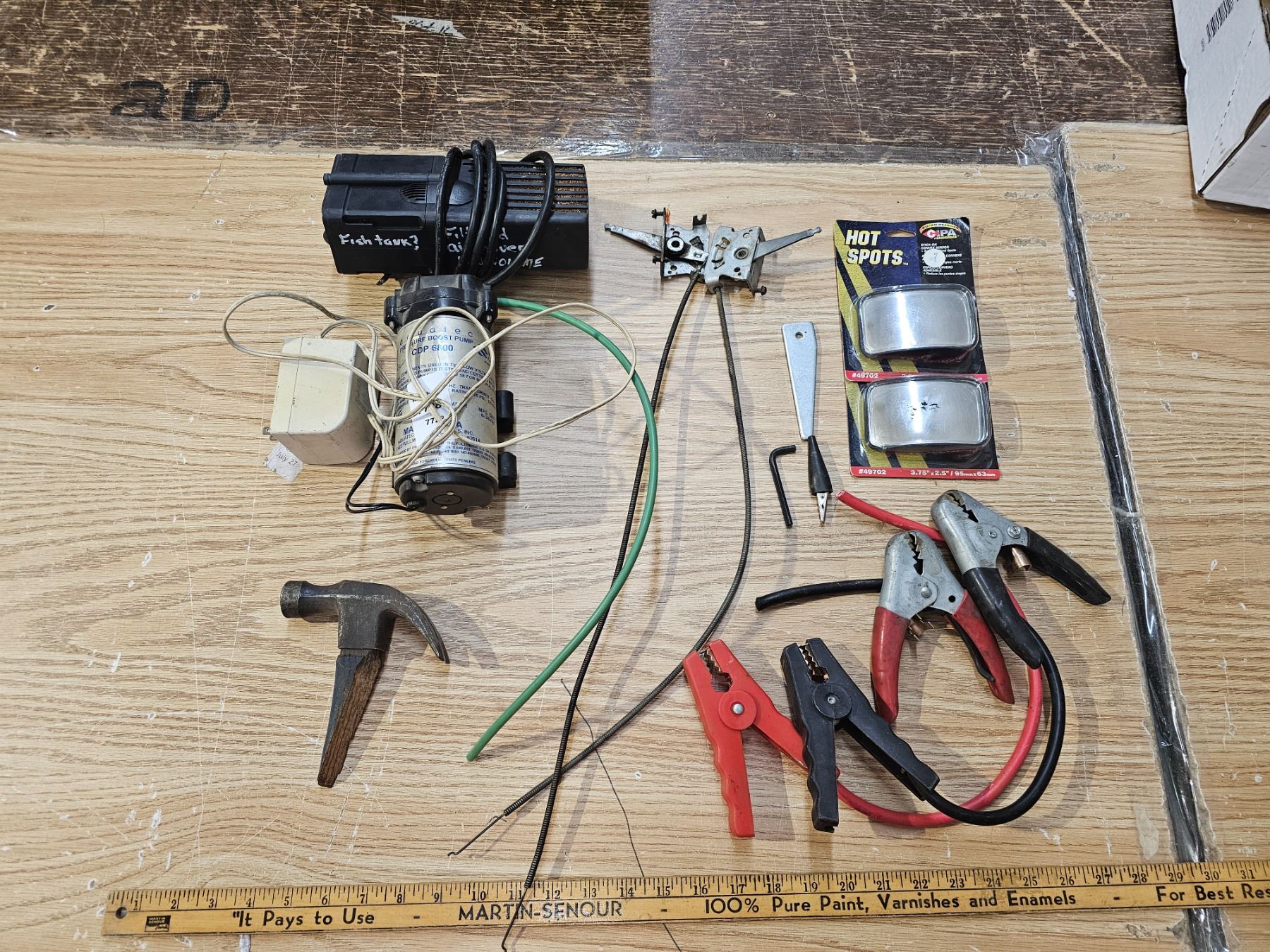 fish tank filter pump, Aquatec pressure boost pump( CDP6800), hood latches, stick on mirrors, hammer head, booster cable clamps.