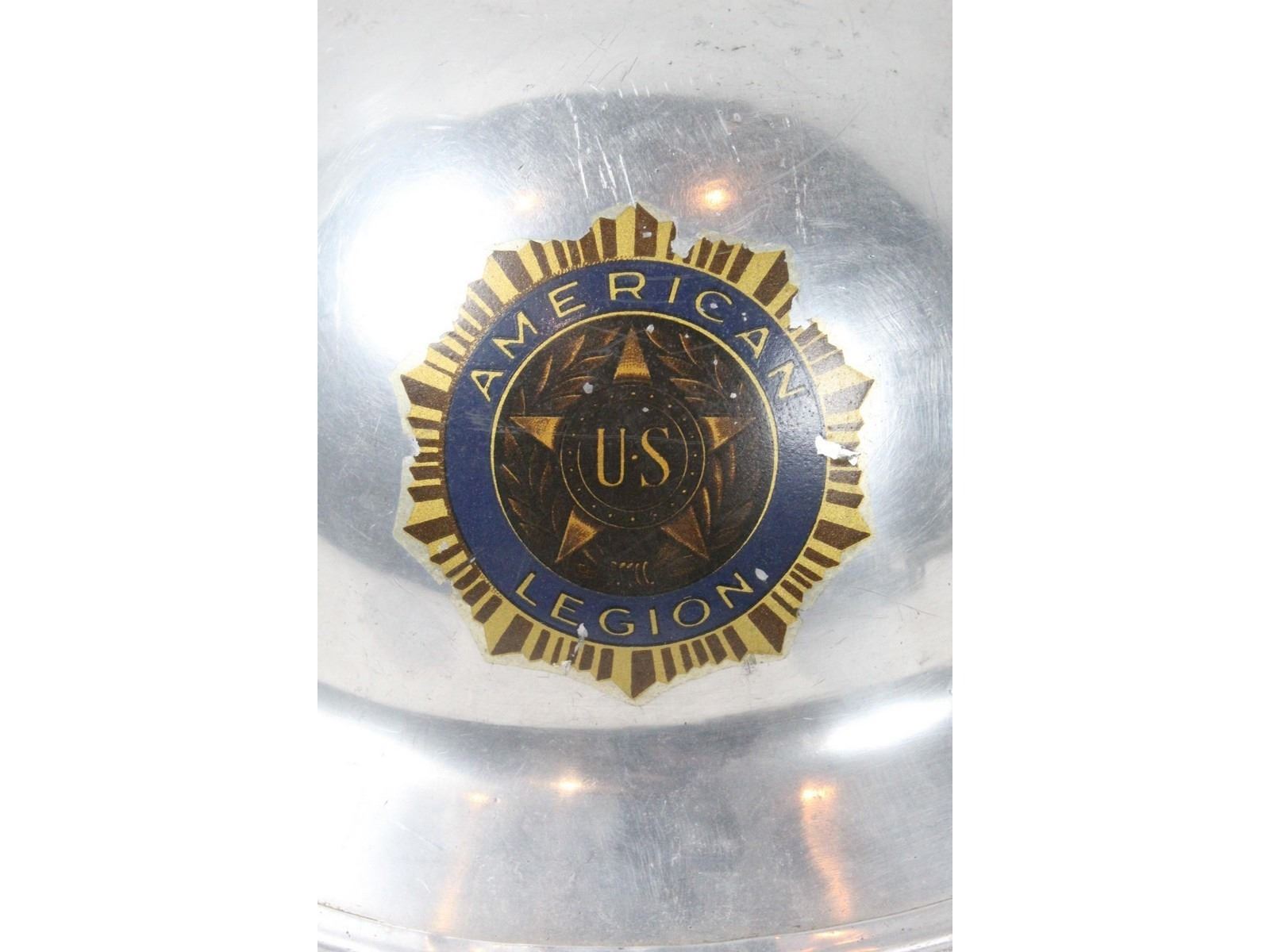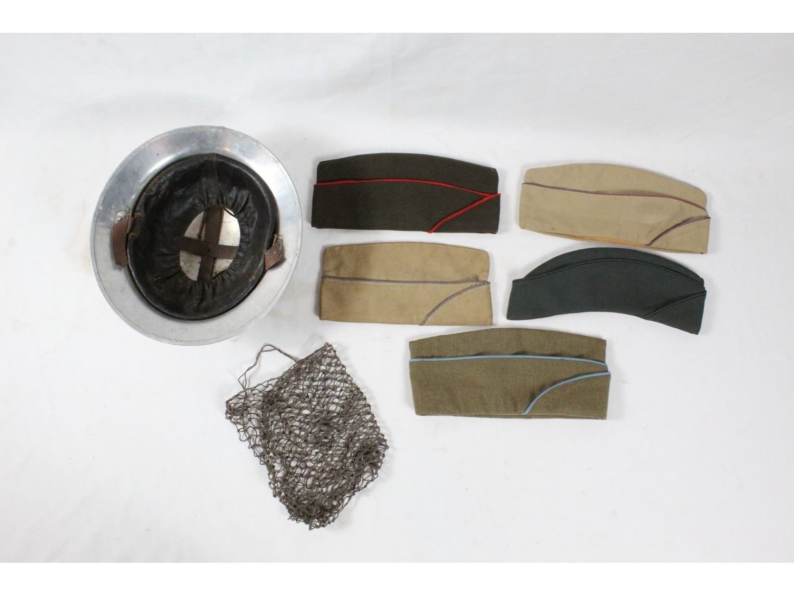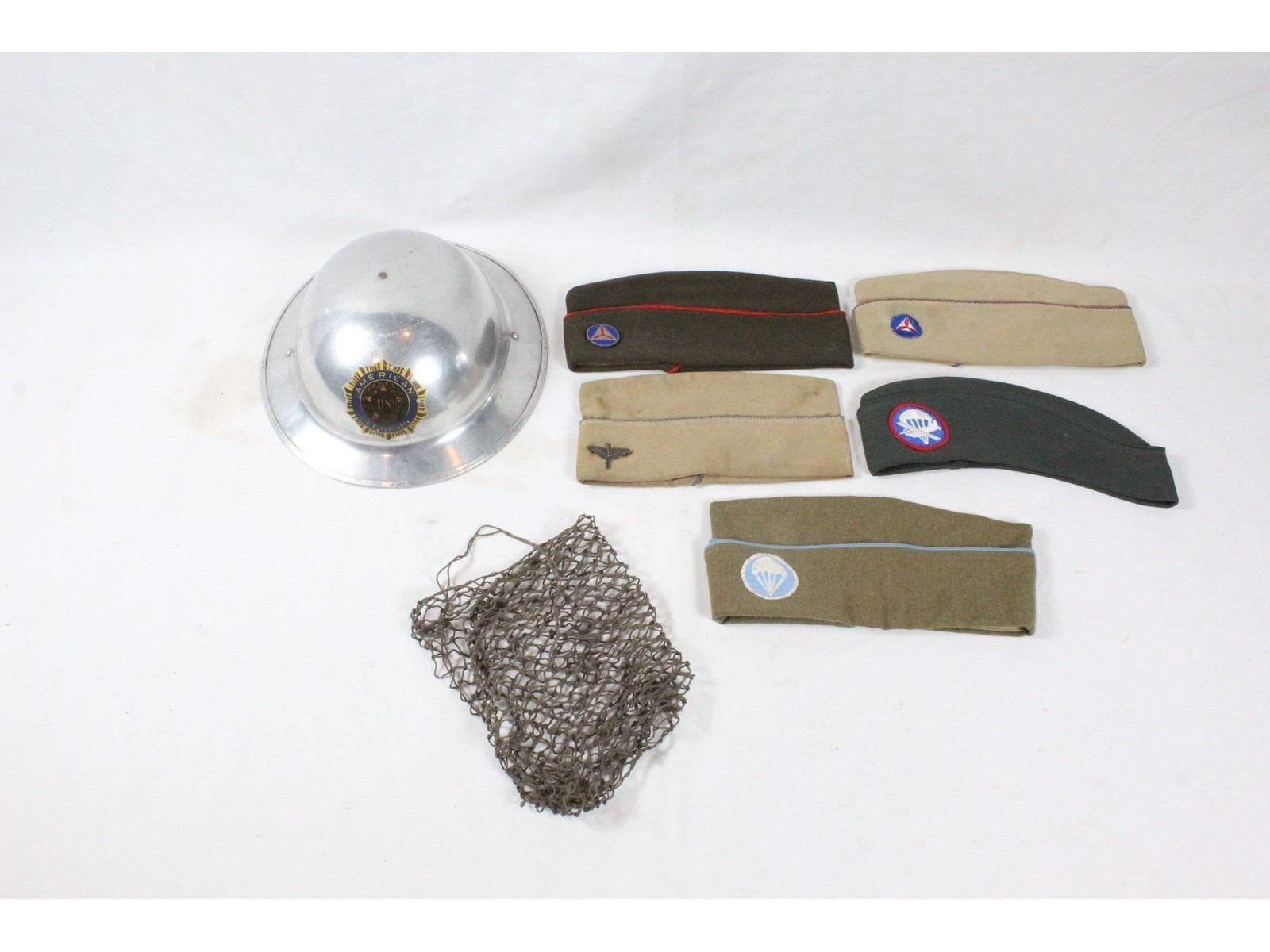 5 overseas caps, 1 helmet netting. Paratrooper cap is a repro. 1 American Legion parade helmet with liner.