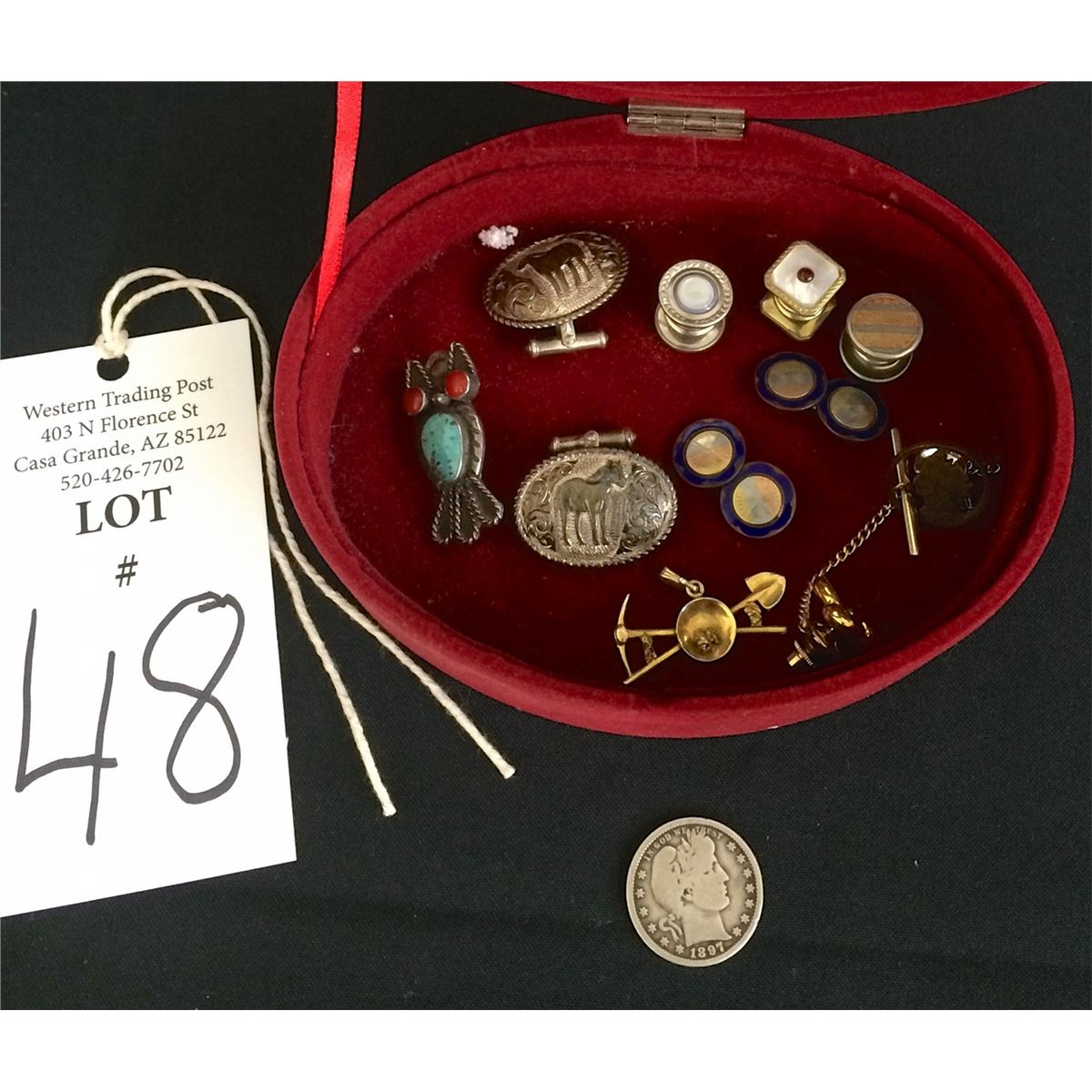There are several misc. cufflinks, a broach and even a 10K gold pendant in this lot! The 10k gold pendant is stamped and weighs approx. 2.4g. Most other items appear to be Sterling (however, not all of them are). You get this red jewelry box included in the deal!