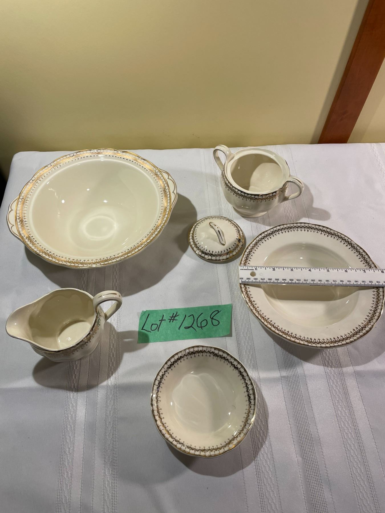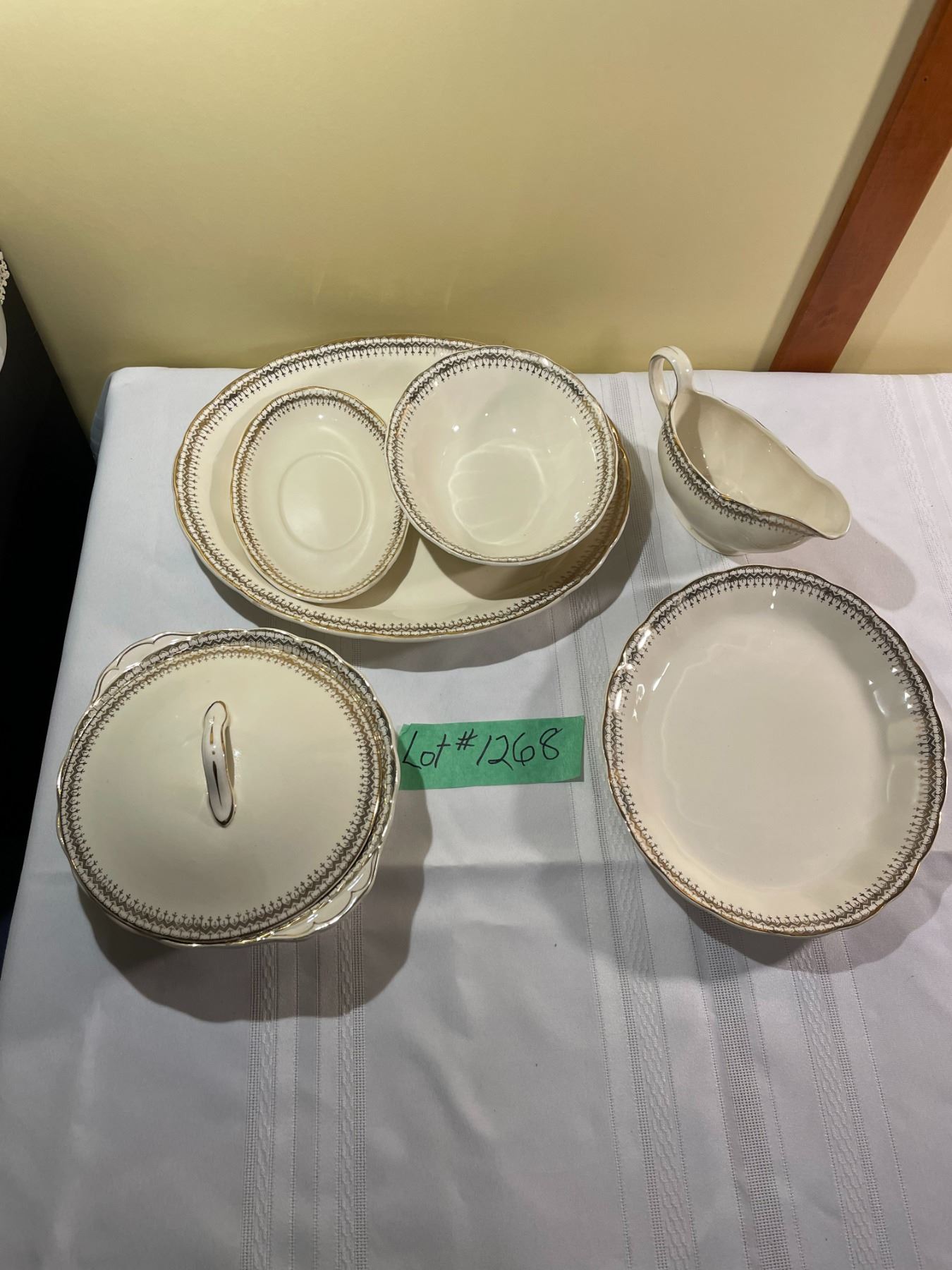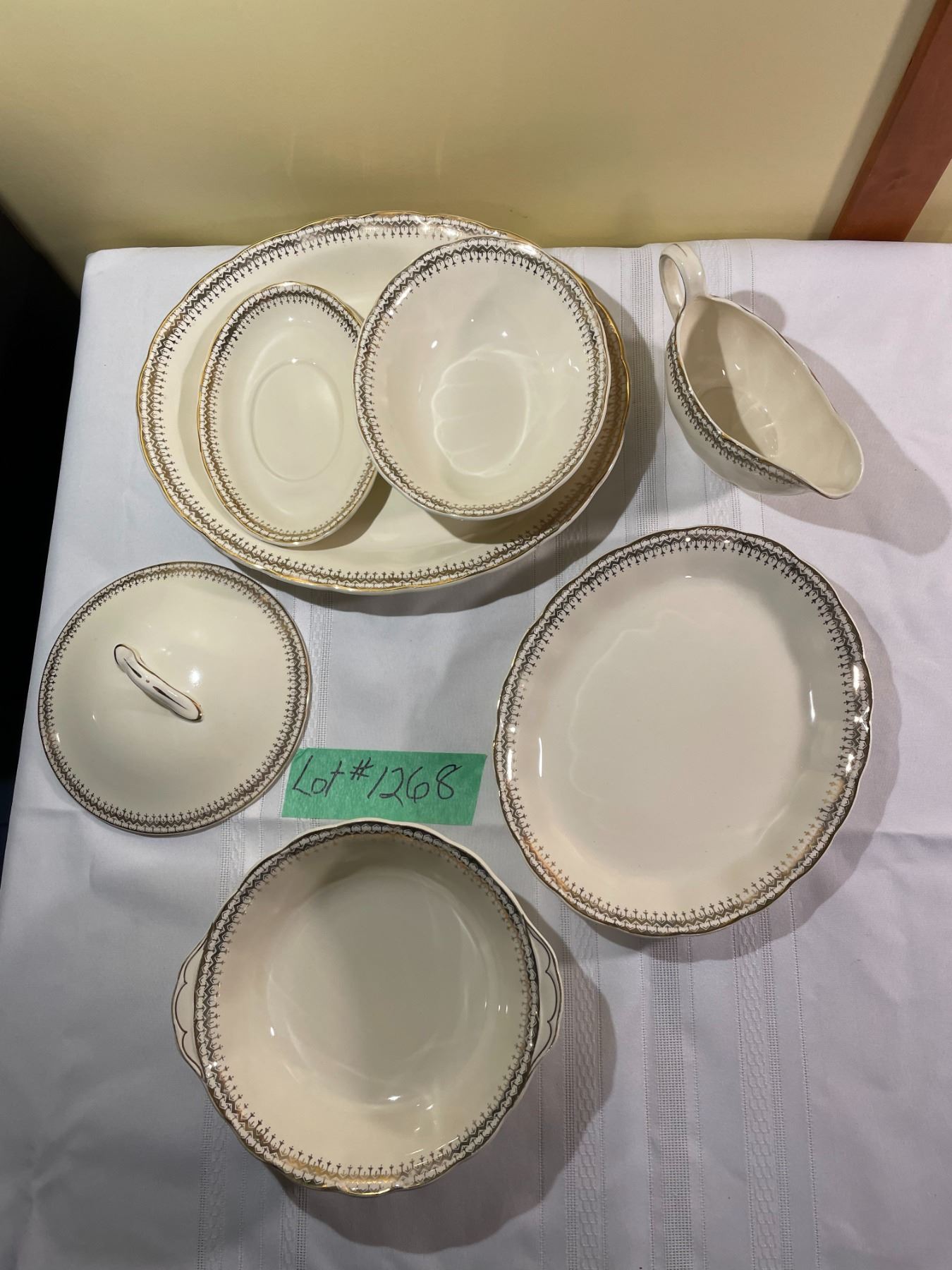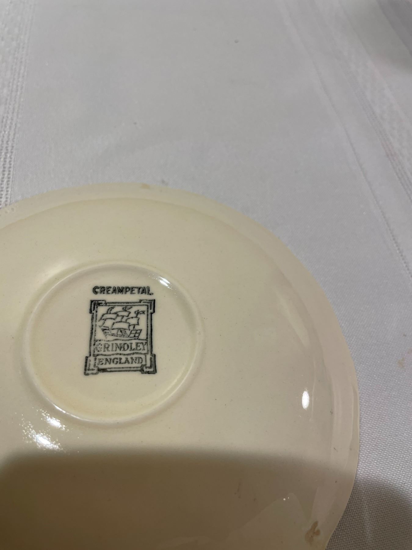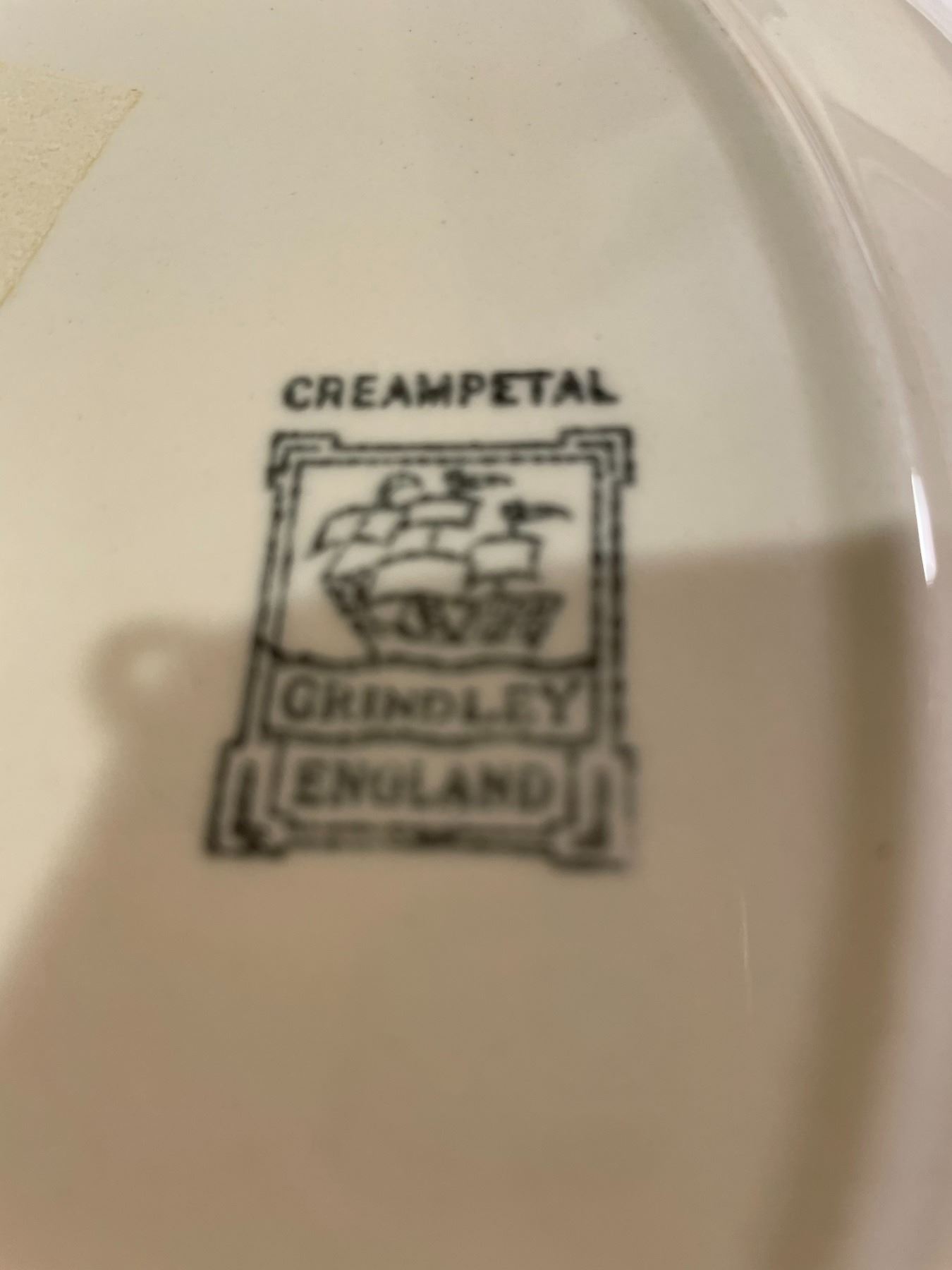 Fragile have 61 pieces of 65 piece set Heavy Box B Pattern: Cream Petal Design from Grindley England (a wedding gift from the families of Bride + Groom on July 9 1946) (1) Large Platter - 14" long (1) Platter - 11" (1) Platter - 8"(1) Small deep bowl Ellongated 8" (1) Gravy Bowl - 8" long (1) Deep dish bowl 9" by 2 1/2" deep with lid (1) sugar bowl with lid (1) Cream bowl (7) 5' diamter soup bowls (7) 8" Diameter soup bowls (8) 10" Diameter plates (dinner size) (8) 10" Diameter plates (dinner size) (8) 7 3/4 Diamter plates (8) 6 diameter saucer (6) tea cups (8) tea cup saucers