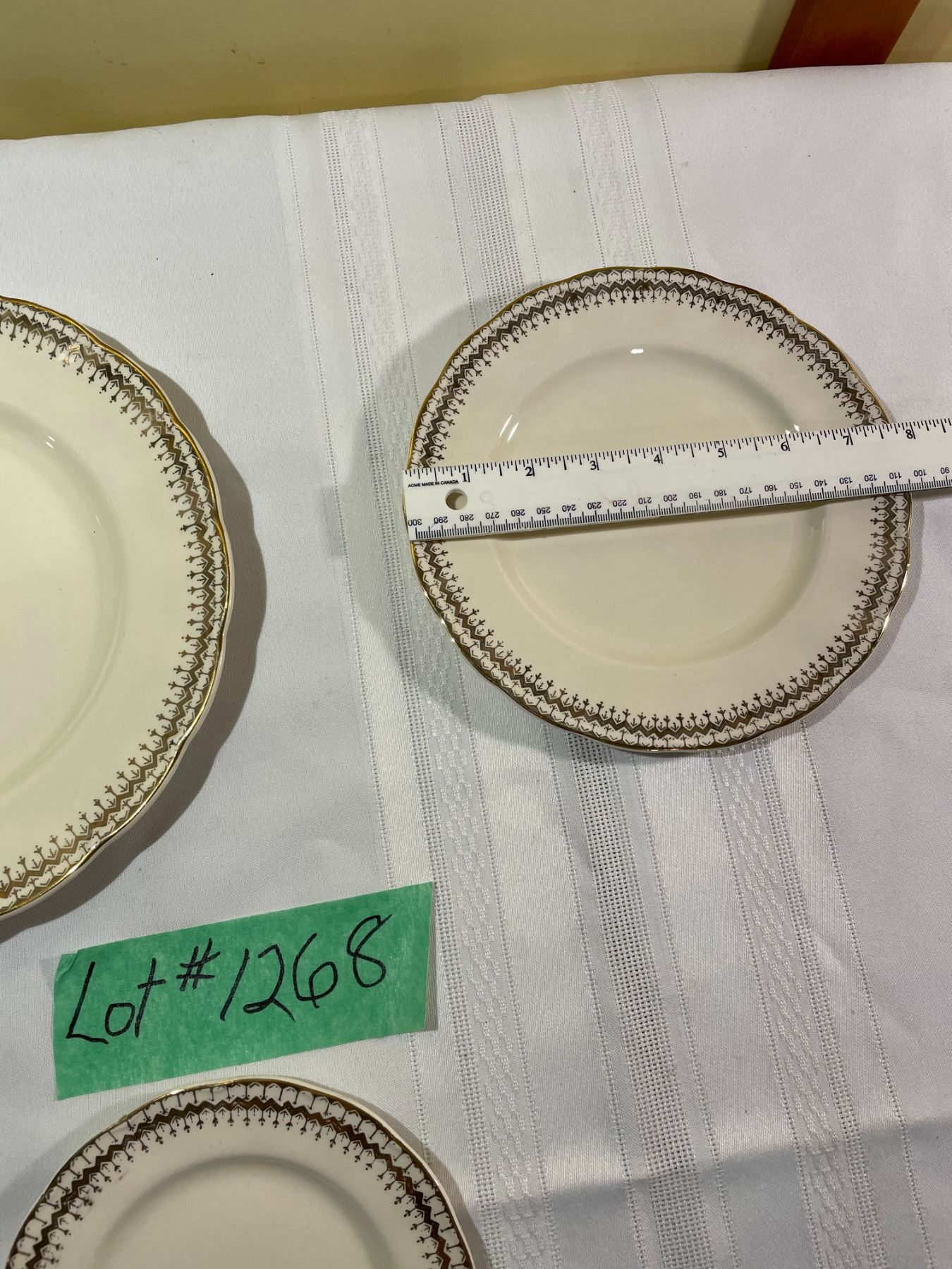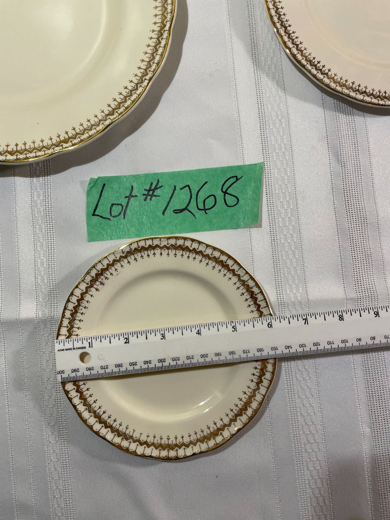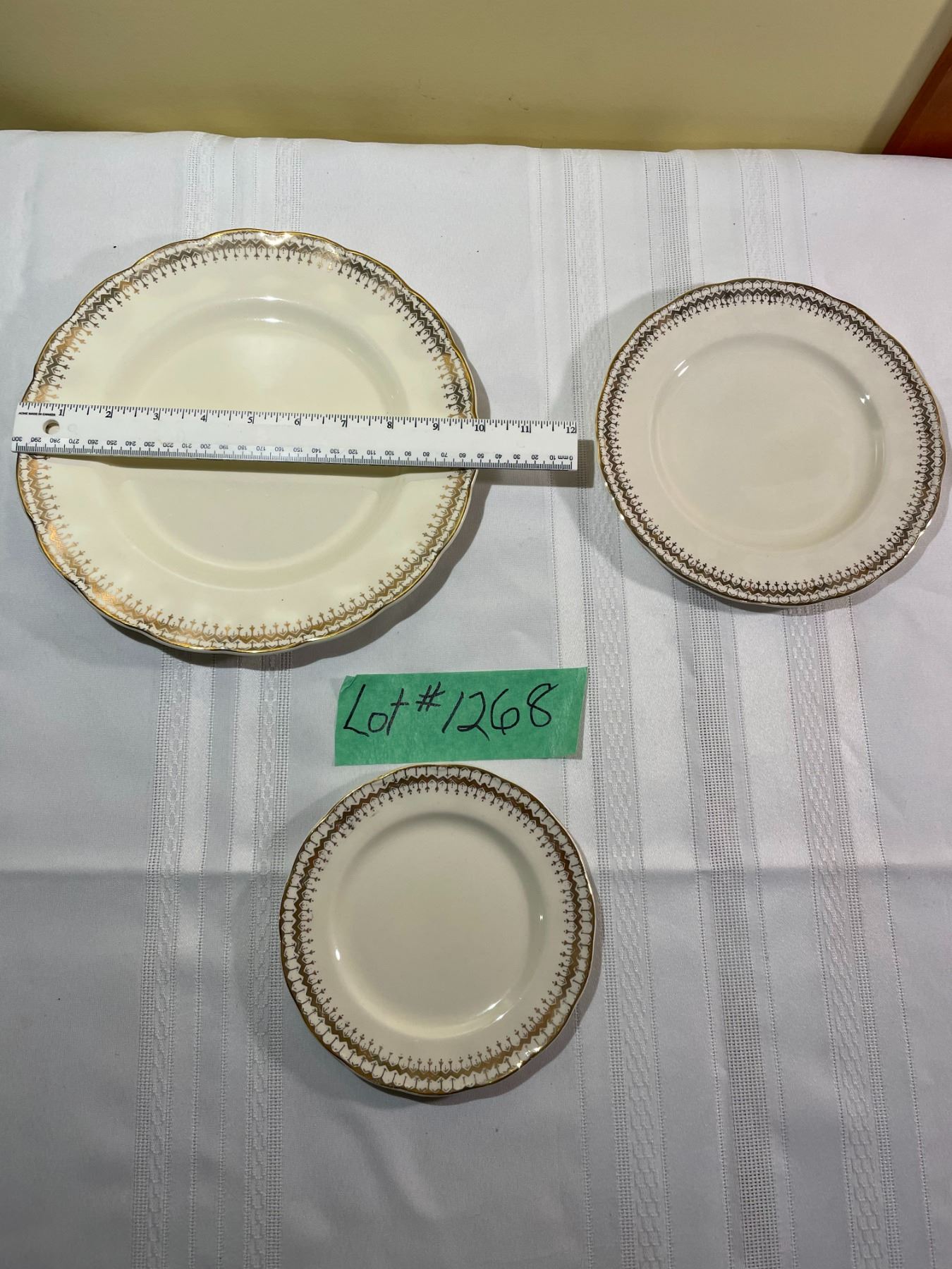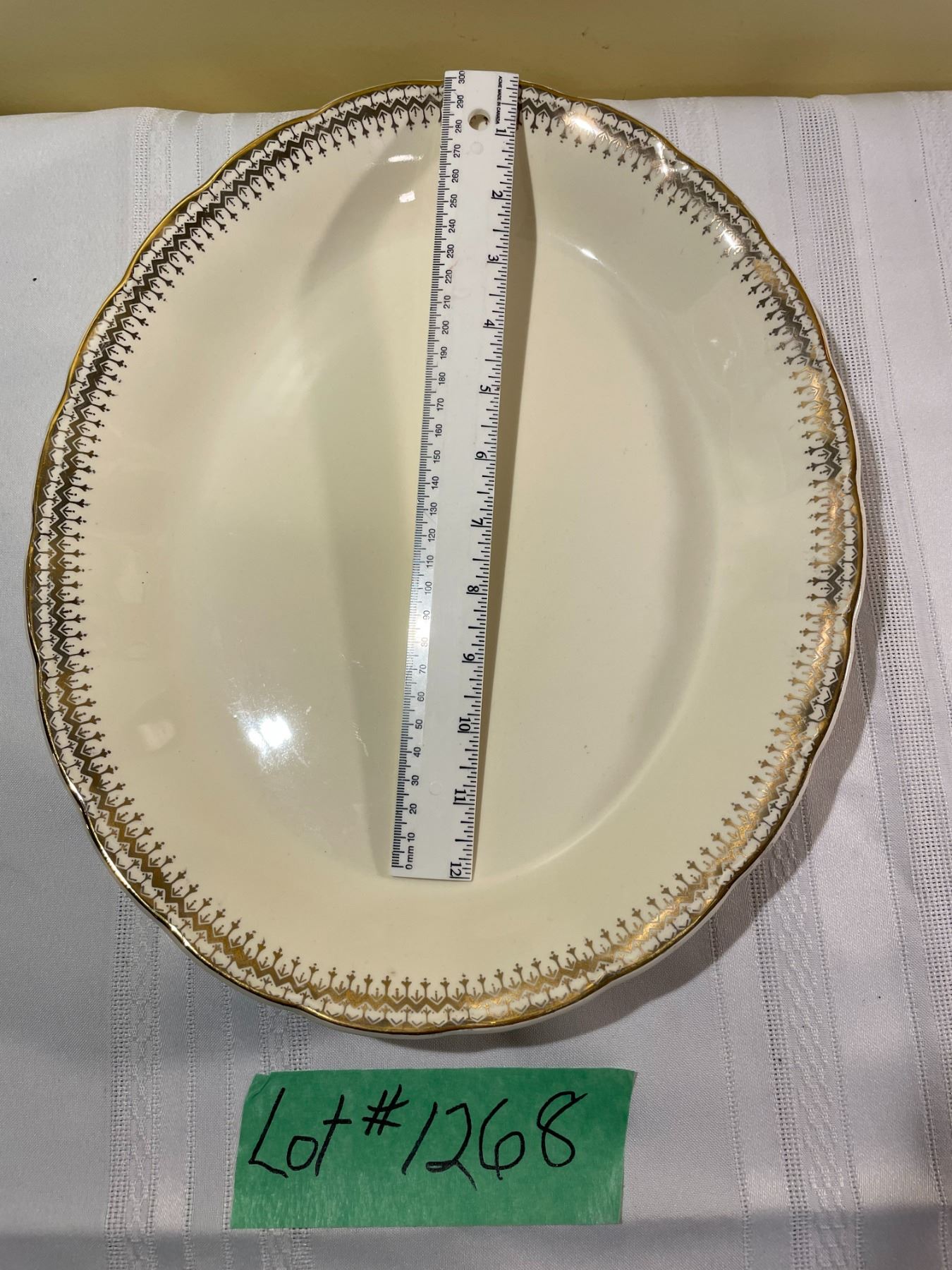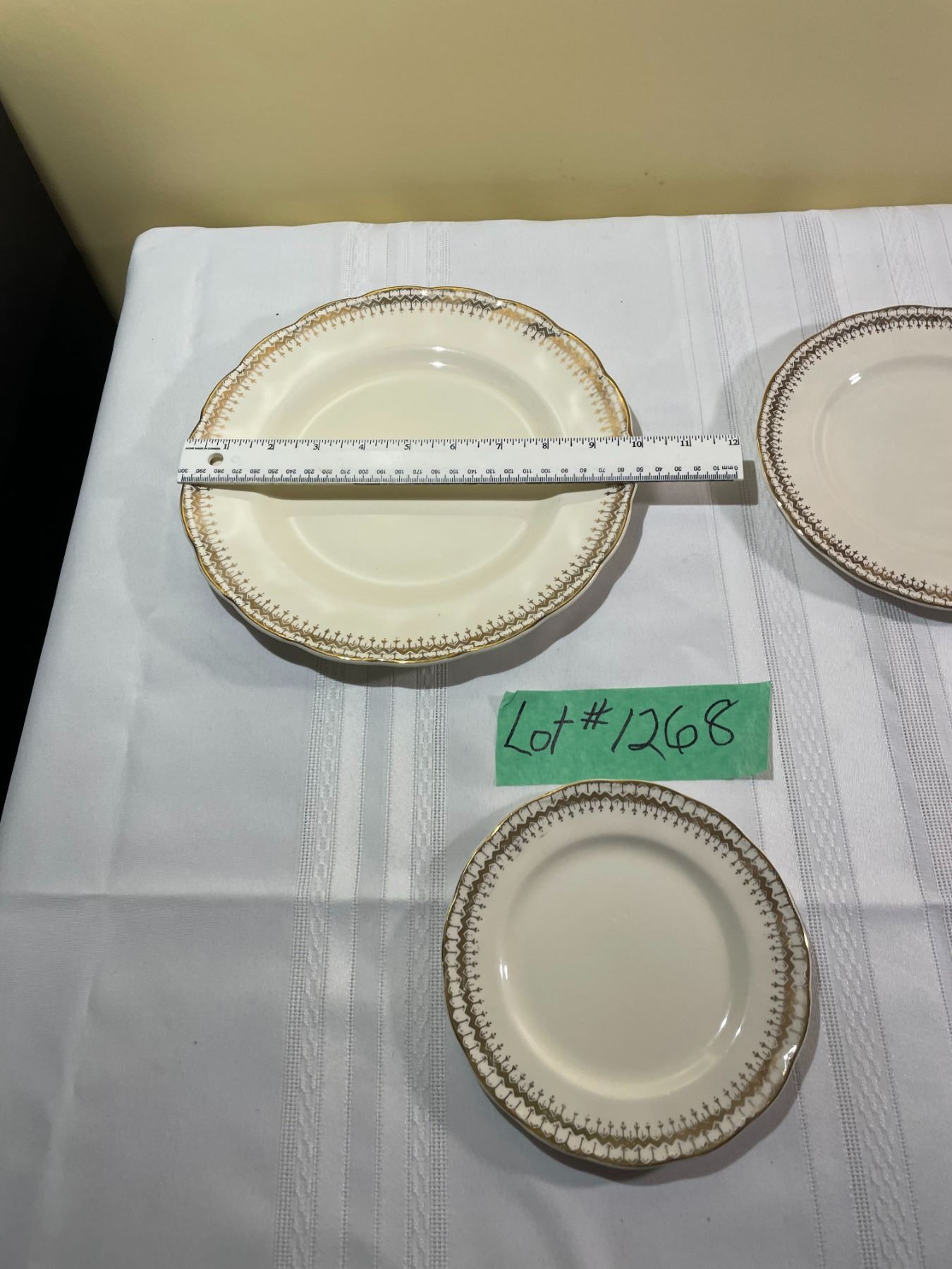 Fragile have 61 pieces of 65 piece set Heavy Box B Pattern: Cream Petal Design from Grindley England (a wedding gift from the families of Bride + Groom on July 9 1946) (1) Large Platter - 14" long (1) Platter - 11" (1) Platter - 8"(1) Small deep bowl Ellongated 8" (1) Gravy Bowl - 8" long (1) Deep dish bowl 9" by 2 1/2" deep with lid (1) sugar bowl with lid (1) Cream bowl (7) 5' diamter soup bowls (7) 8" Diameter soup bowls (8) 10" Diameter plates (dinner size) (8) 10" Diameter plates (dinner size) (8) 7 3/4 Diamter plates (8) 6 diameter saucer (6) tea cups (8) tea cup saucers