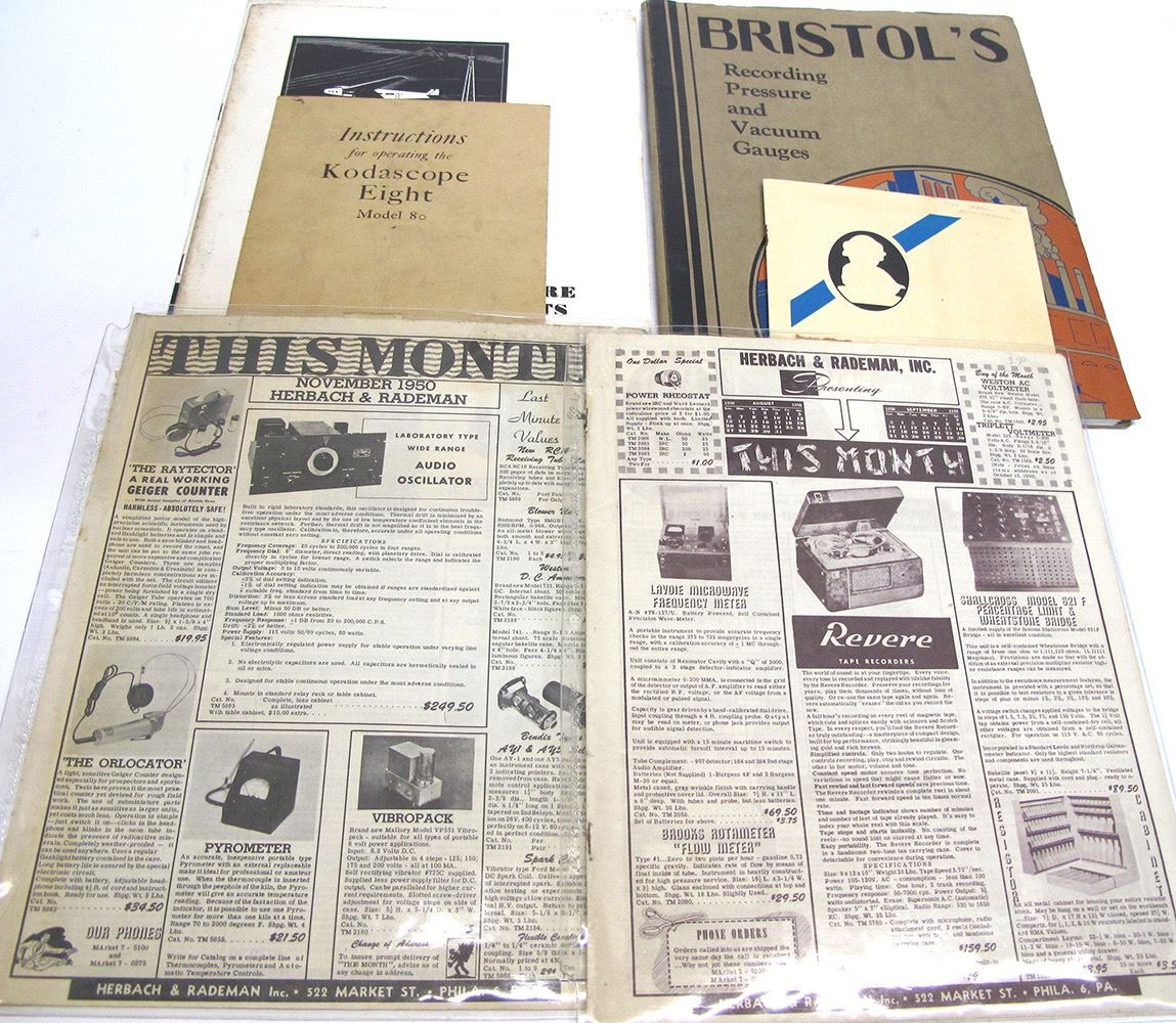 Bristol's Recording Pressure and Vacuum Gauges, Herbach & Rademan August and November 1950 catalogs, Hall & McCreary 1930 School Books catalog, Western Electric Lapel Microphone 1932, Western Union/Victor entertainers poster, GE miniature Instruments 1931, Instructions for operating the Kodadscope Eight. Date: Location: HWAC # 54176