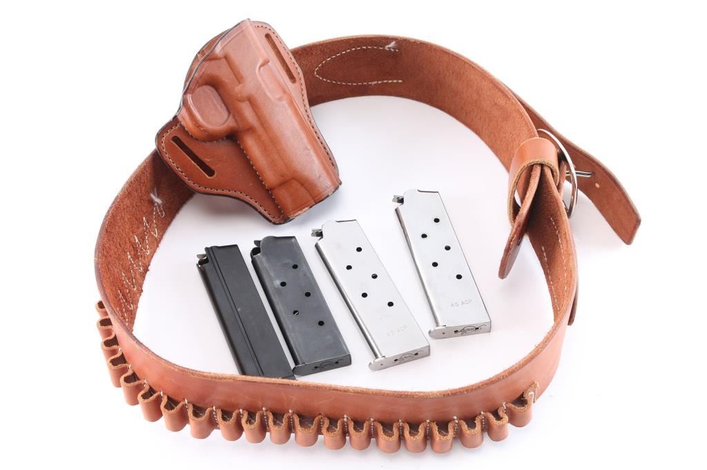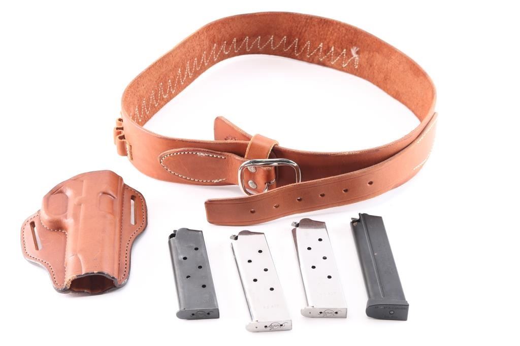 Includes: 3 - Kimber .45 ACP 7rd magazines (2 stainless and 1 blued w/black plastic base pads); 1 - Springfield EMP 9mm 10rd blued steel magazine; 1 - Bianchi Model 57, brown leather holster for Colt Commander and 1 - 'JY' Saddlery SAA pistol belt, no holster, waist size 30". All in good condition.