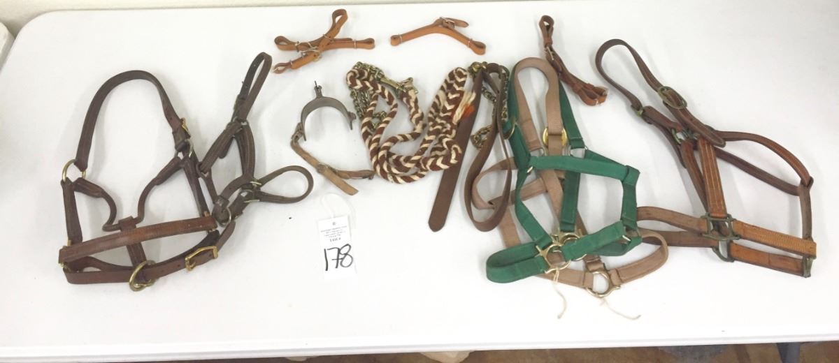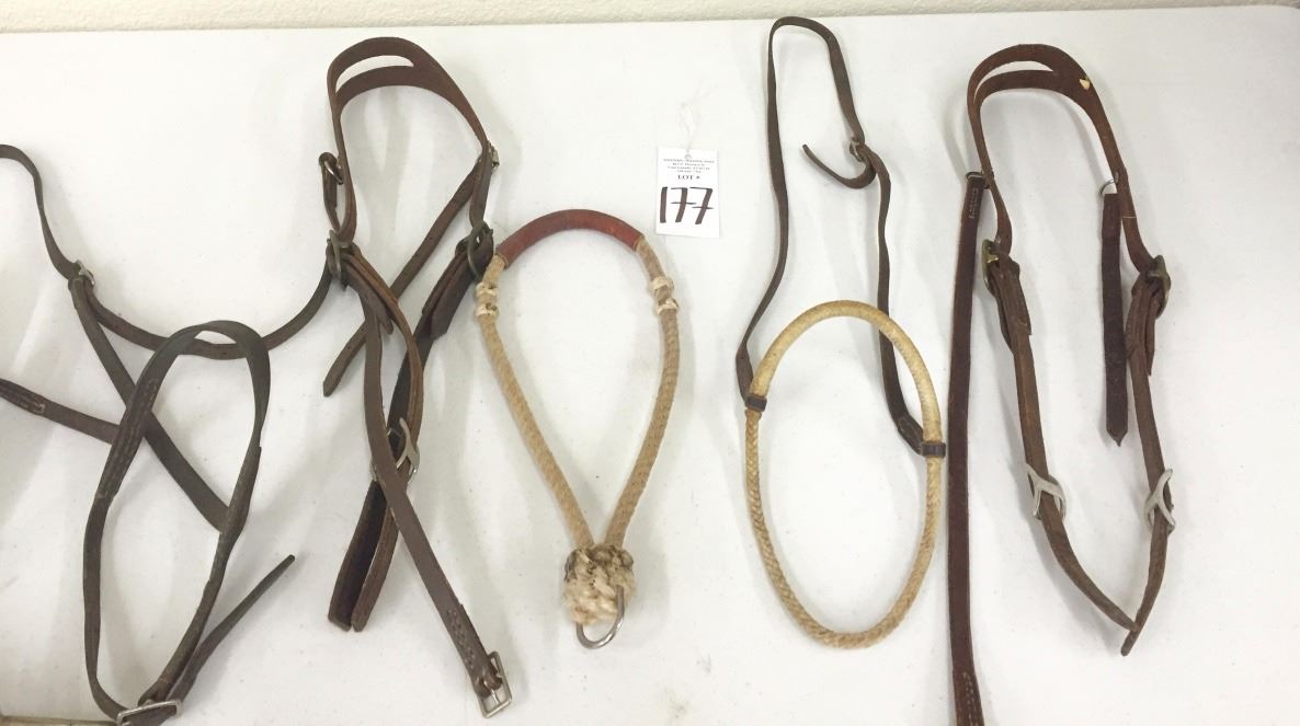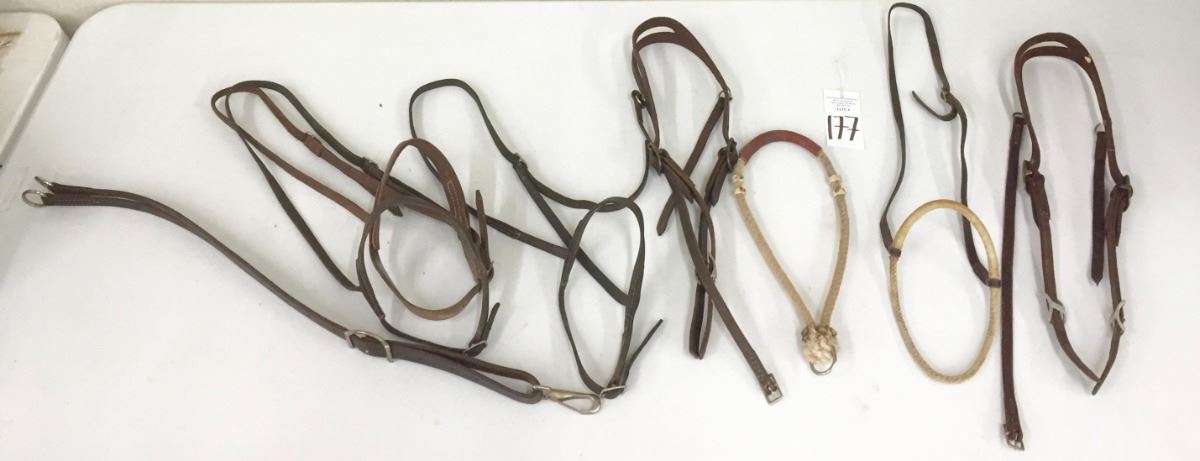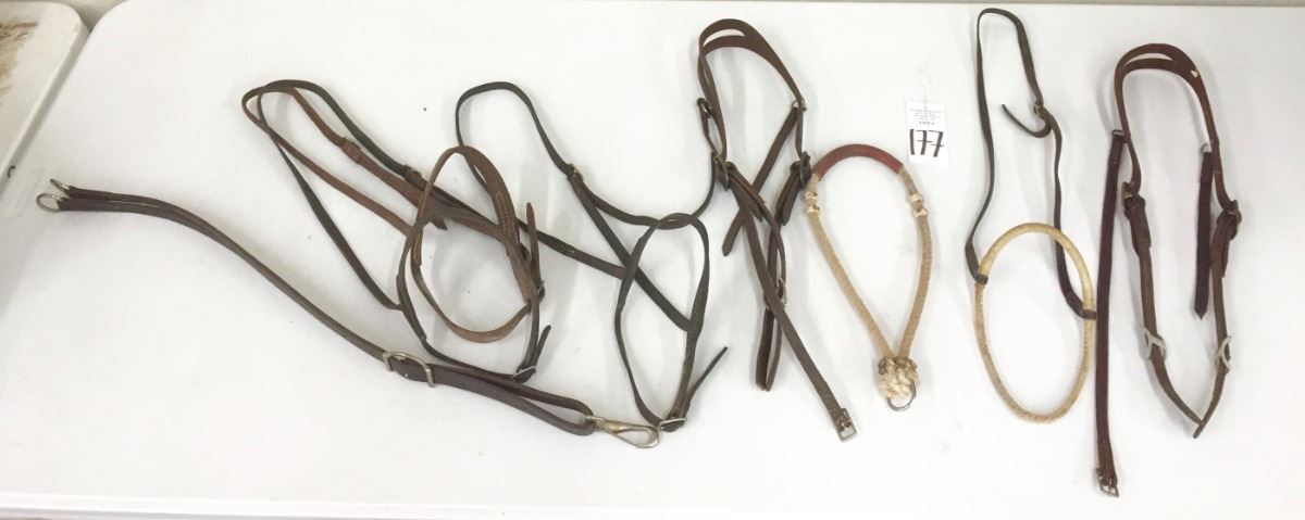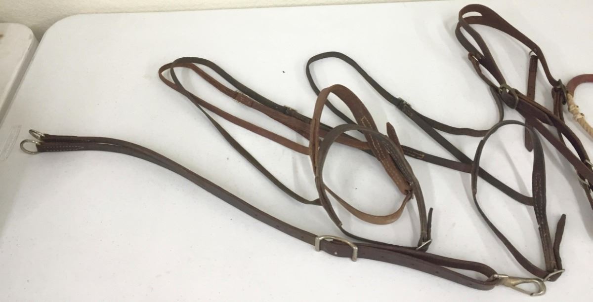 There are four “mouth shutters,” two headstalls, a running martingale and a tie down noseband. Please look closely at pics - they are an important part of our description. Shipping: There will be a $7 handling / packaging fee for shipping this lot. The actual cost of postage will be added on top of that.
