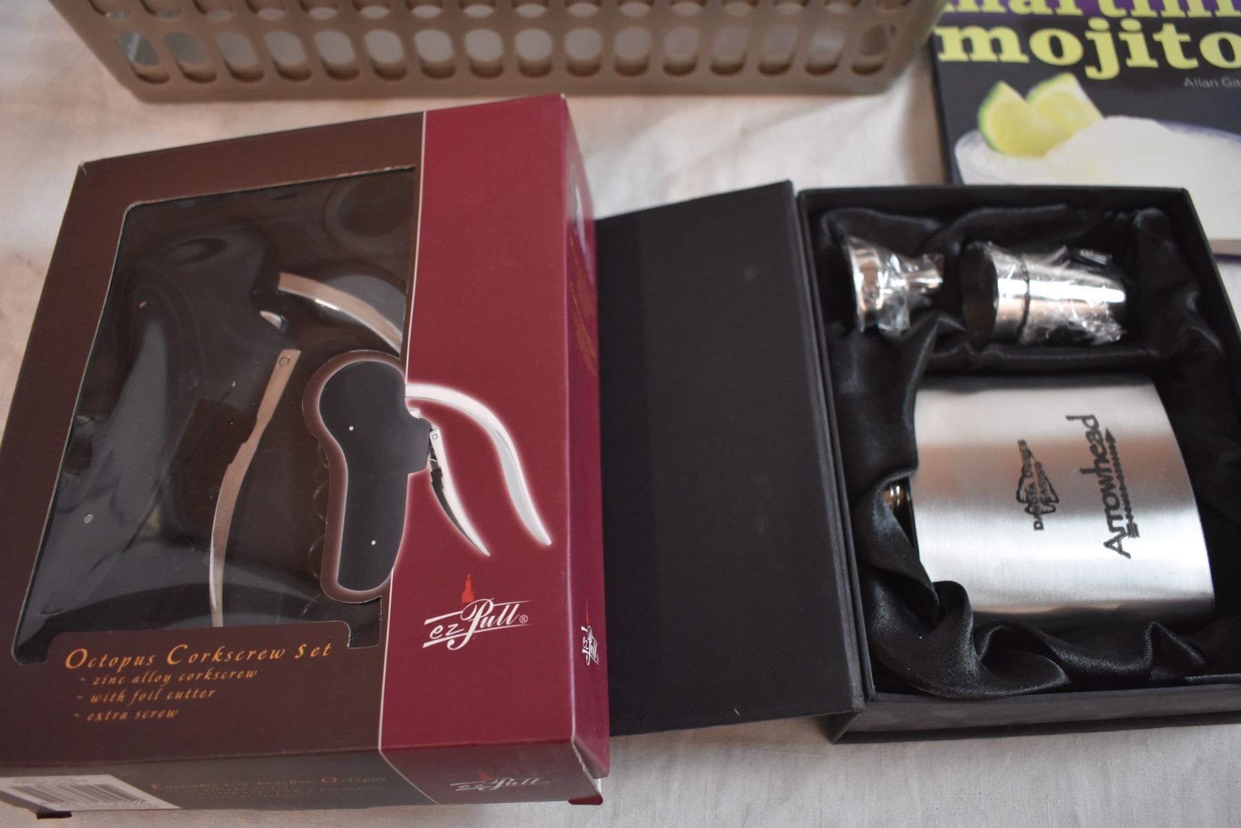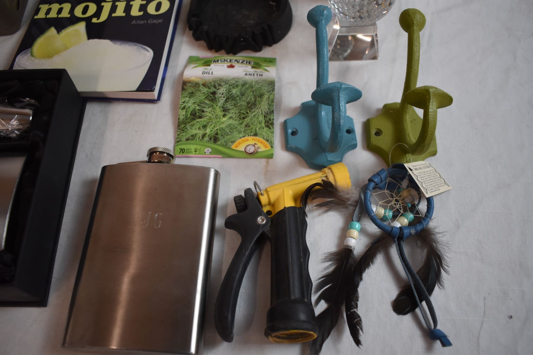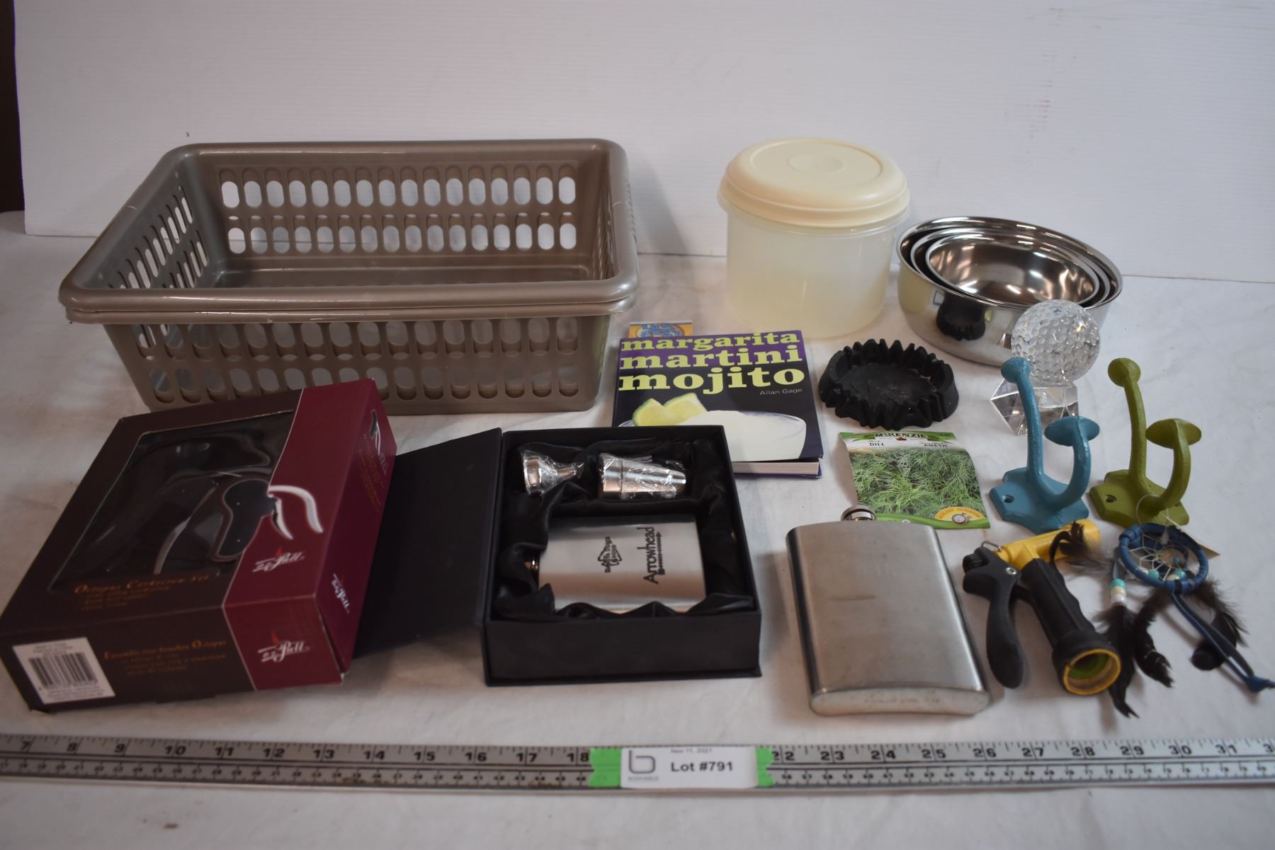 Misc Household Items with (2) Organizer Bins, cast iron hooks, corkscrew