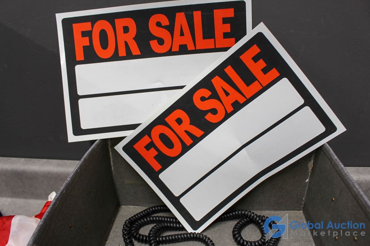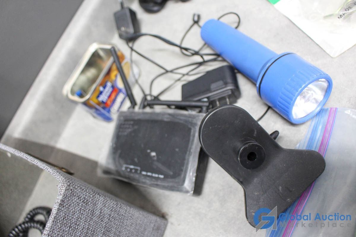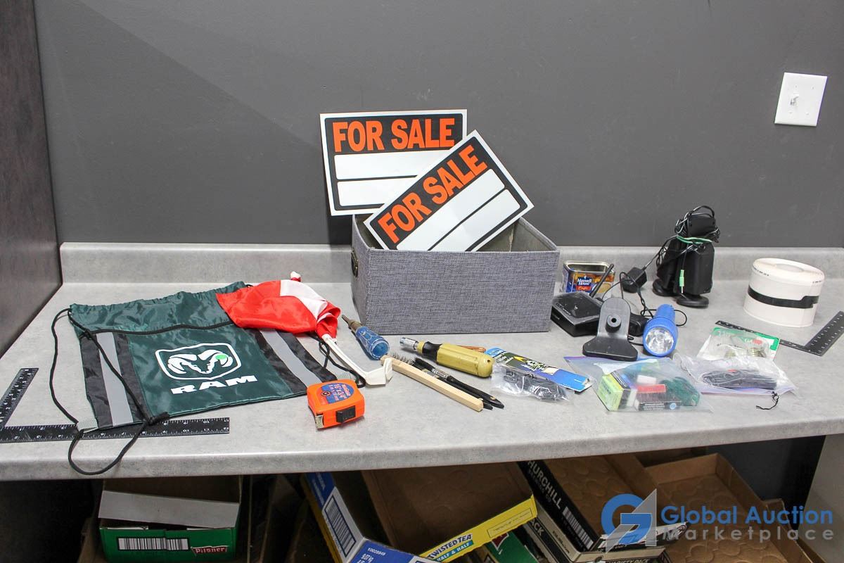 For Sale signs, flashlights, misc electronics.