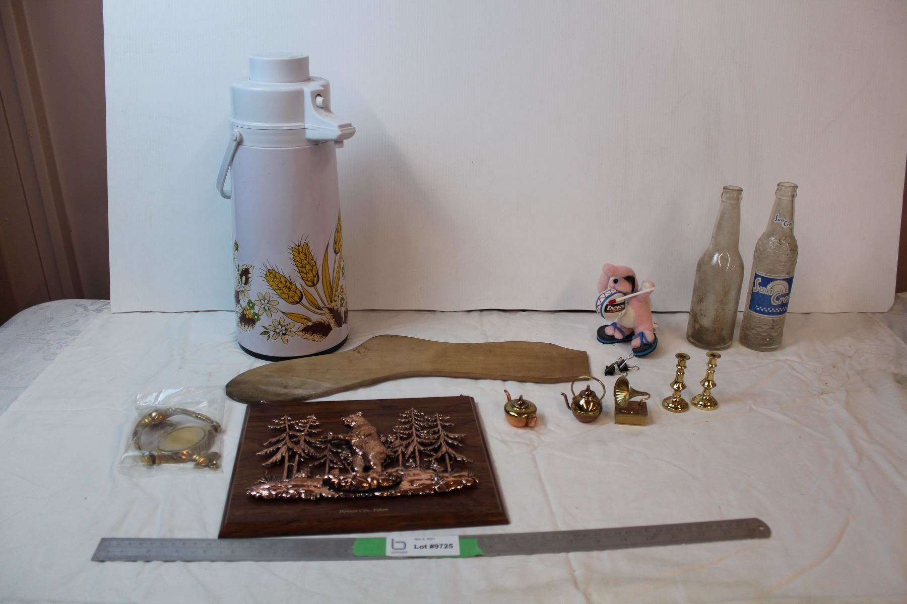 Misc. Items; Door knocker, vintage bottles, Water cooler