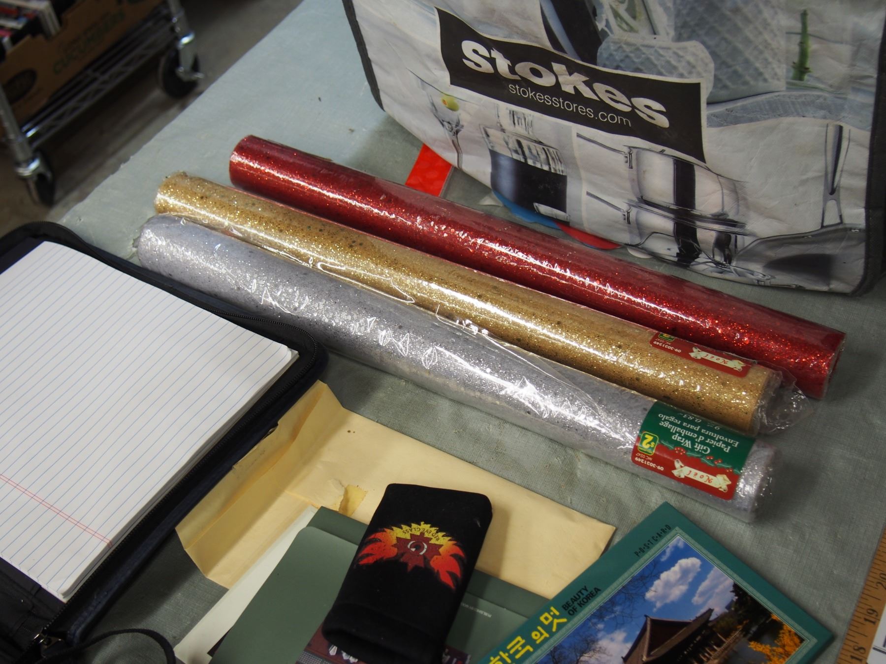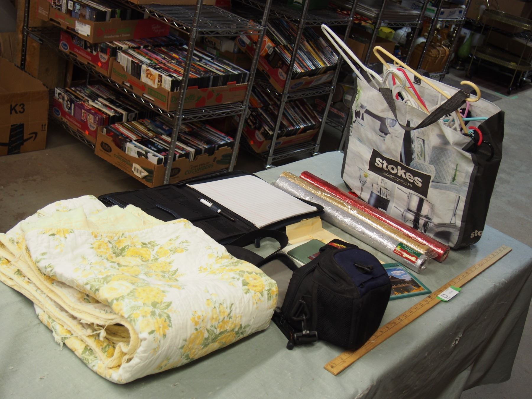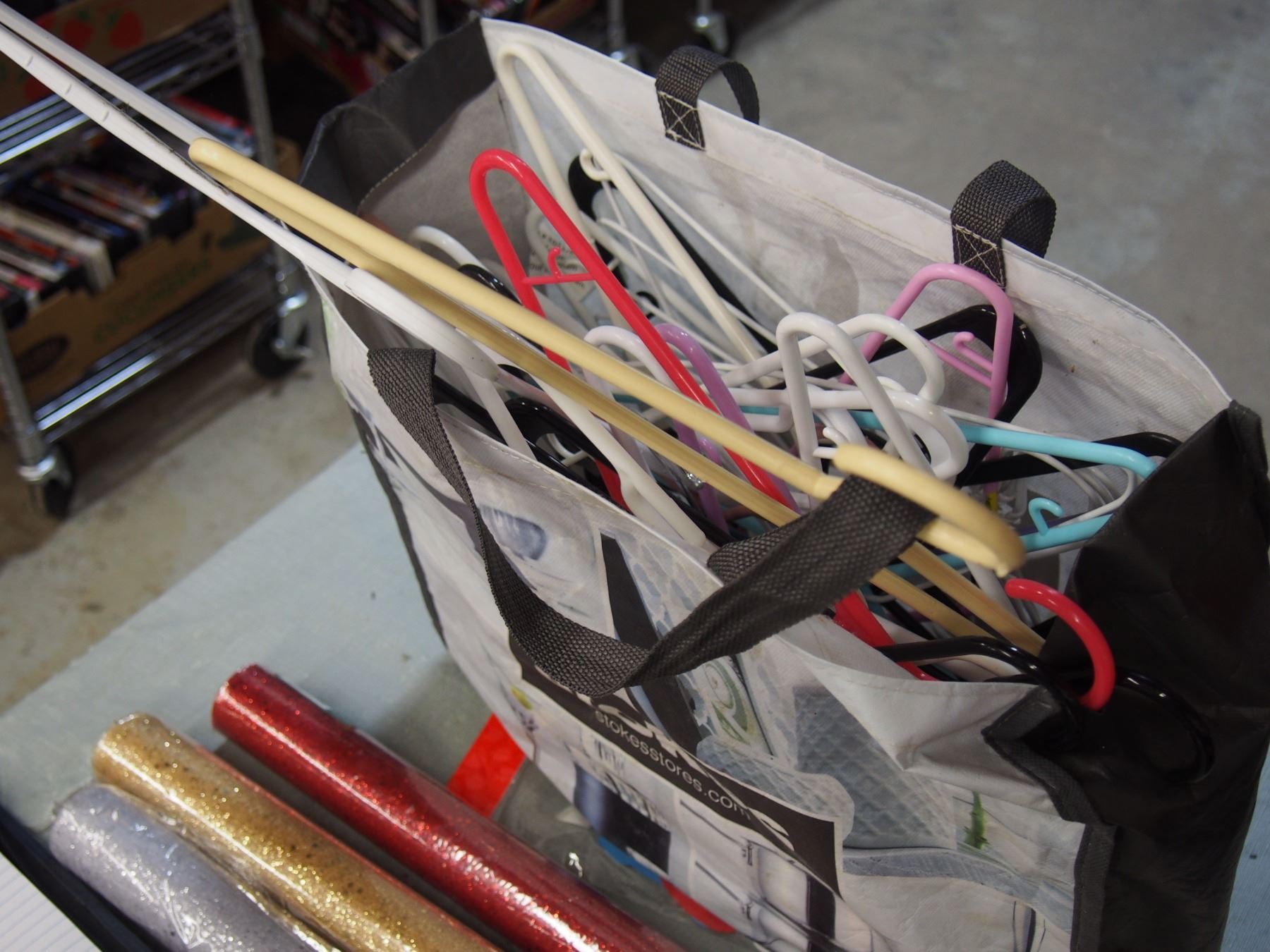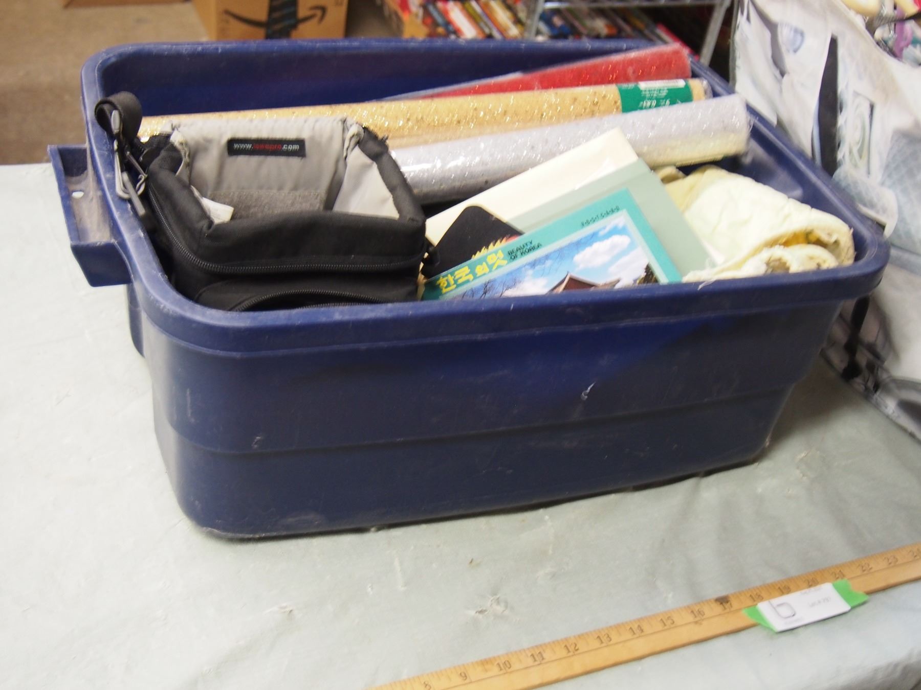Misc Items, Gift Wrap, Clothes Hangers, Notebook, Blanket etc with Plastic Tote