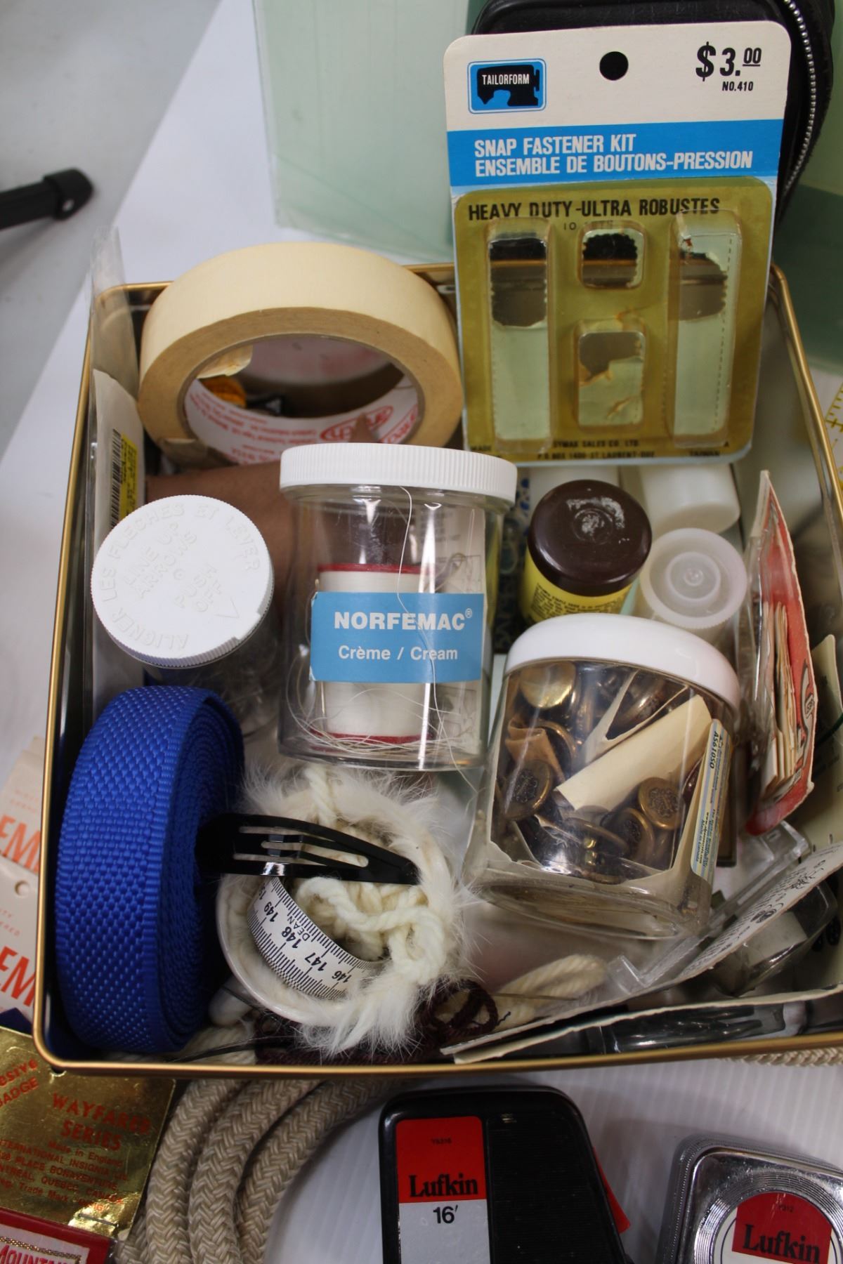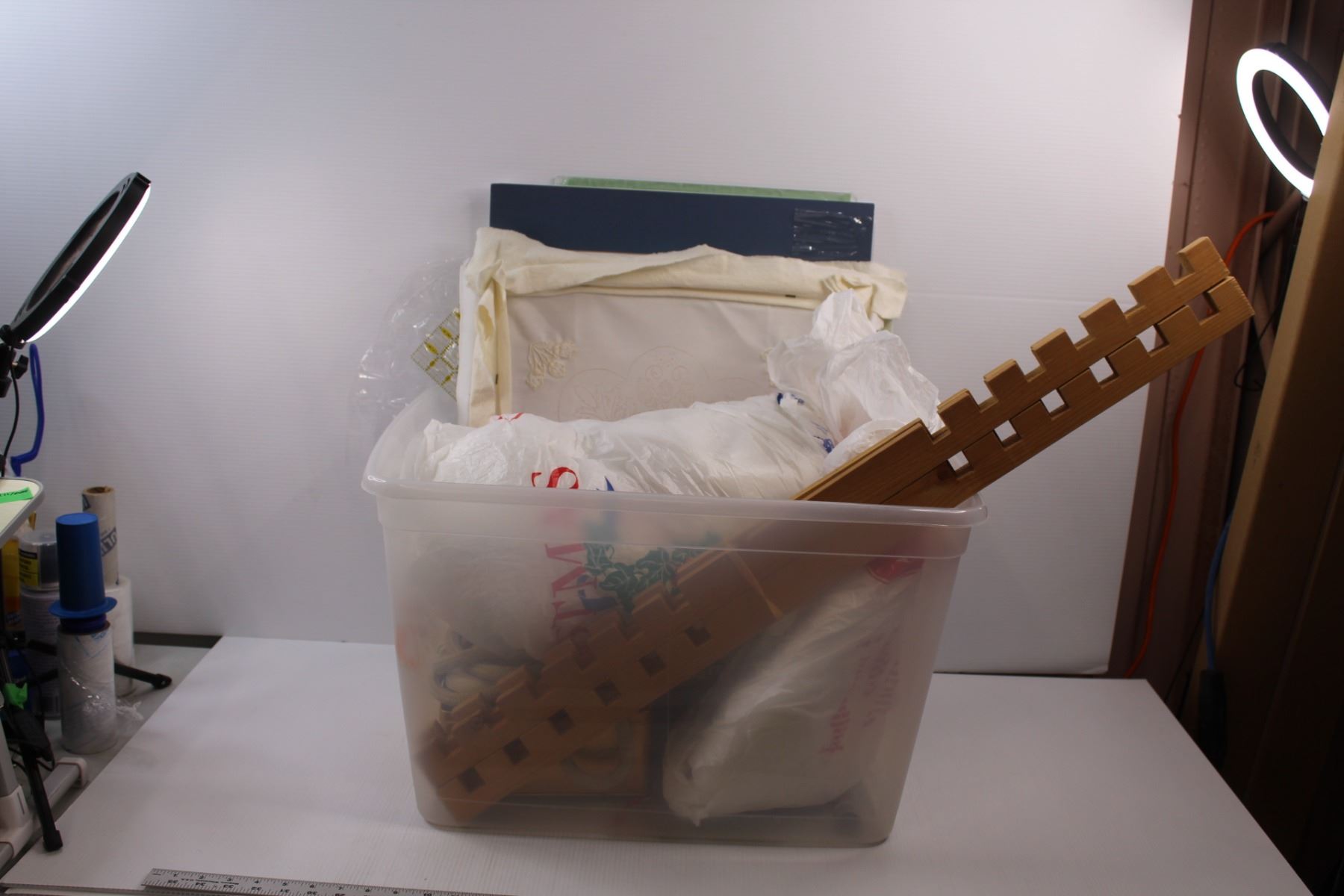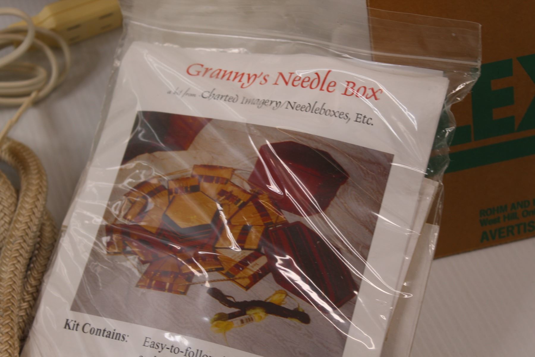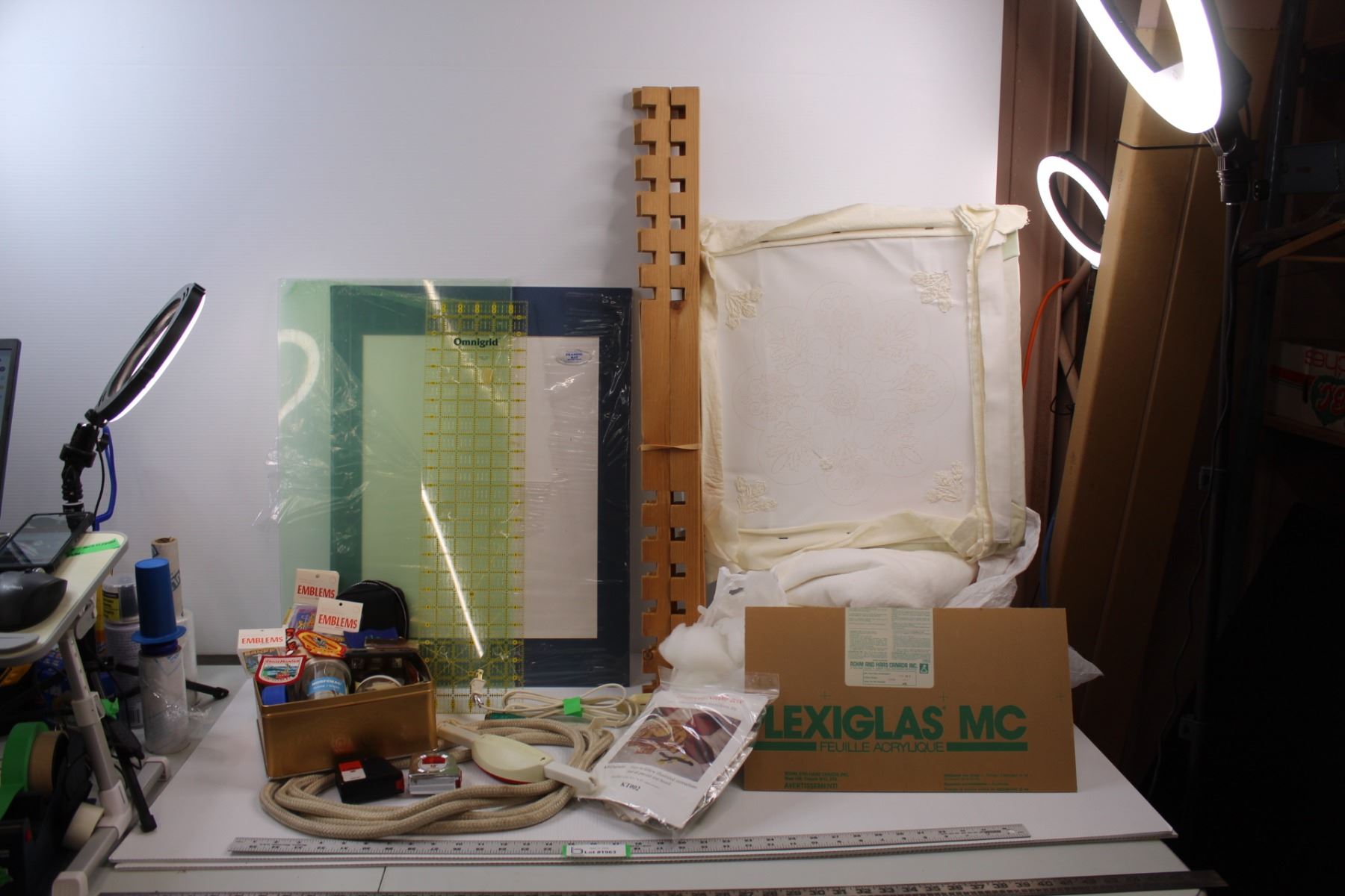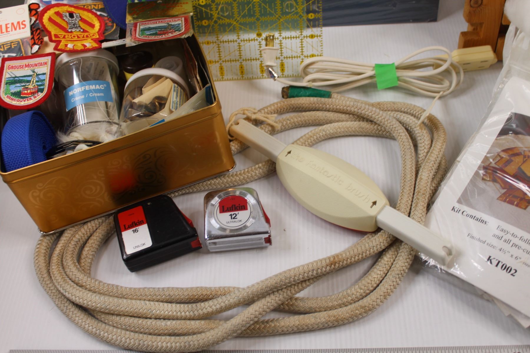 *Misc. Items - PlexiGlass Pieces, Omnigrid, Framing Mat, Notched Wooden Gig, Needle Point w/Frame, Nylon Rope, Indoor Extension Cord, (2) Lufkin Tape Measures 16' and 12', The Fantastic Brush Lint Brush, Tin of Sewing Supplies etc. Includes Large Tote w/o Lid