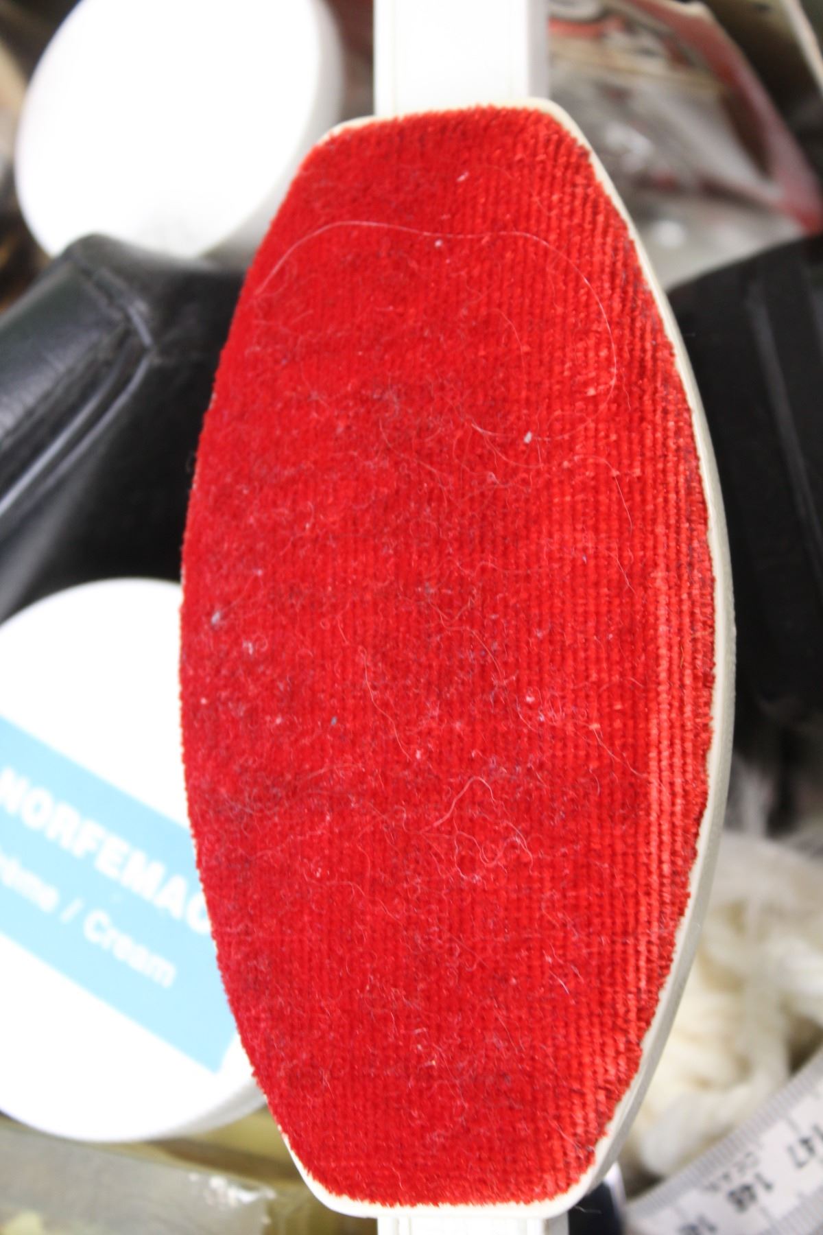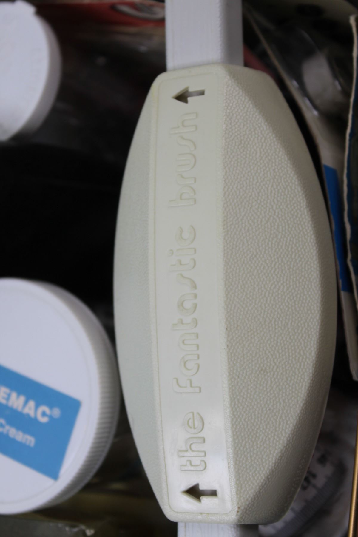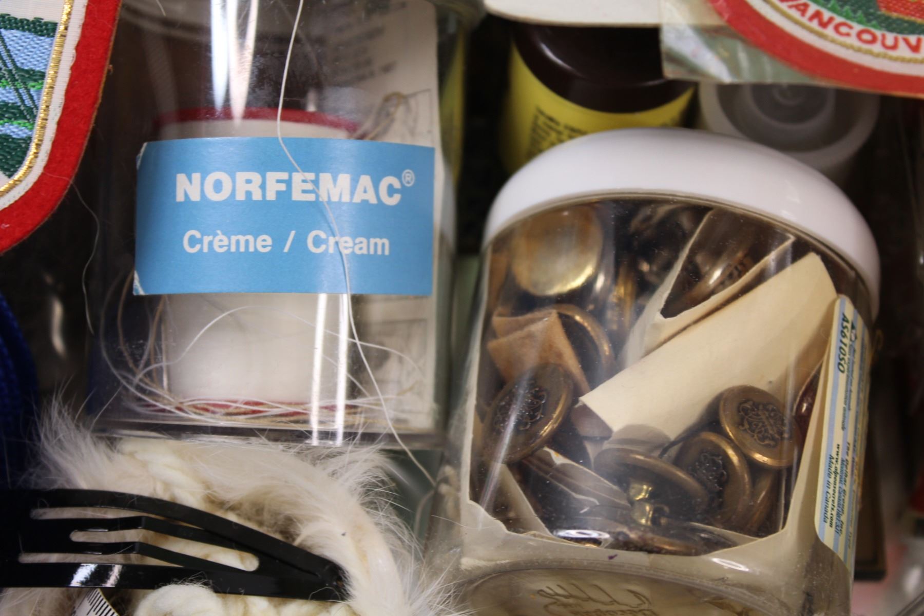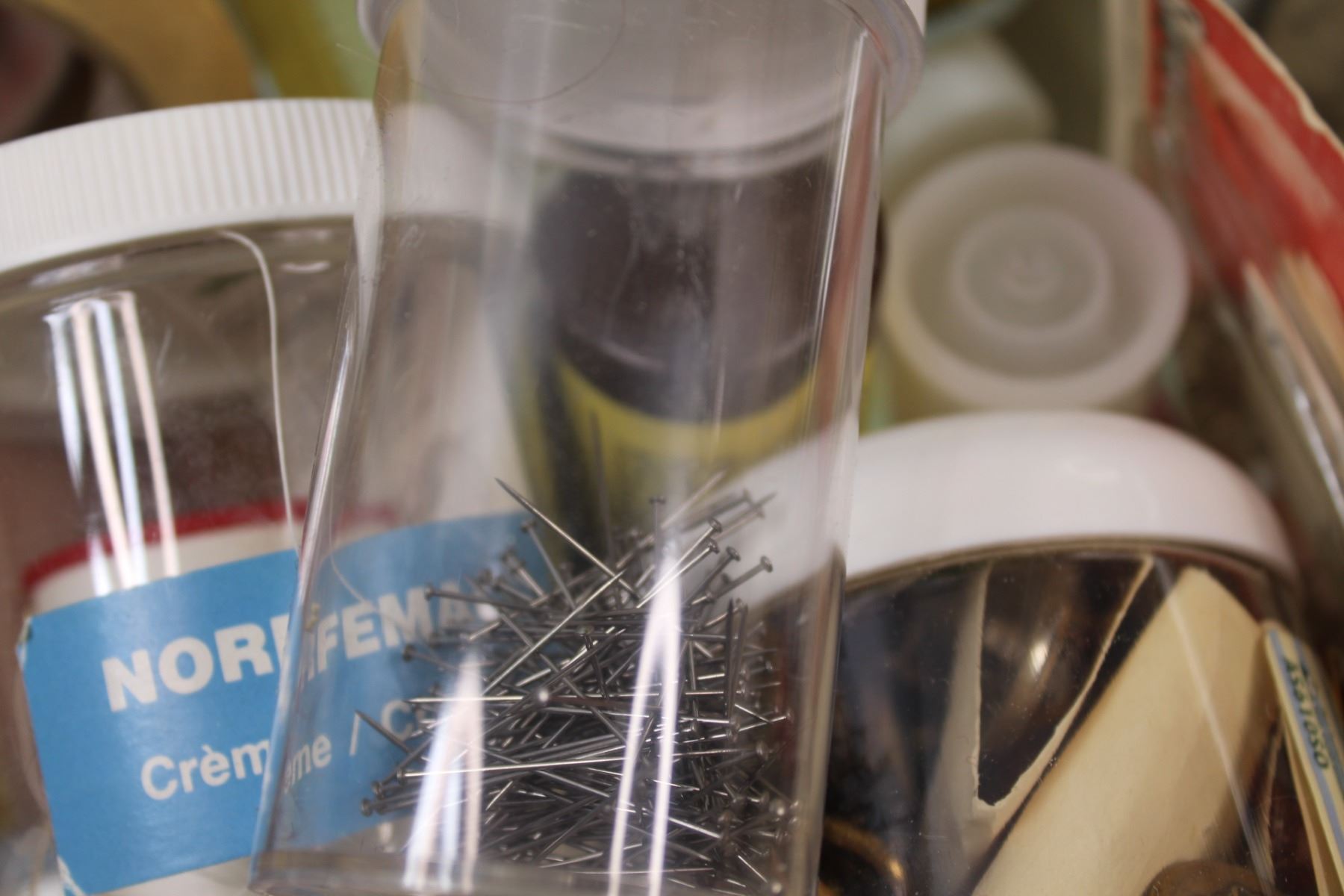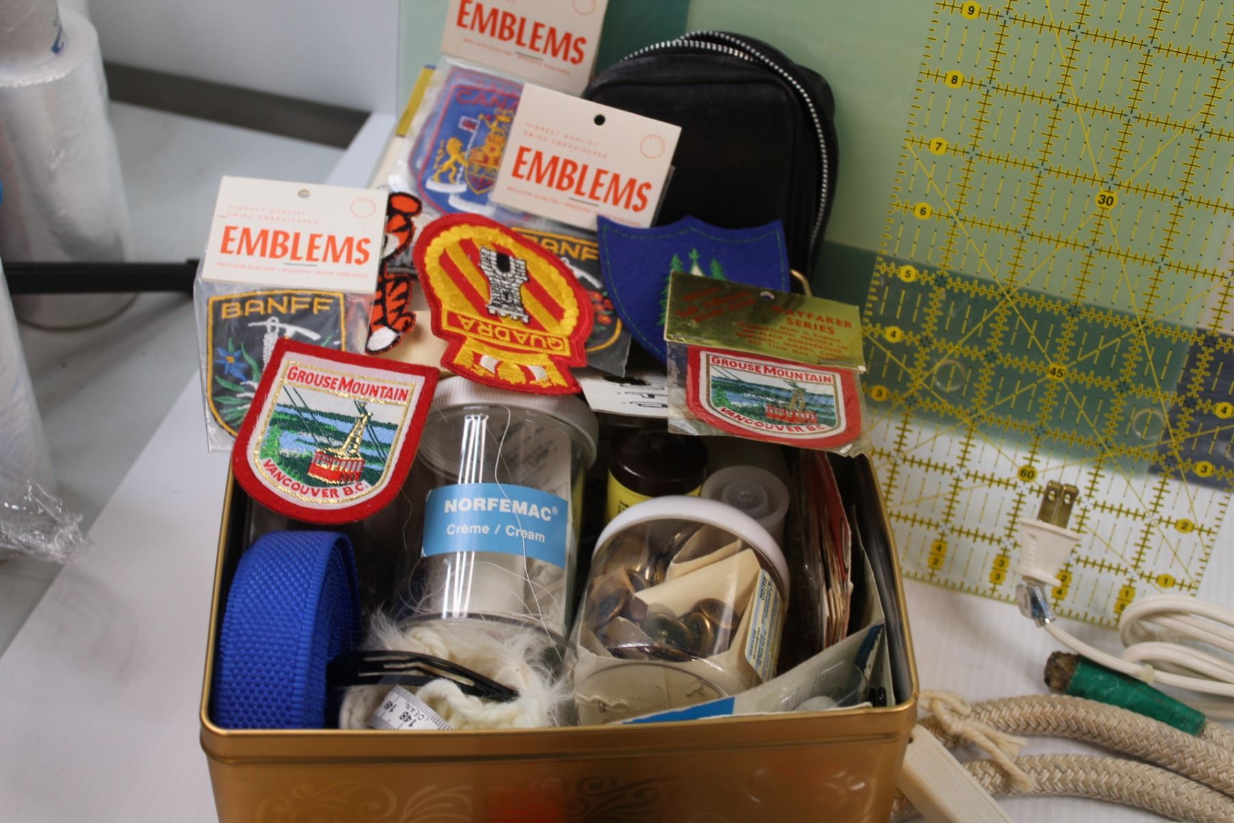 *Misc. Items - PlexiGlass Pieces, Omnigrid, Framing Mat, Notched Wooden Gig, Needle Point w/Frame, Nylon Rope, Indoor Extension Cord, (2) Lufkin Tape Measures 16' and 12', The Fantastic Brush Lint Brush, Tin of Sewing Supplies etc. Includes Large Tote w/o Lid