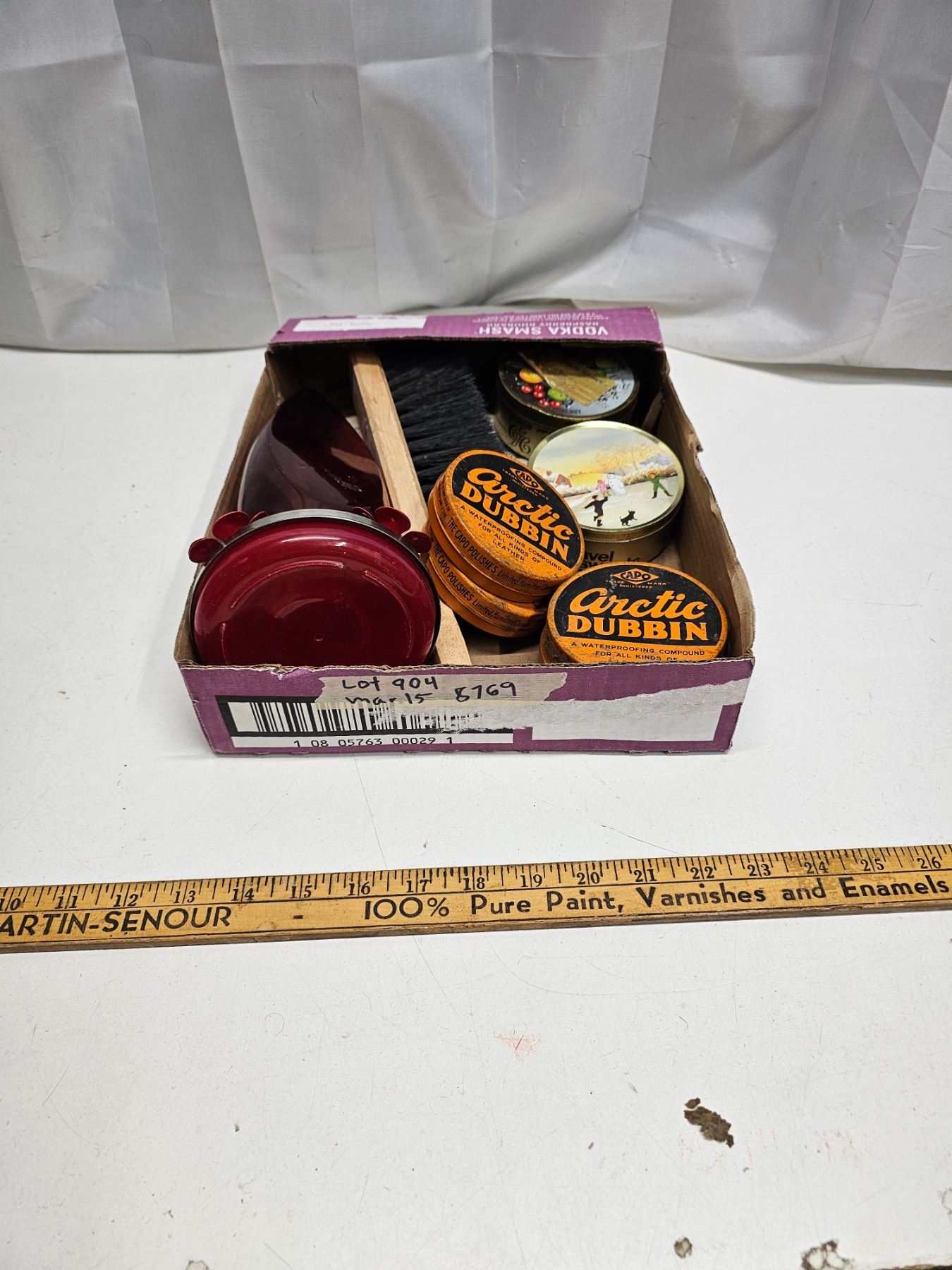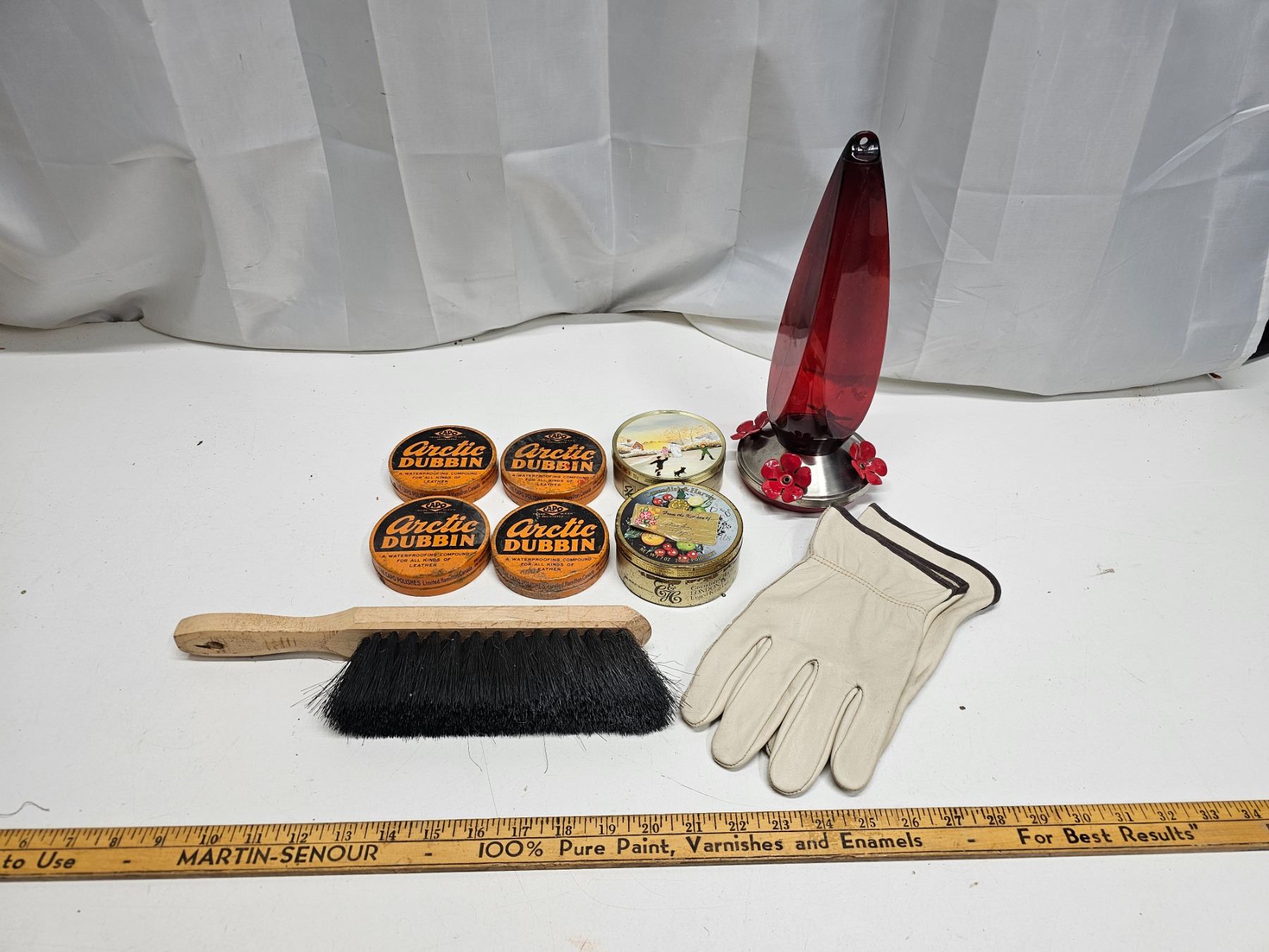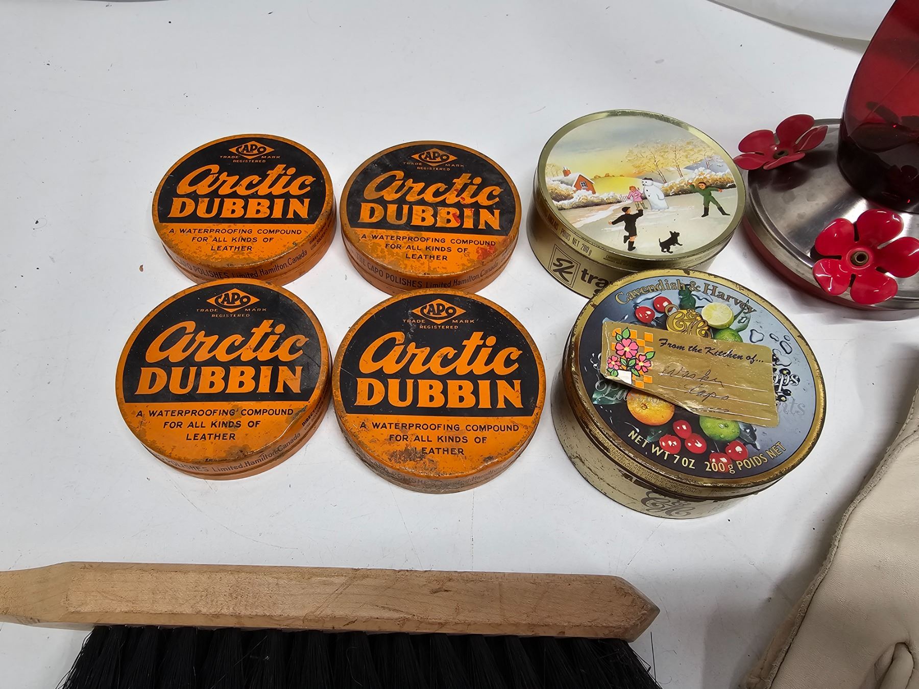 4x CAPO Artic Dubbin Waterproofer Compound, hummingbird feeder, brush, pair of gloves, 2x metal candy tins.