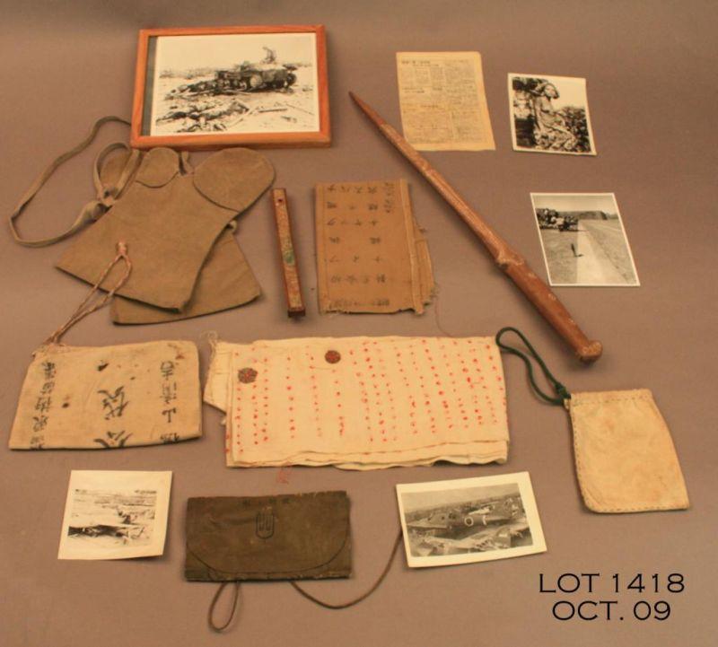 Misc. Japanese WWII lot - 1000 stitch belt, dirty  bag, prayer item, gloves, photos, envelope, Jap.  toe tag & chopsticks.  Est. $200 - $400