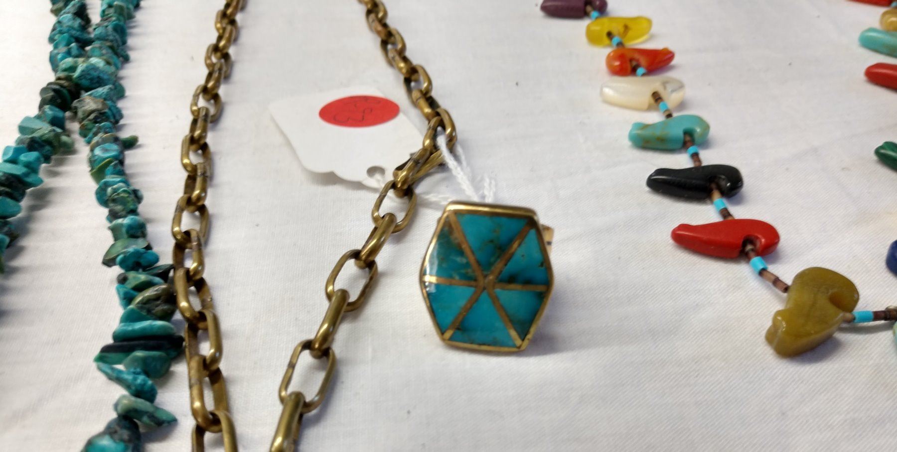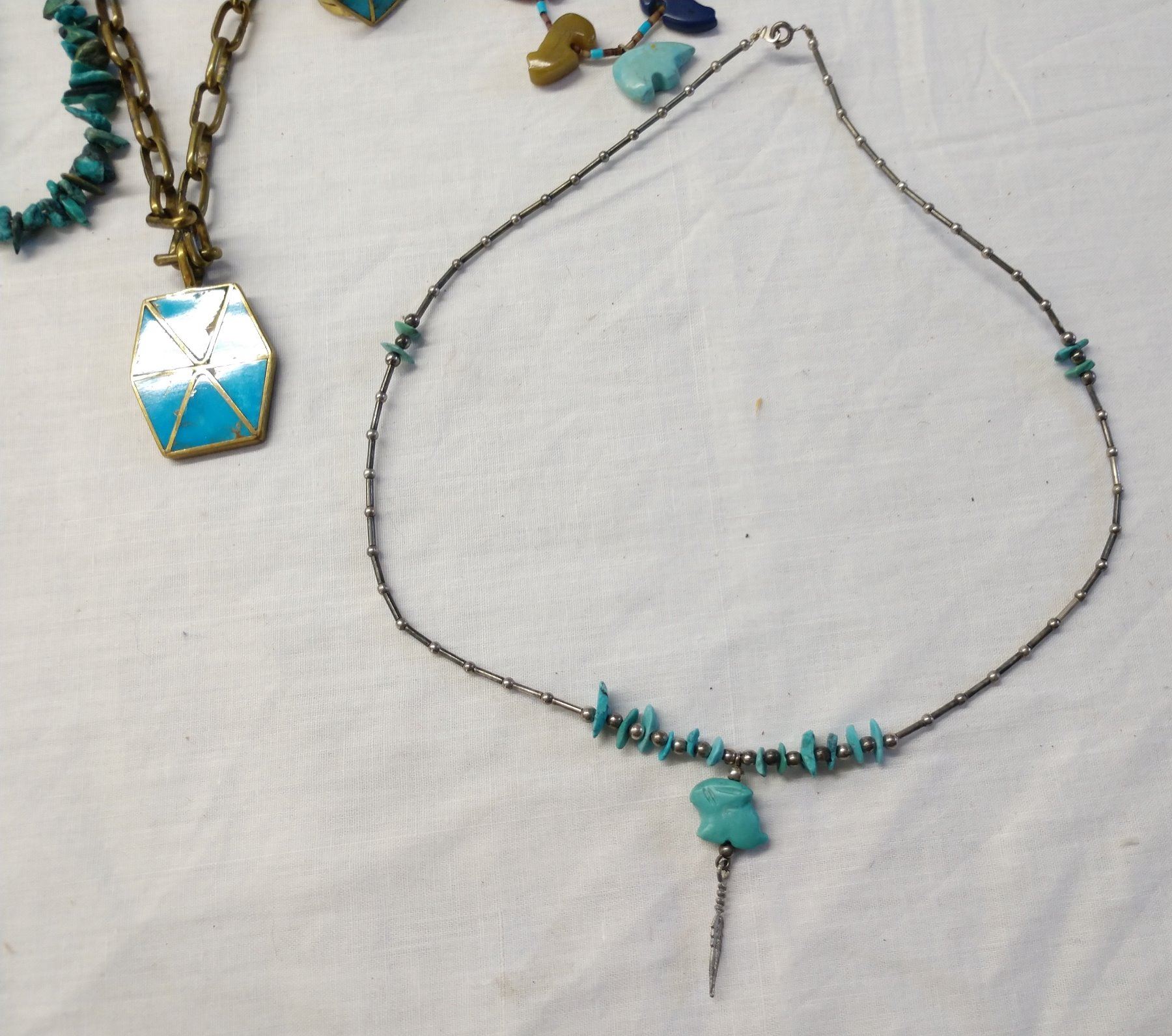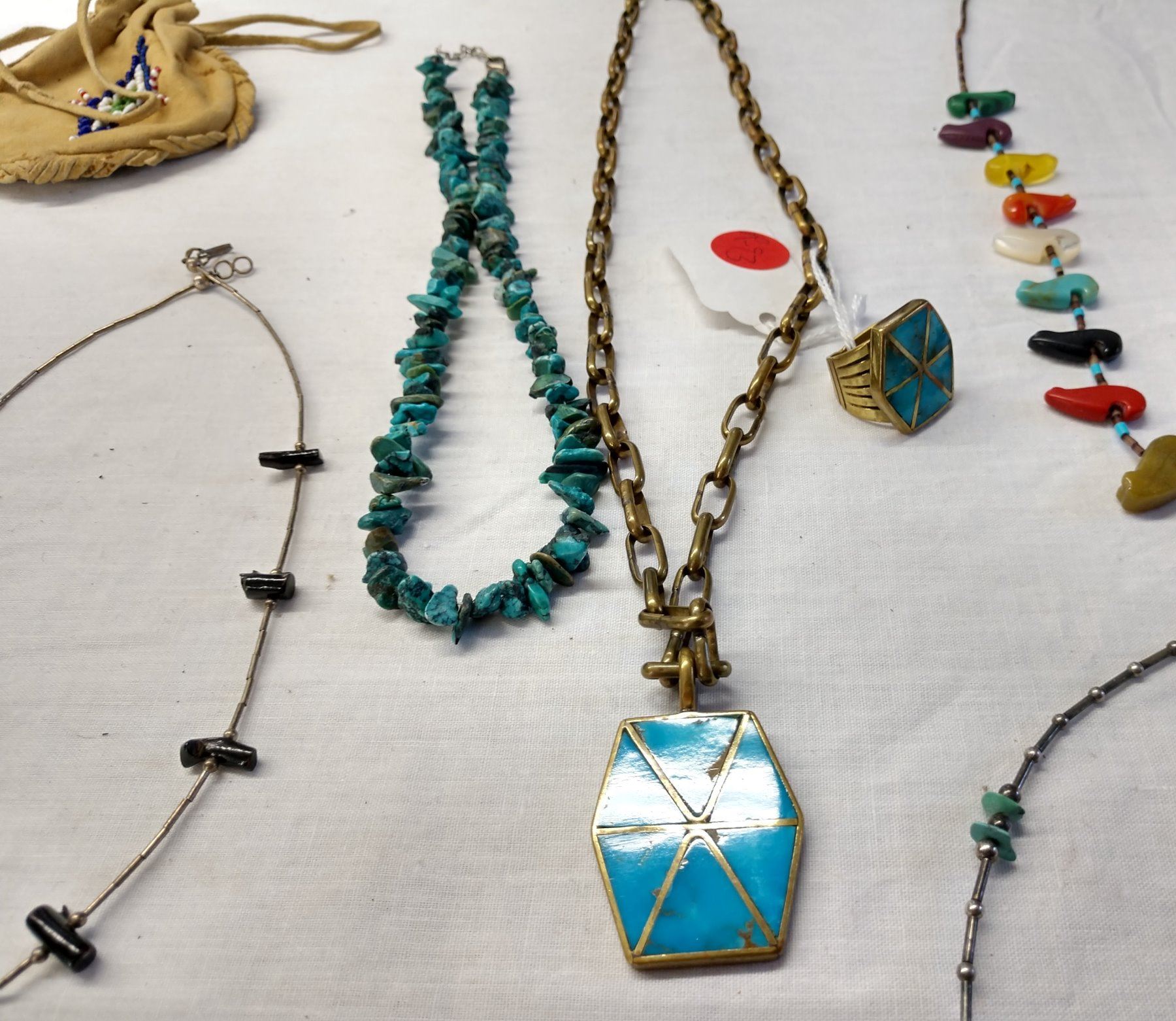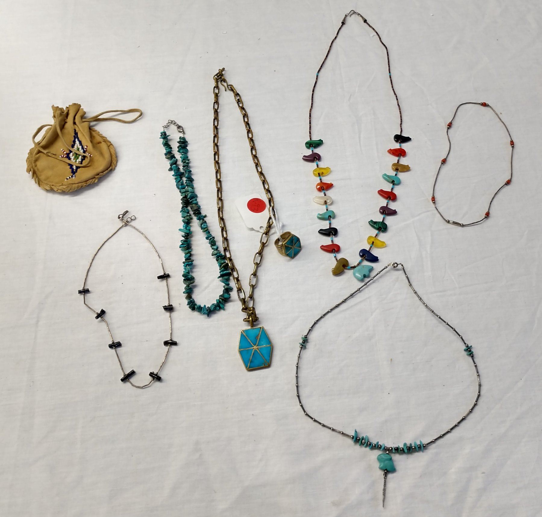 Misc Jewelry Lot, c. 1930s and later. Made of silver, turquoise, coral, etc. The longest necklace is 24". Southwest USA. included is a vintage beaded deerskin bag. Condition: Worn but nice, see images. Shipping: $15.50 w/insurance and signature.
