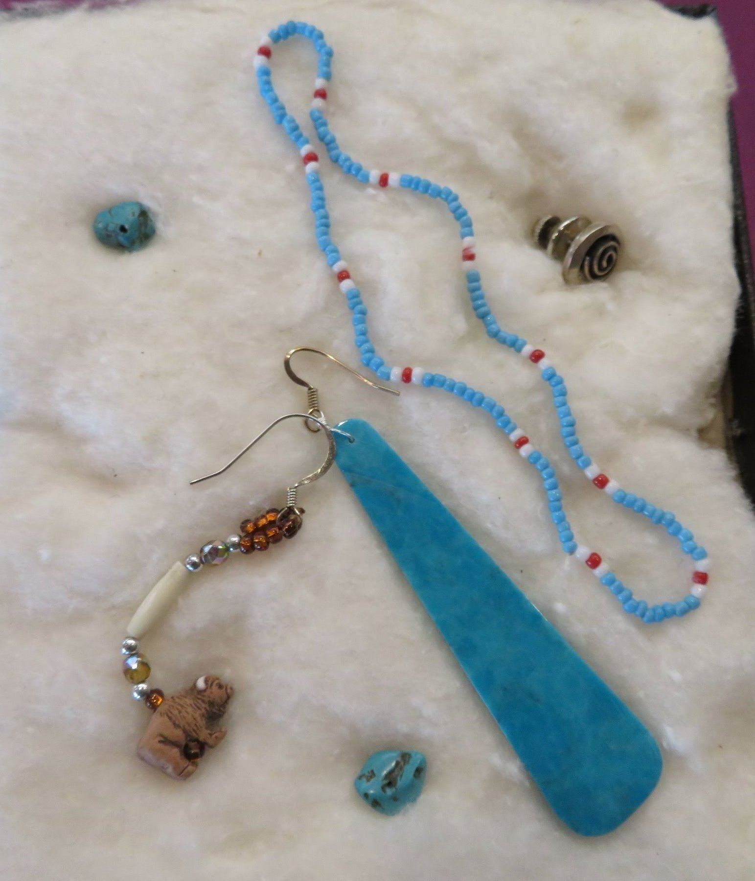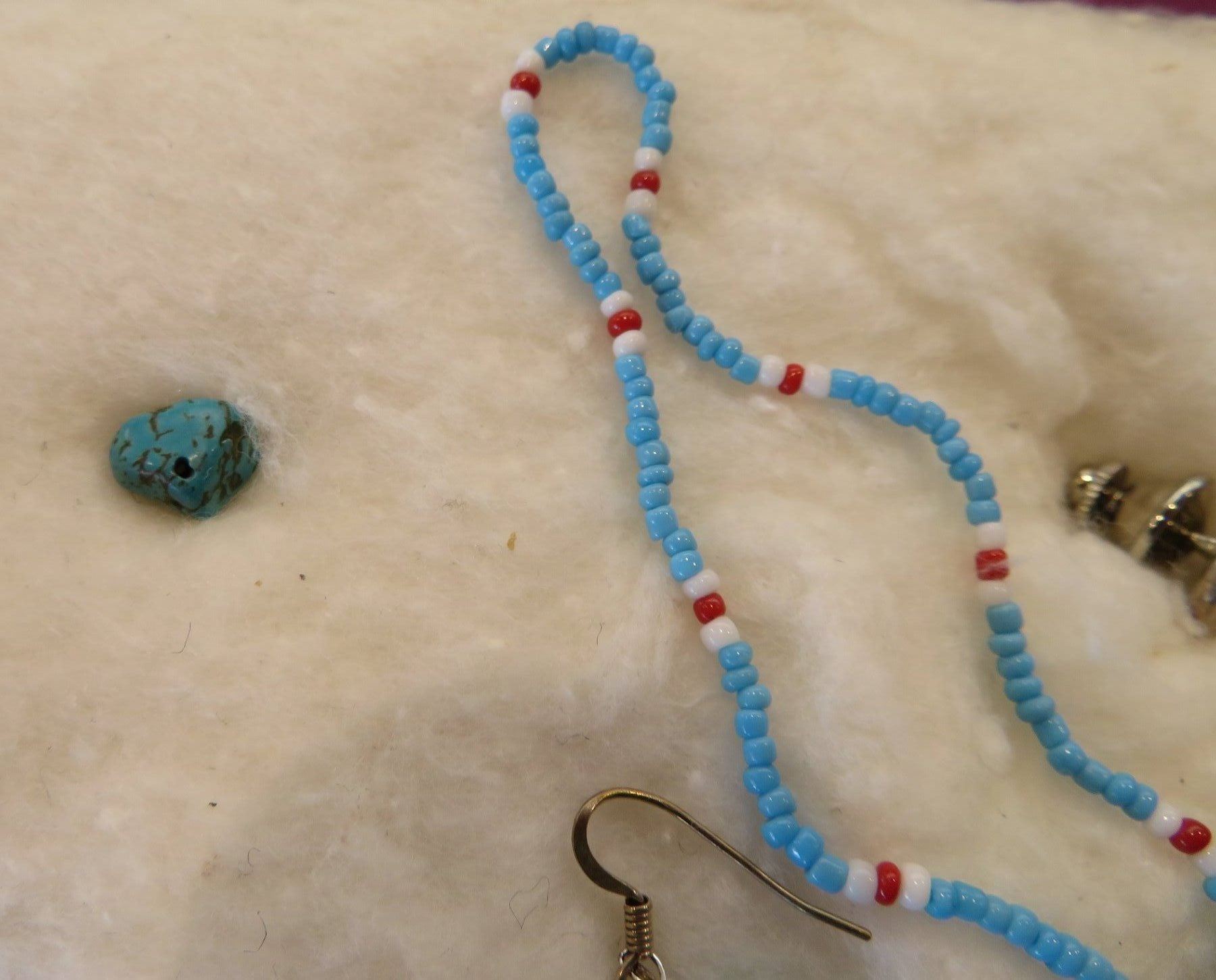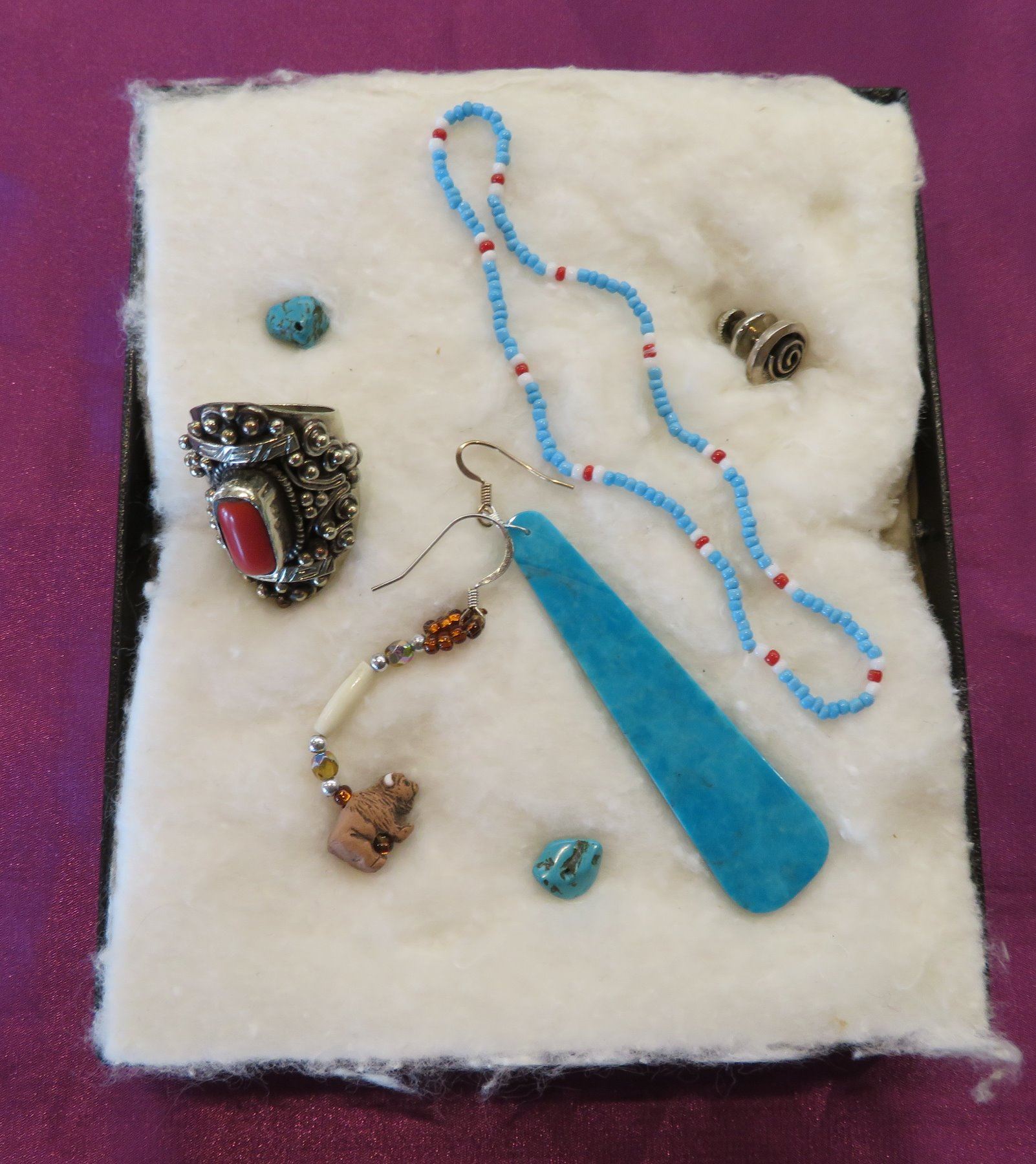 Misc Jewelry Lot, 20th century items. Made of sterling silver and coral, turquoise and glass beads, the ring is size 8 1/2 and measures 1" x 1 1/2"x 1 1/4" overall. The other items measure from 3/8" to 5" long. Southwest USA. Condition: Good, see images. Shipping: $14.50 w/insurance and signature.