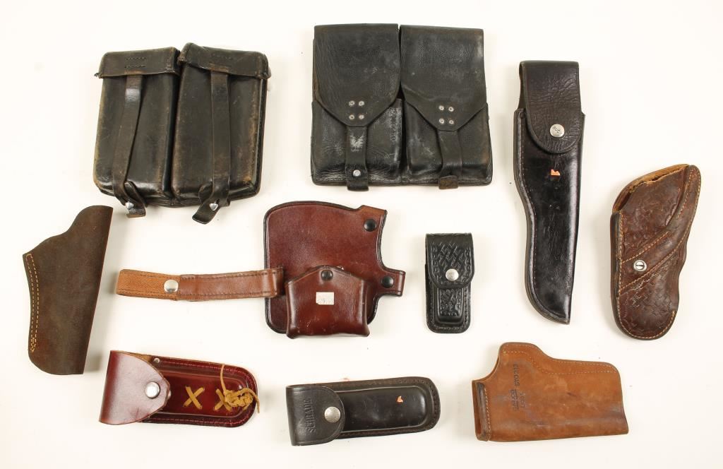 Including; a buck knife sheath a trade knife sheath, 2 misc leather knife holders, Buchmeier, Marshall holster, 2 black leather mag holders and other misc. items.