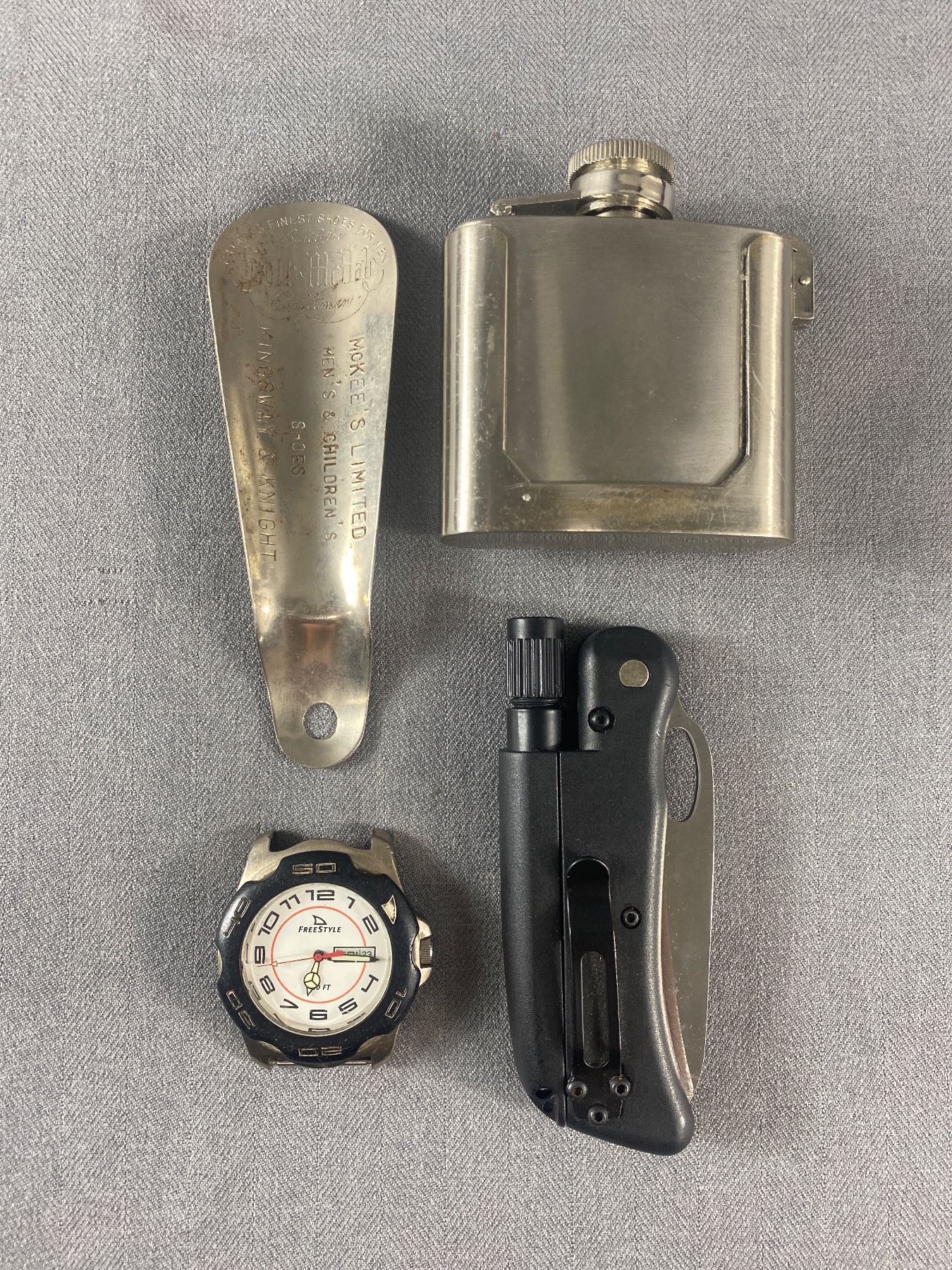 Misc Lot - Mini Flask, Light-up Pocket Knife, Shoe Horn & Bandless Freestyle Watch